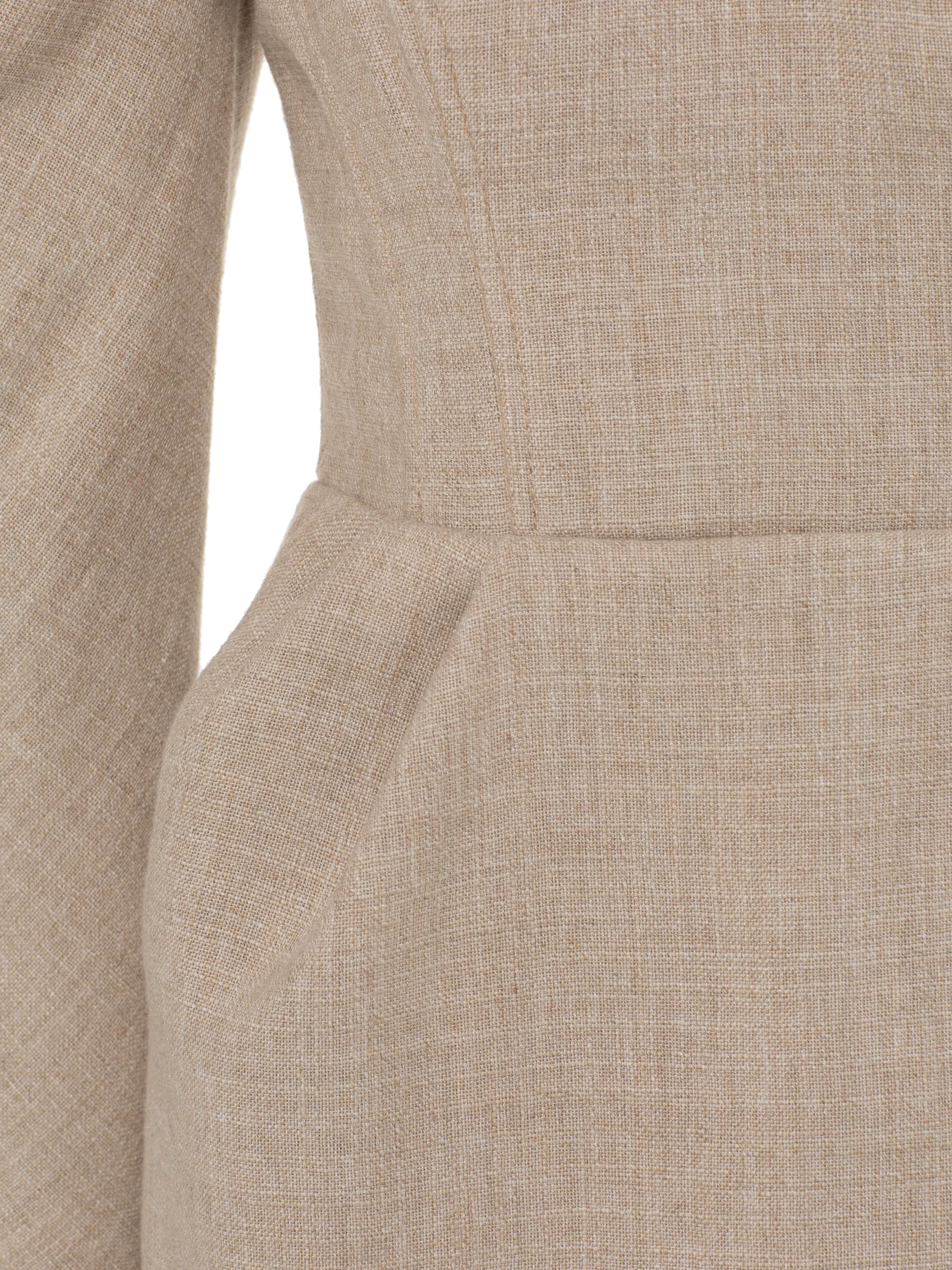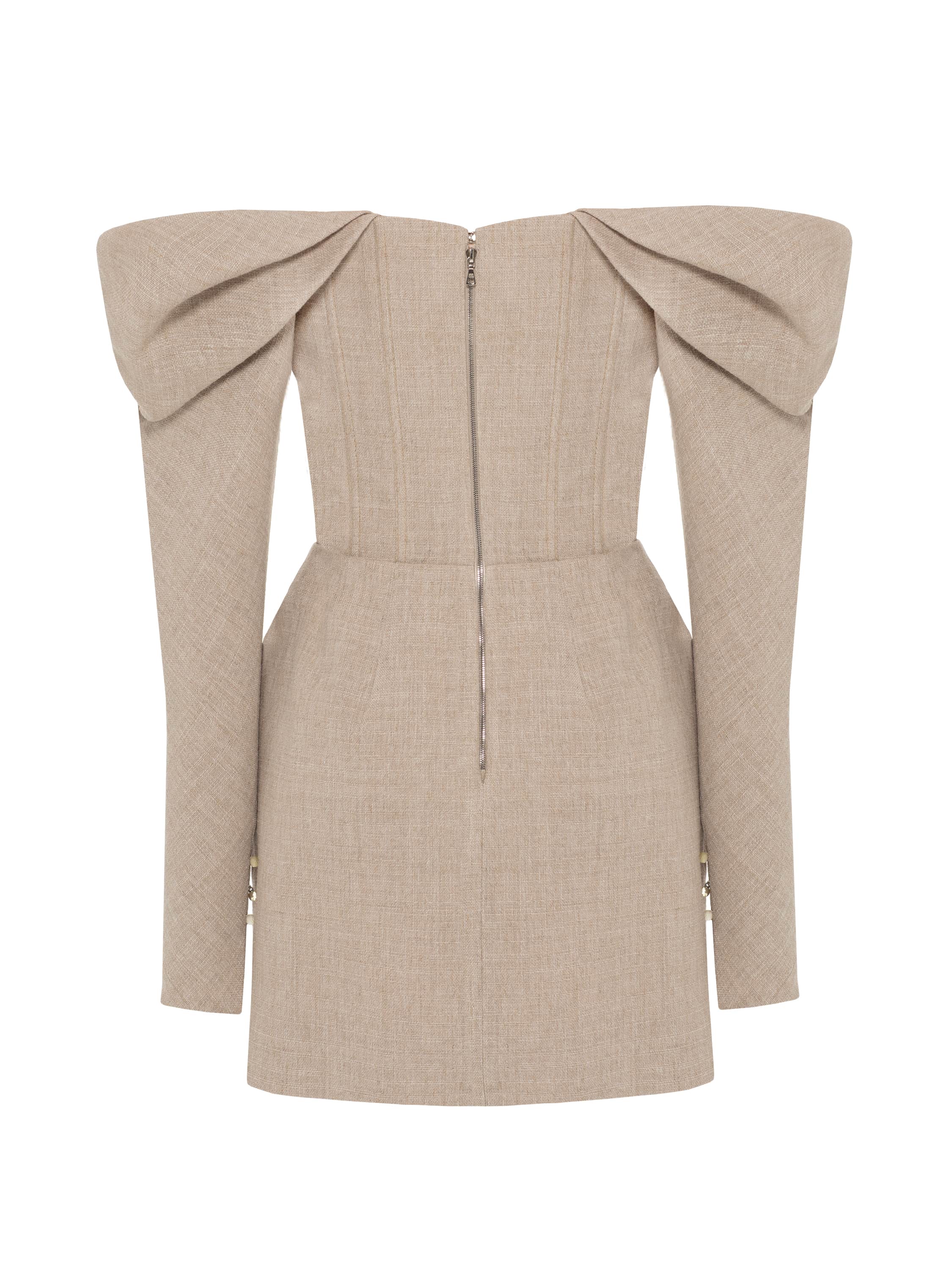 The beige off-the-shoulder mini dress with long dropped sleeves is made of linen fabric. The model with an accent on the décolleté area gracefully emphasizes the figure. Fastens with a zipper at the back.