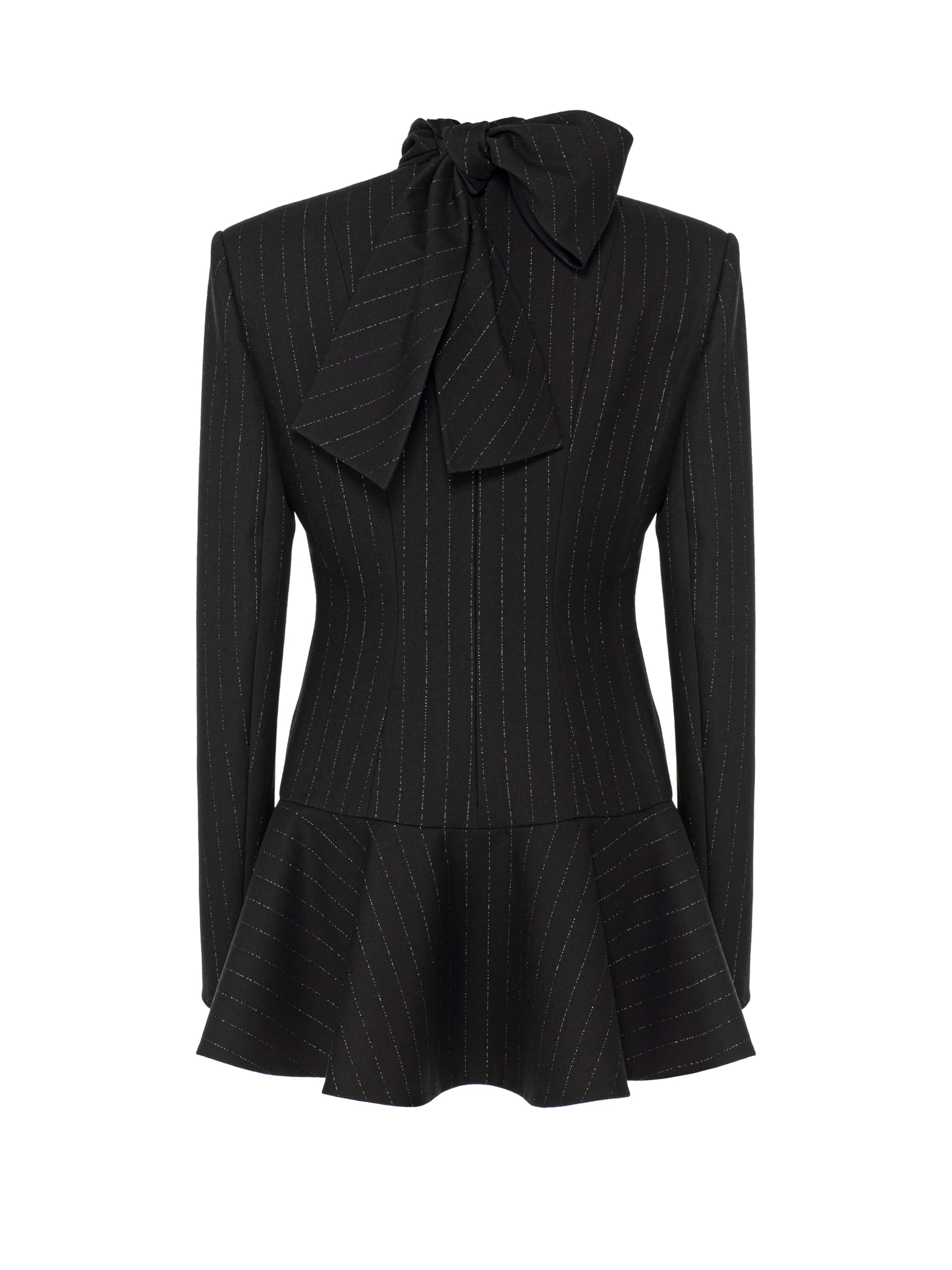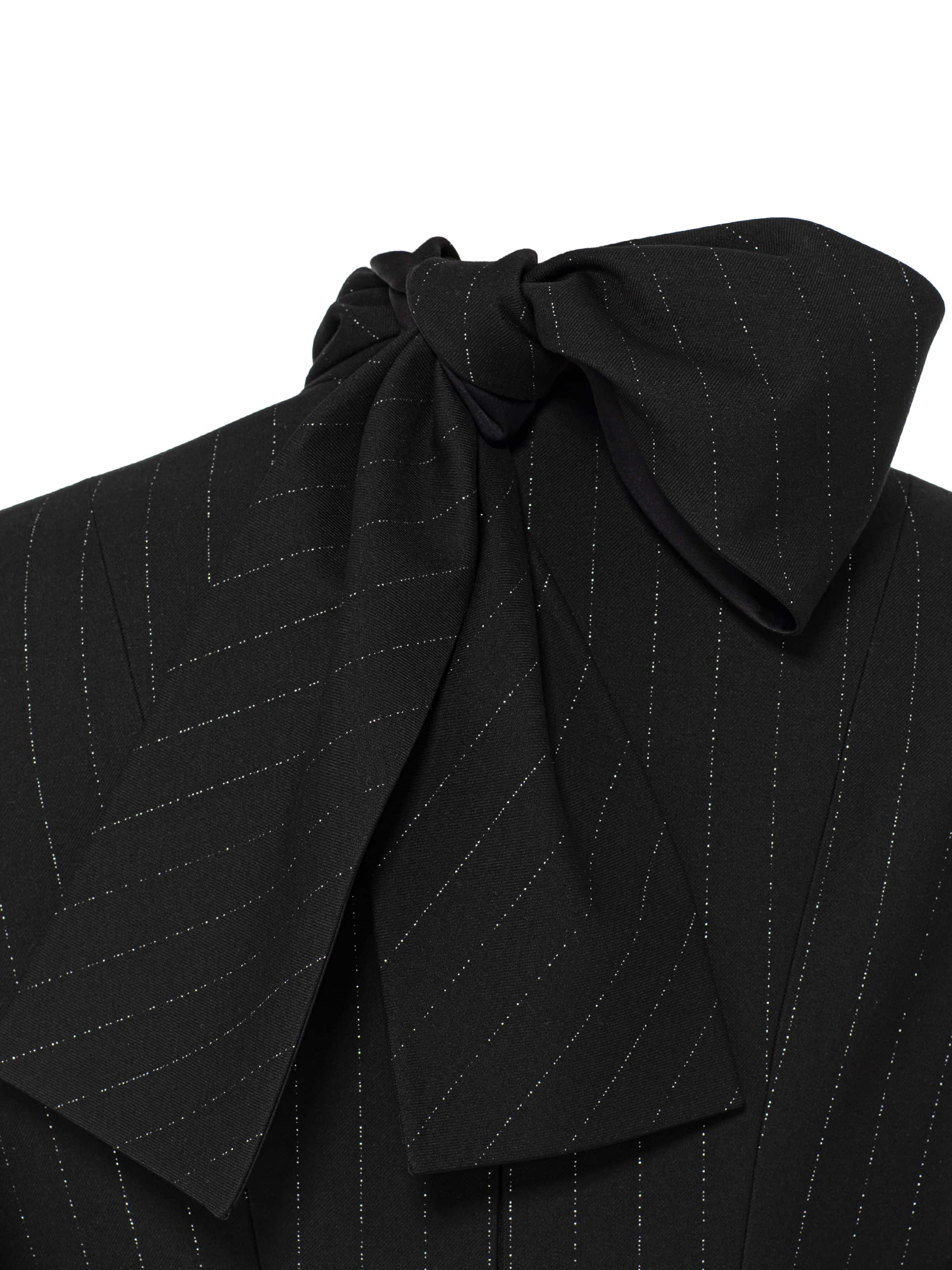 The strict black striped mini dress with accentuated shoulders refers to the uniforms of the 1960s. This cut creates a sense of discipline and strength, while in the new YANA collection it becomes an elegant symbol of refinement and status. The long-sleeved design is complemented by a high stand-up collar flowing into long ties that can be knotted at the back into a bow or an original knot.