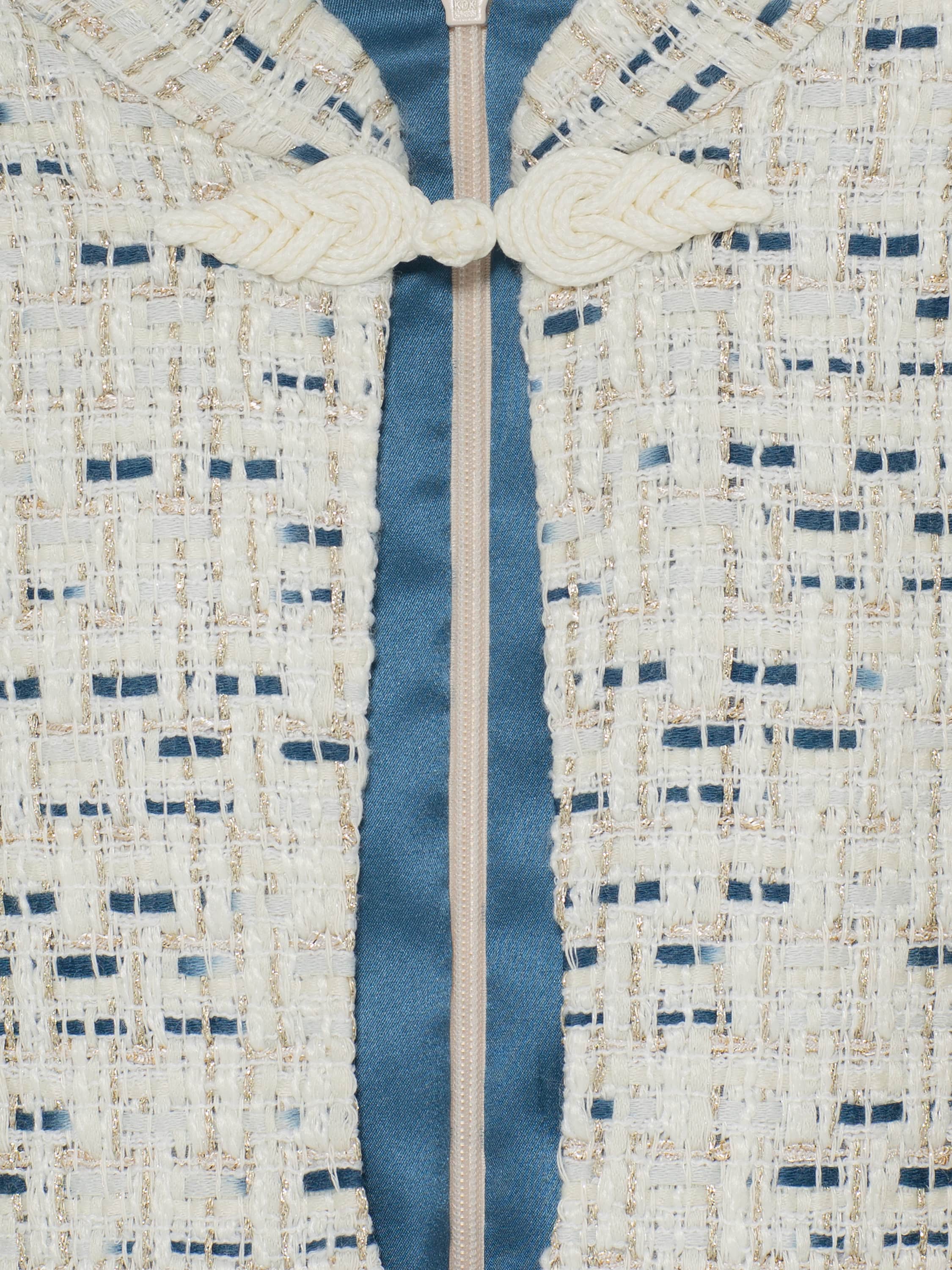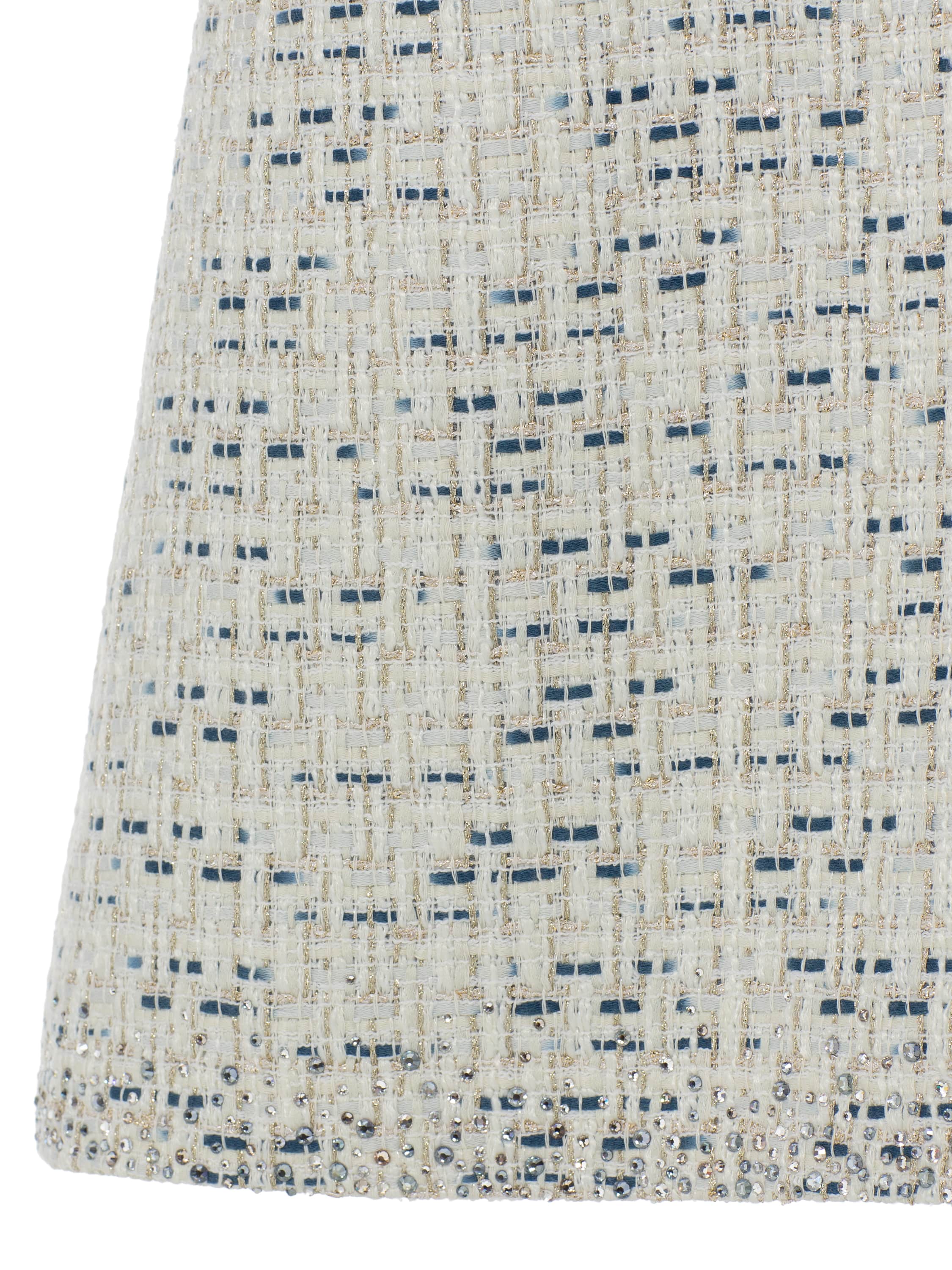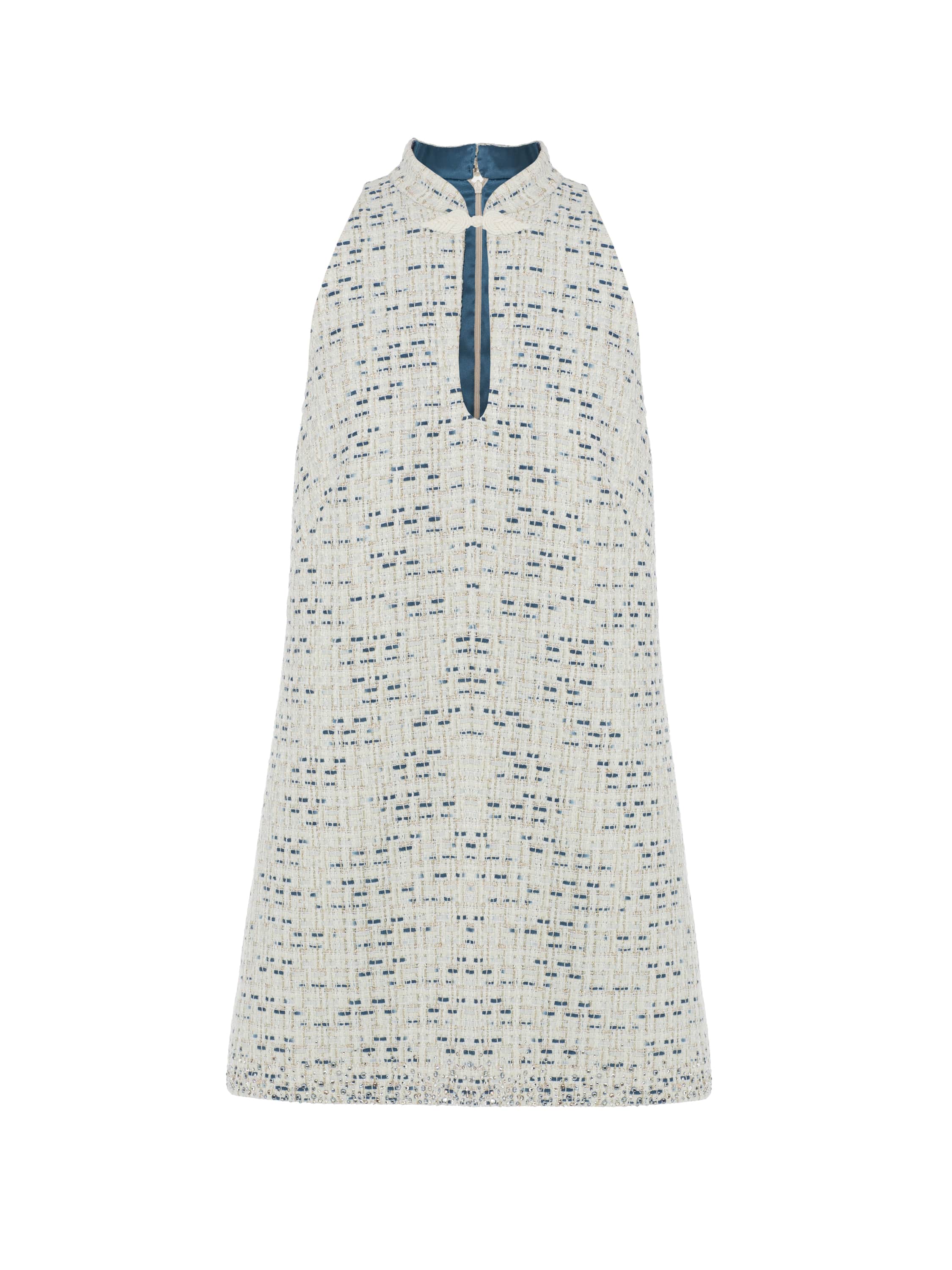 The mini dress with a stand collar and a teardrop neckline is made of milky blue tweed. The model is complemented with a clasp and crystals. The decoration of the item took Yana fashion house craftsmen 7.5 hours of handwork.
