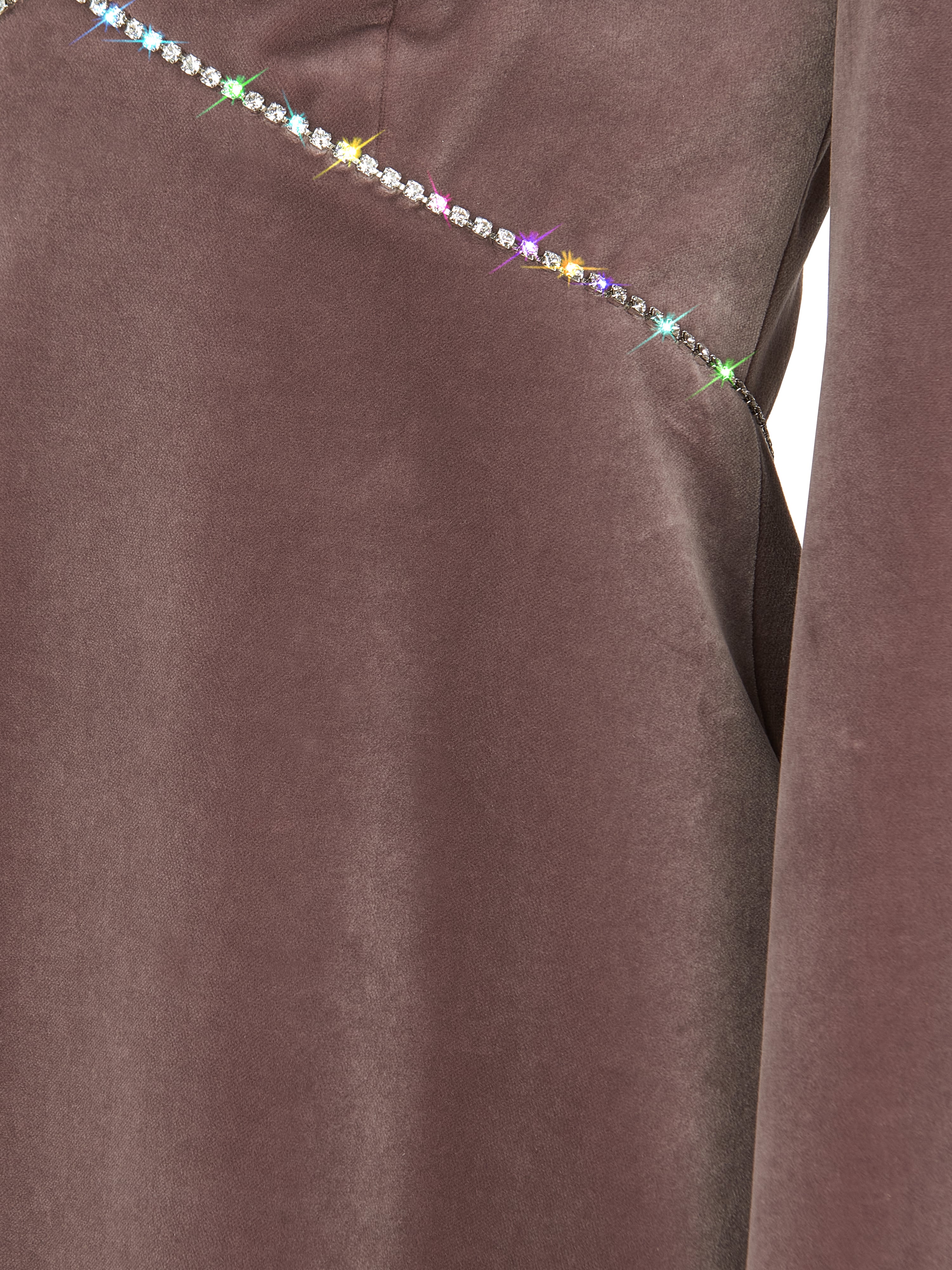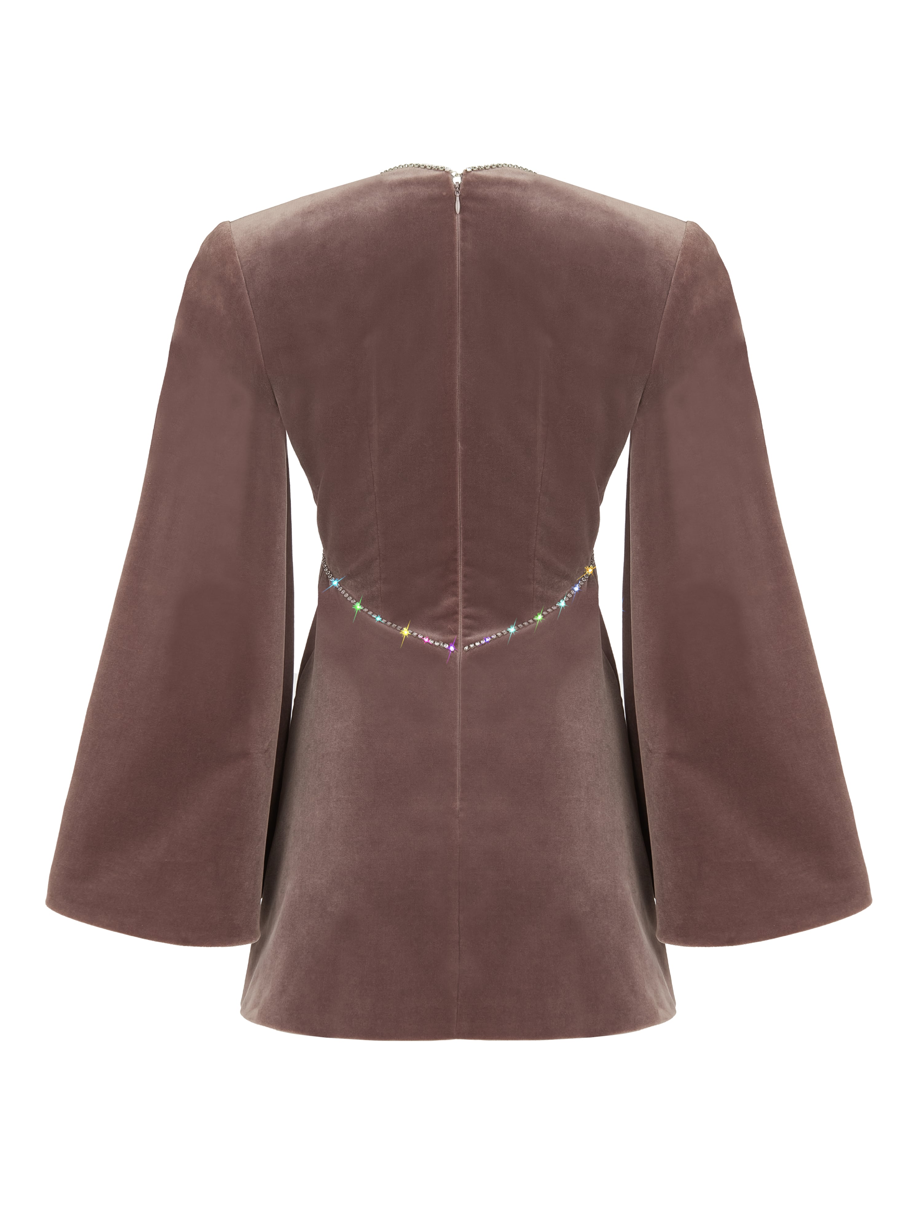 A lilac velvet mini dress with a V-neckline and long flared sleeves. Finished with crystals along the neckline and on the waist. Zip fastening at the back.
