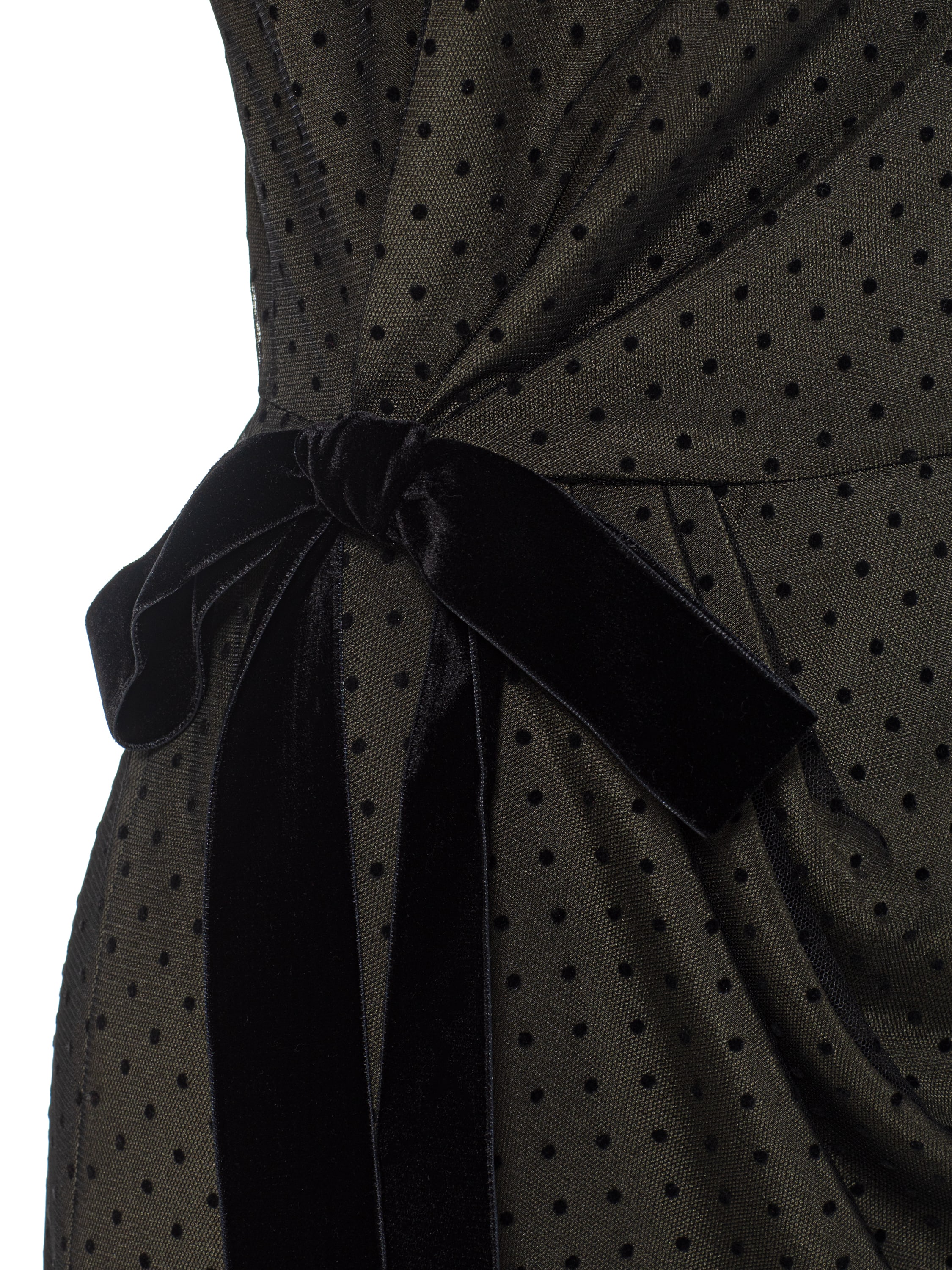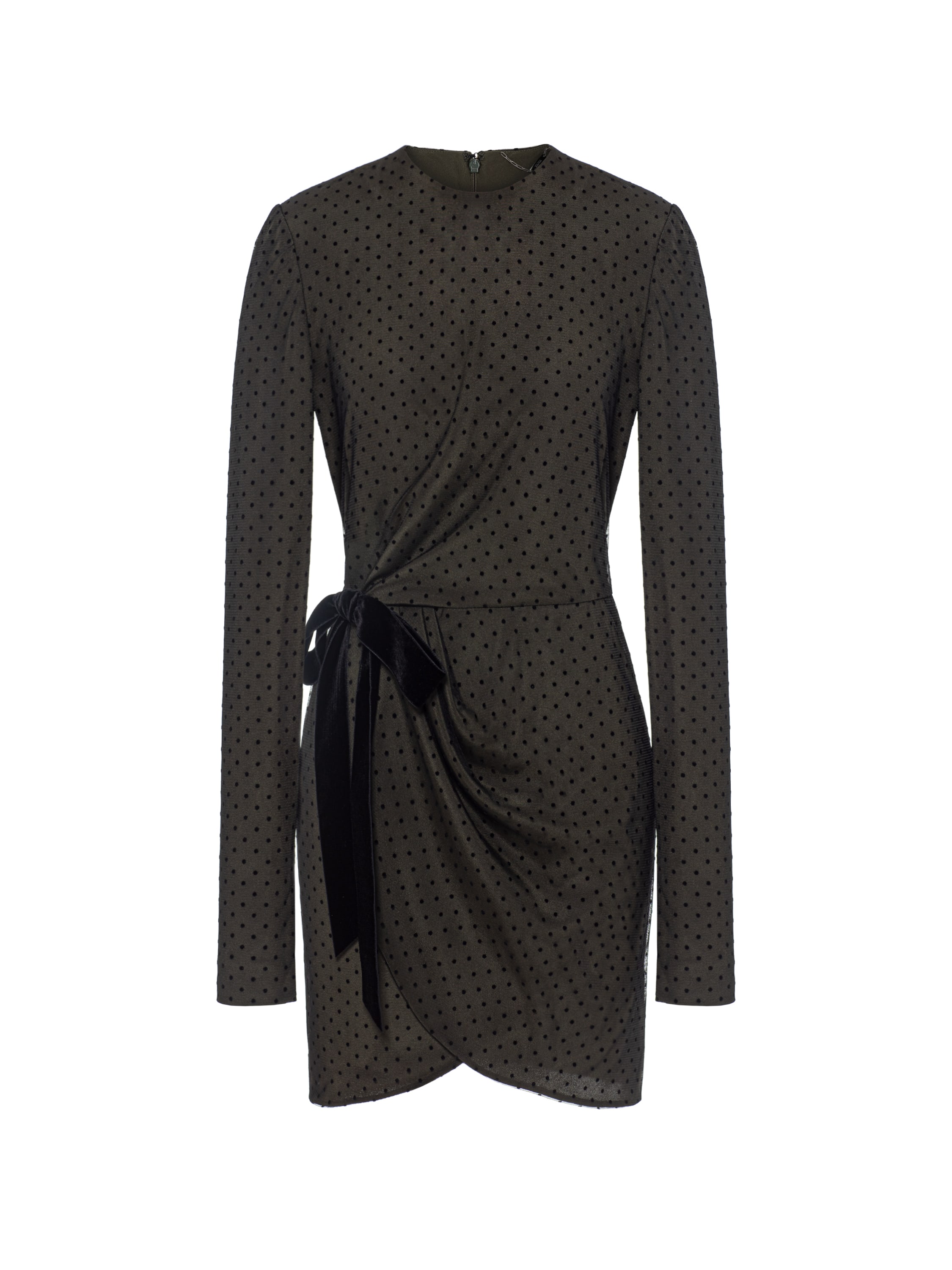 A laconic khaki polka-dot mini dress is an everyday option suitable for any occasion. The model with a wrap skirt and soft draping is complemented by an accent black side bow. Fastens with a concealed back zipper.