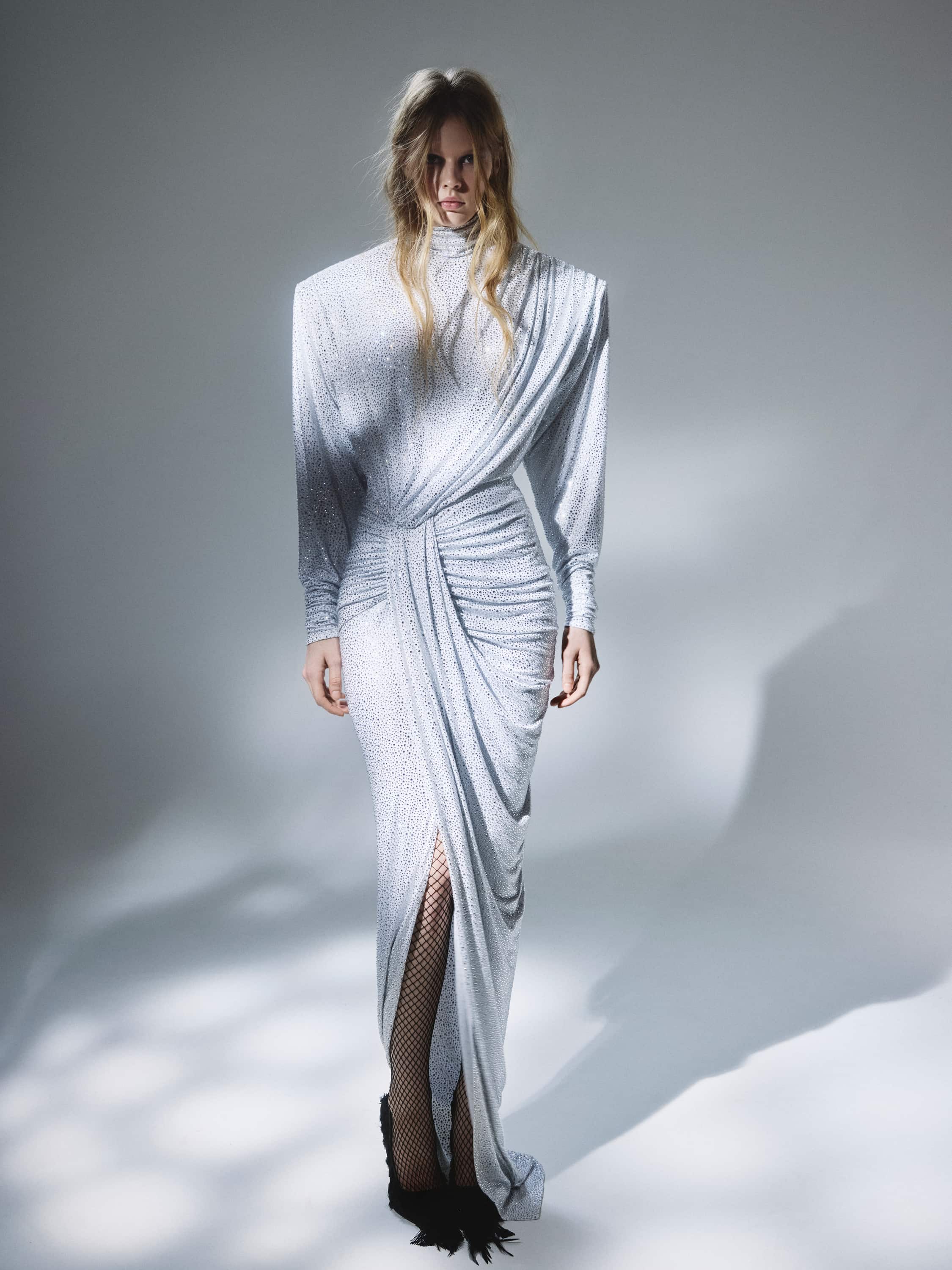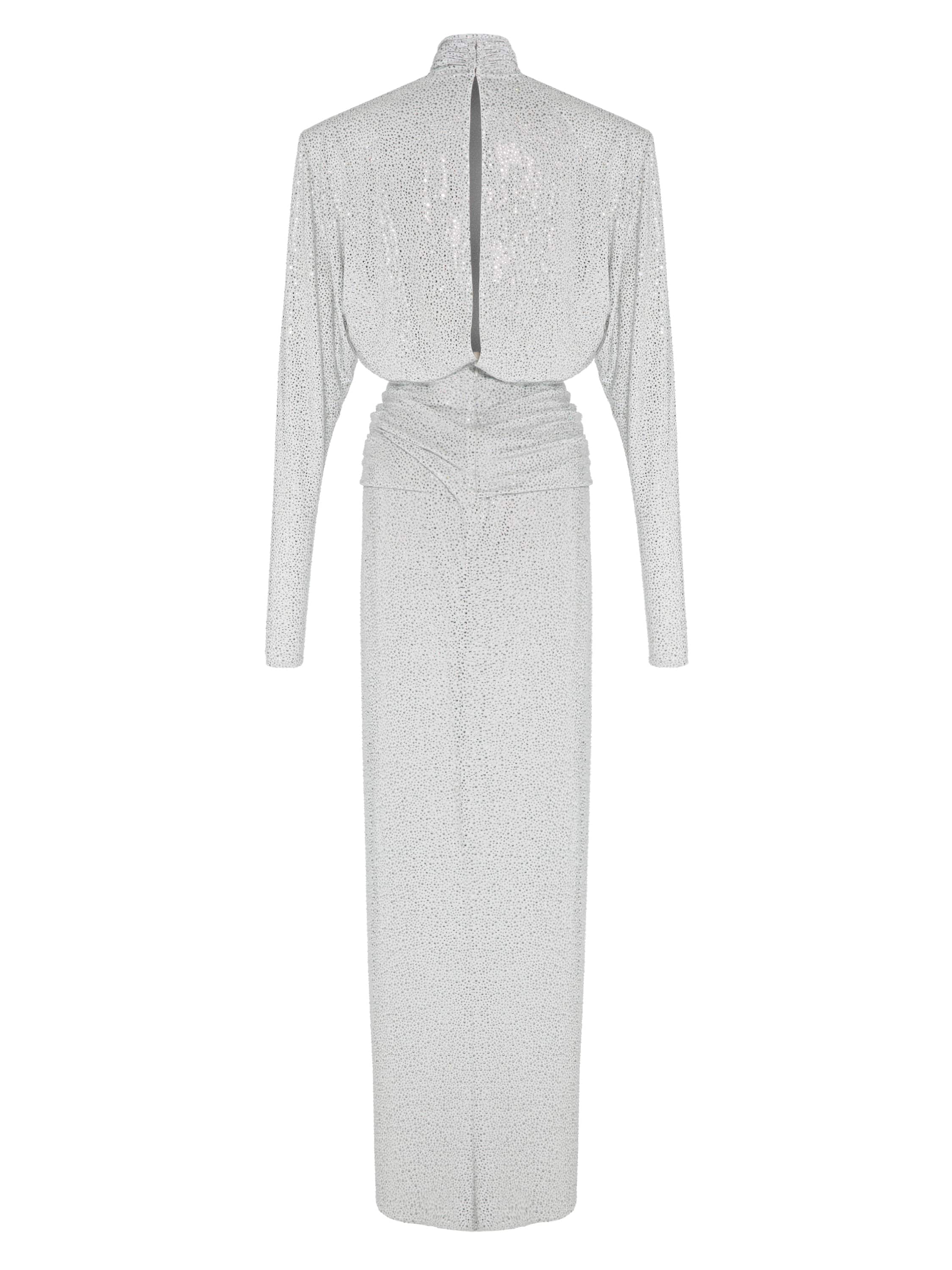 The long-sleeved maxi dress is made of knit fabric, hand-decorated with rhinestones. It took the Fashion House’s craftsmen 140 hours of handwork to apply the rhinestones. The design is complemented by an elegant draping at the waist and a high front slit.