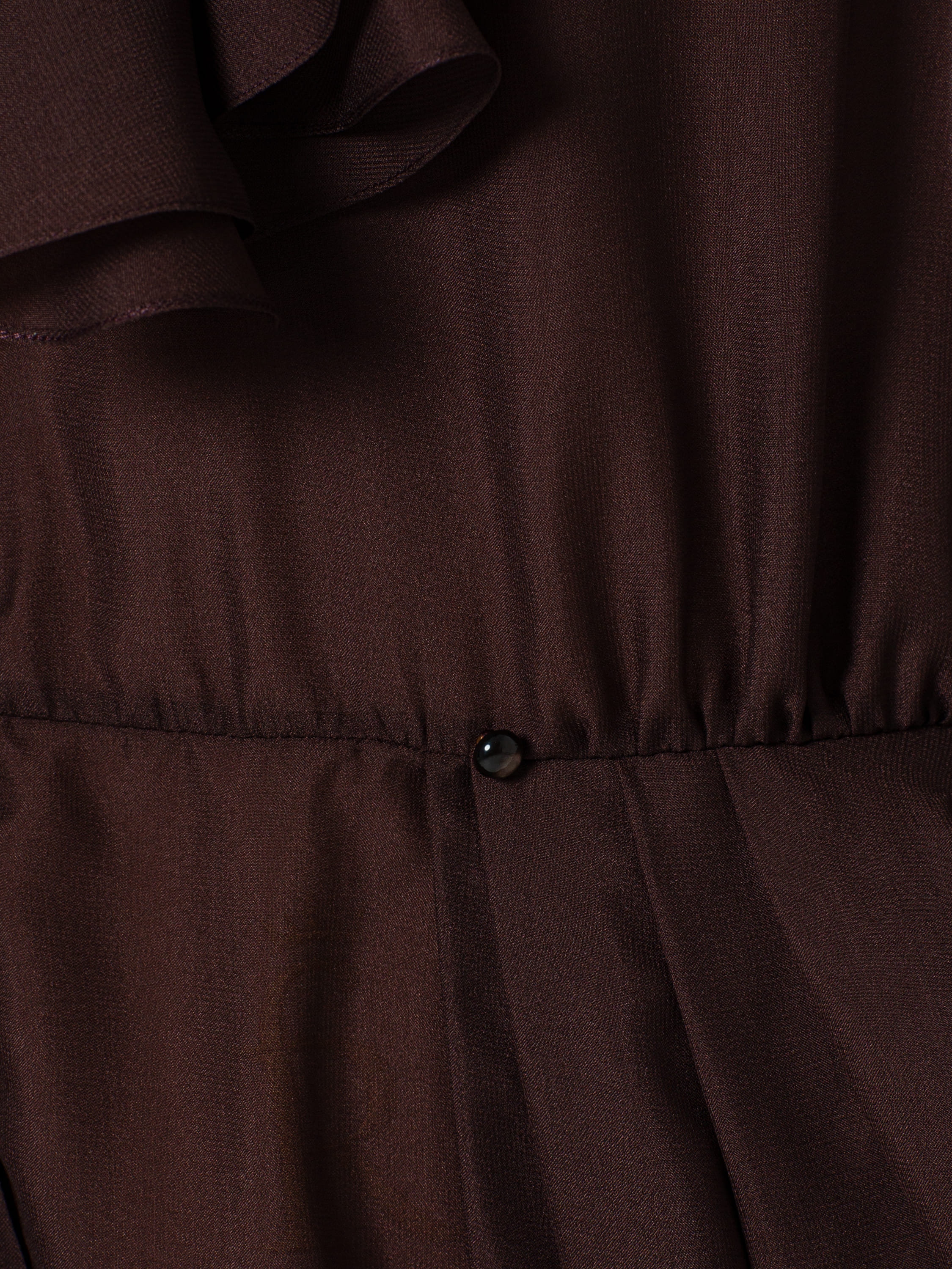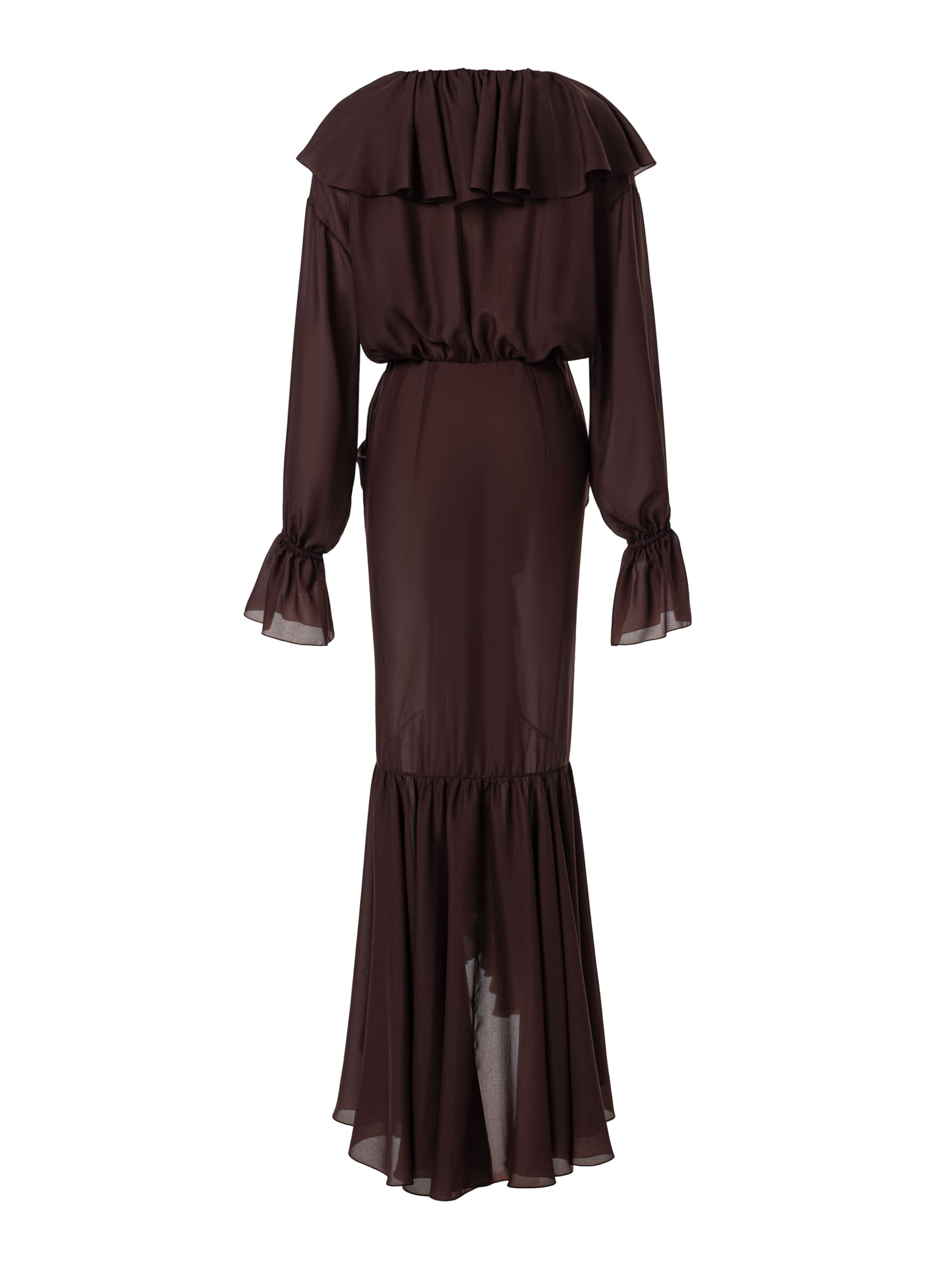 A maxi dress with flounces, made of chiffon in a trendy chocolate shade. The décolletage area is elegantly accentuated with a collerette (cocktail collar), which adds texture and dynamism to the look.