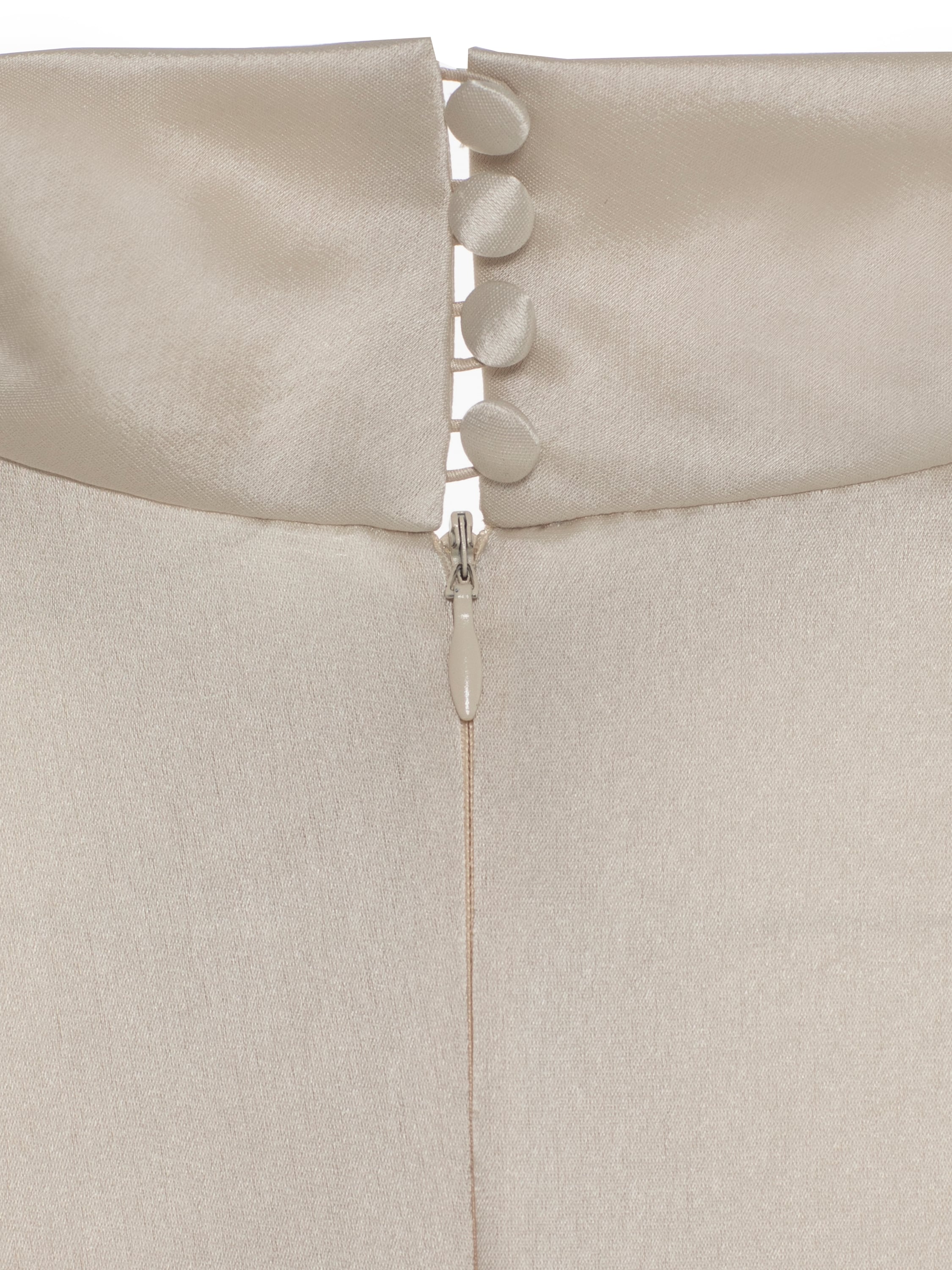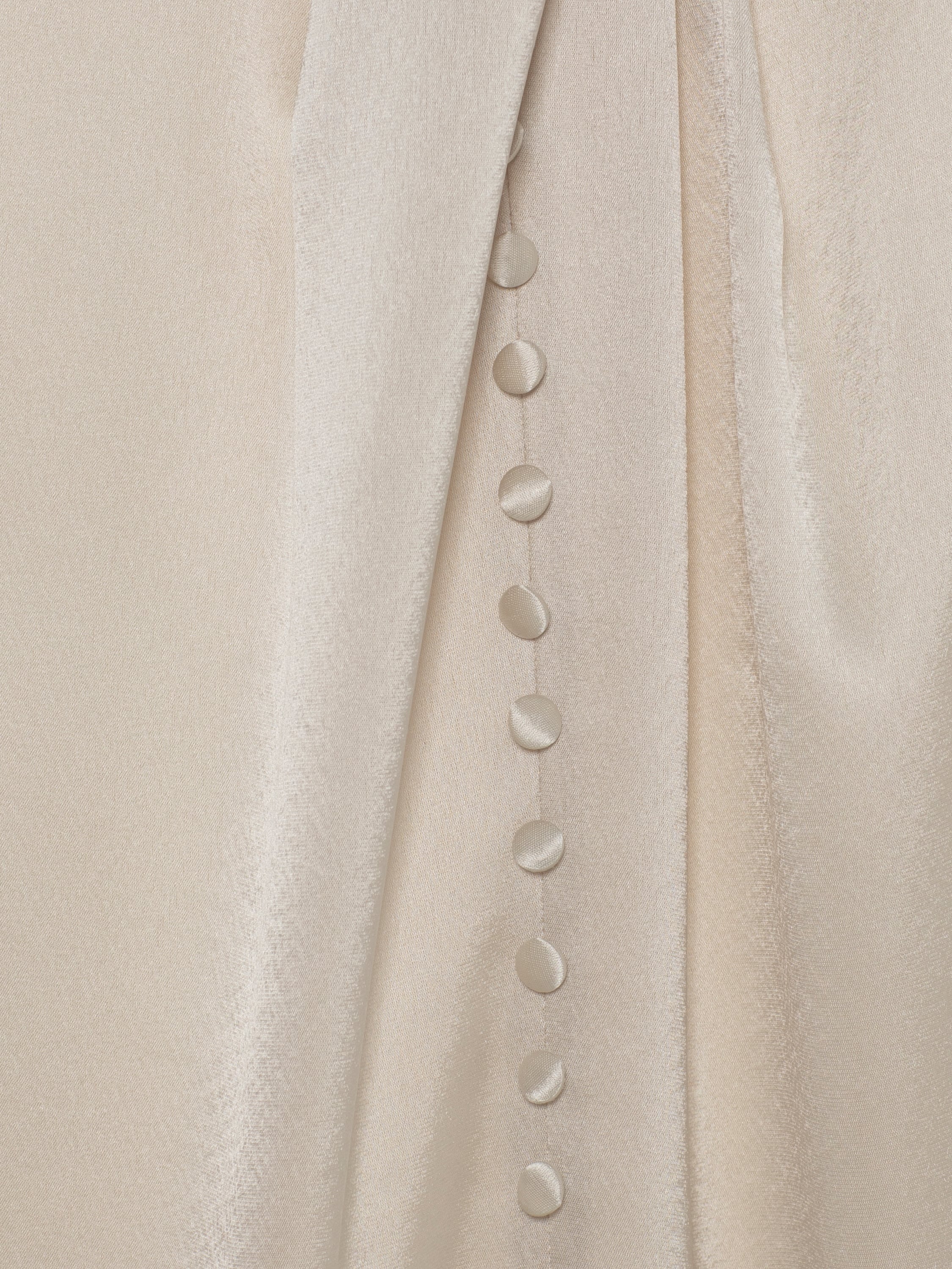 A maxi dress made of milk-colored silk with mink fur cuffs is a delicate look for a special occasion. The laconic model is complemented by a draped stand-up collar and tone-on-tone buttons. Fastens with a concealed back zipper.