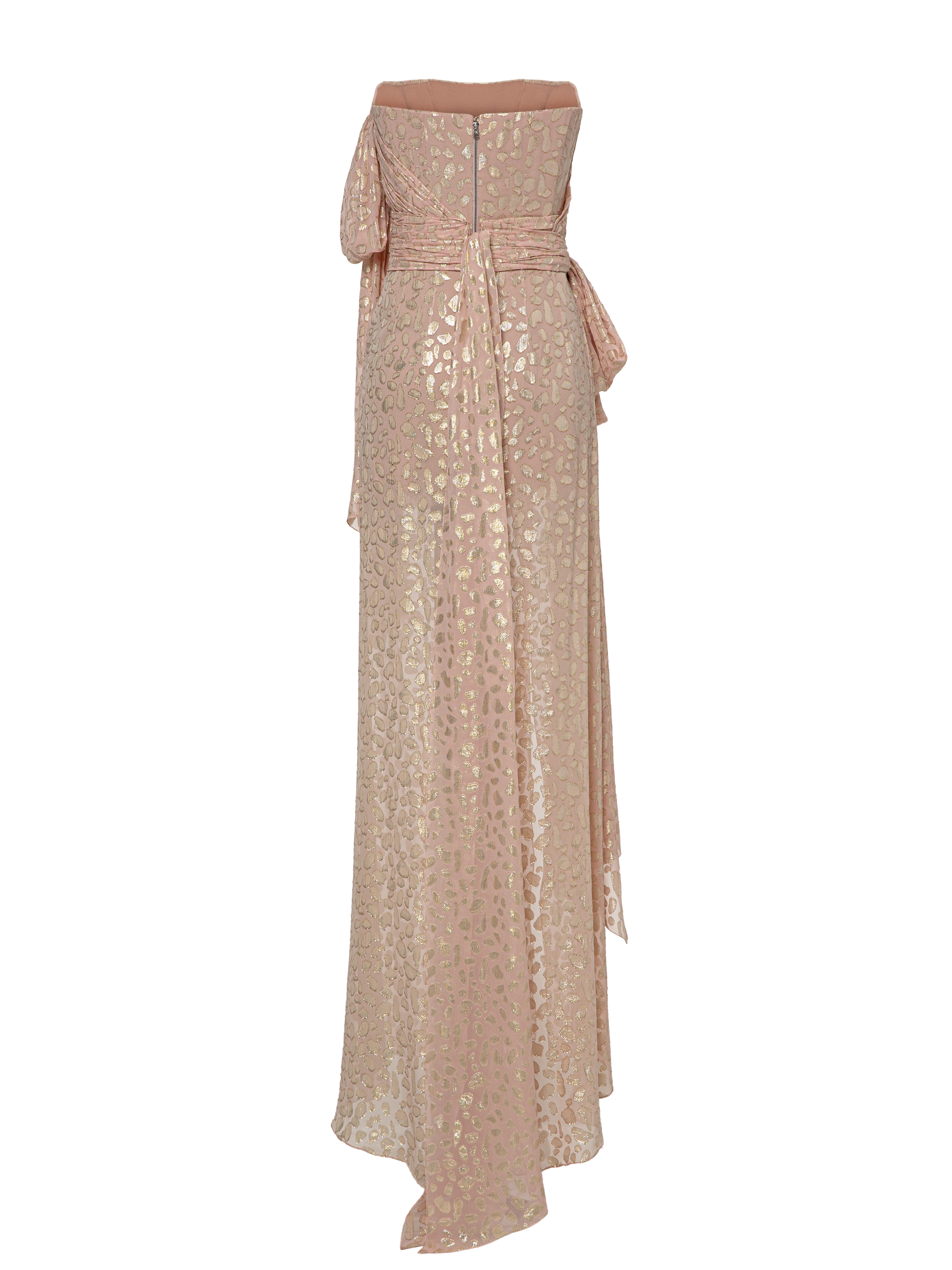The maxi dress with an animalistic pattern will be a flawless option for an evening out. The model is crafted from silk chiffon in an antique rose shade with interwoven golden lurex threads. Smooth draping emphasizes the texture of the fabric.