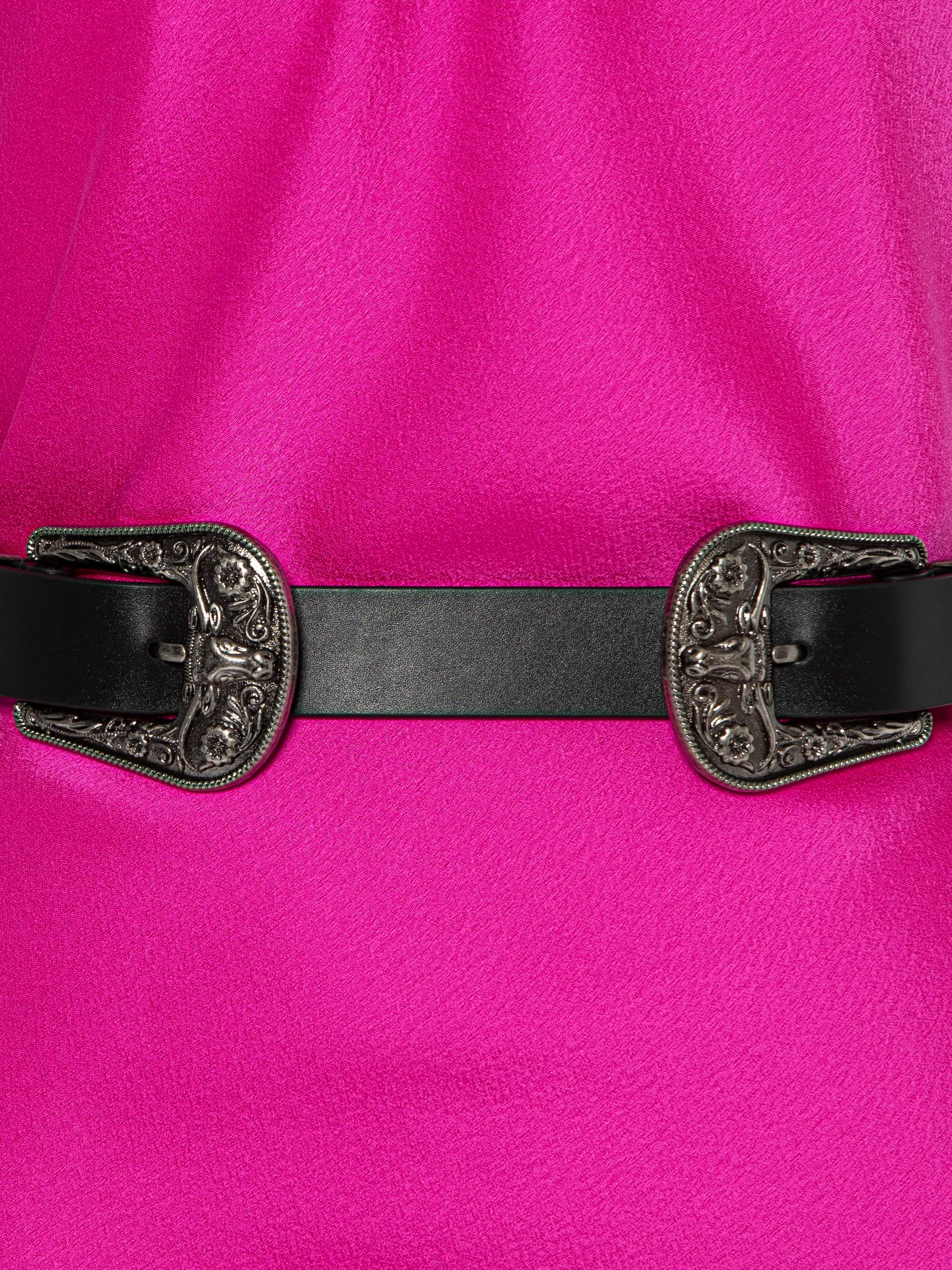 The open-back maxi dress is made of fuchsia-colored artificial silk fabric. The model features a high draped collar. At the back there is a black bow with long grosgrain ribbons. The dress comes with a black leather belt with two buckles.