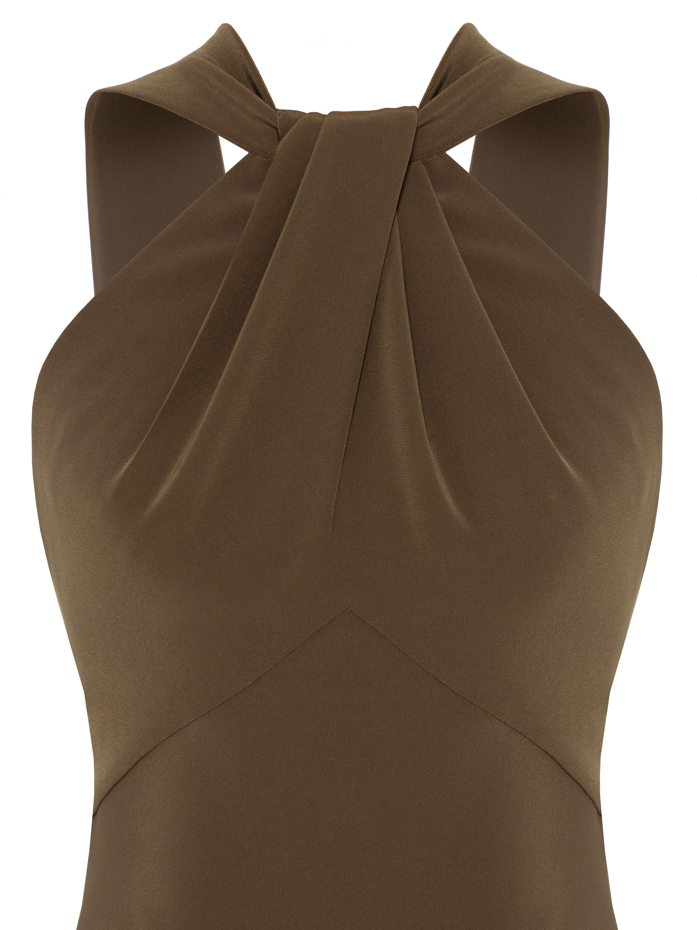 The fitted khaki maxi dress perfectly accentuates the silhouette. The model with an expressive draped bodice is complemented by an open back. It fastens with a concealed zip at the back.