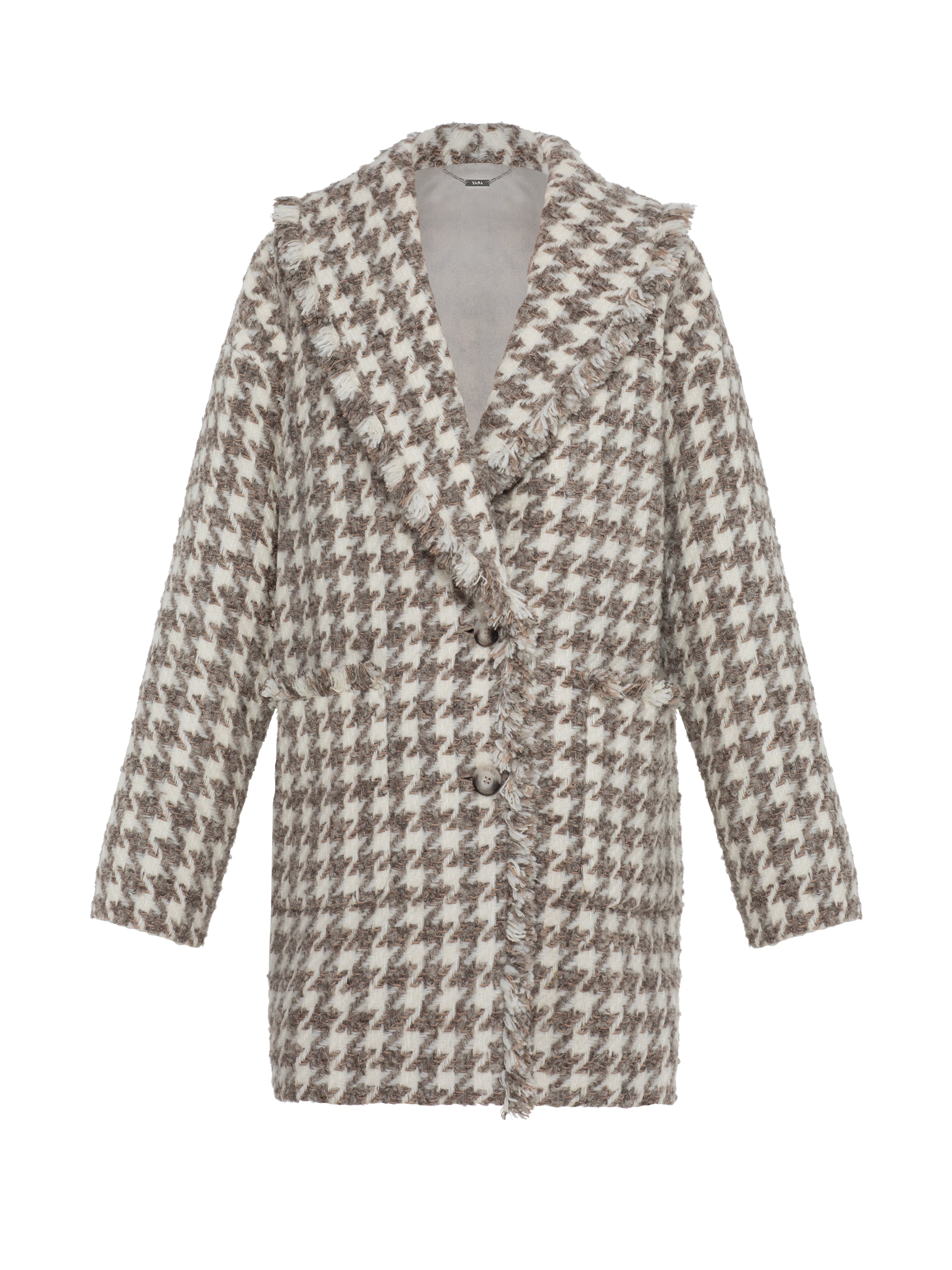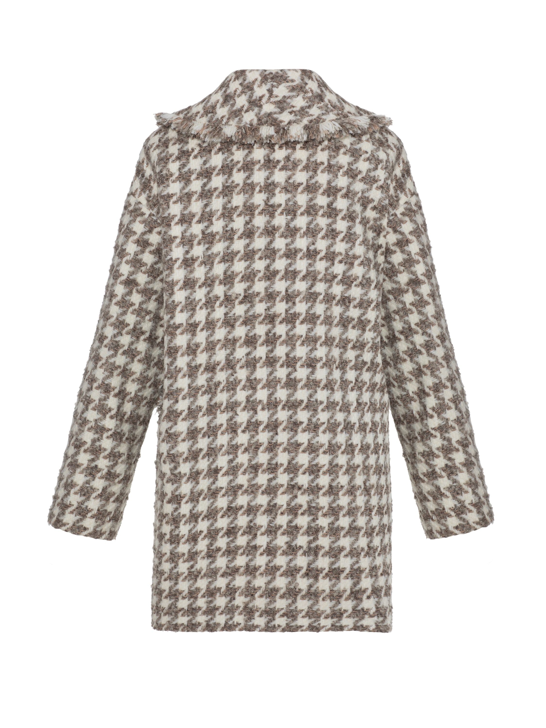 A voluminous cashmere tweed mid‑coat is an outerwear option that matches any clothing style. The laconic houndstooth pattern looks elegant, while the fringe adds expressiveness to the basic piece. The style is complemented with two patch pockets at the front.