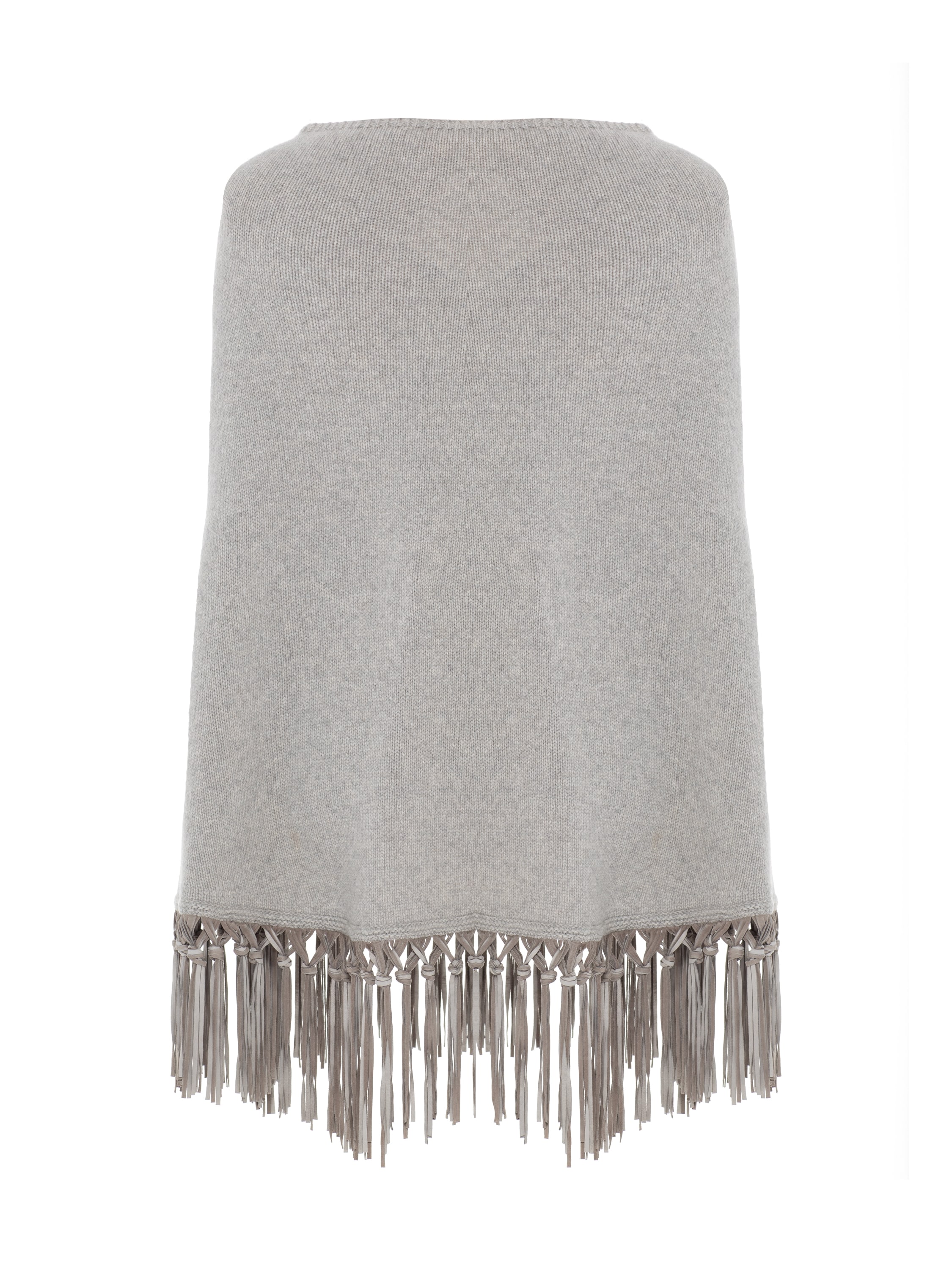 The light gray poncho is made of natural cashmere and complemented with leather fringe.