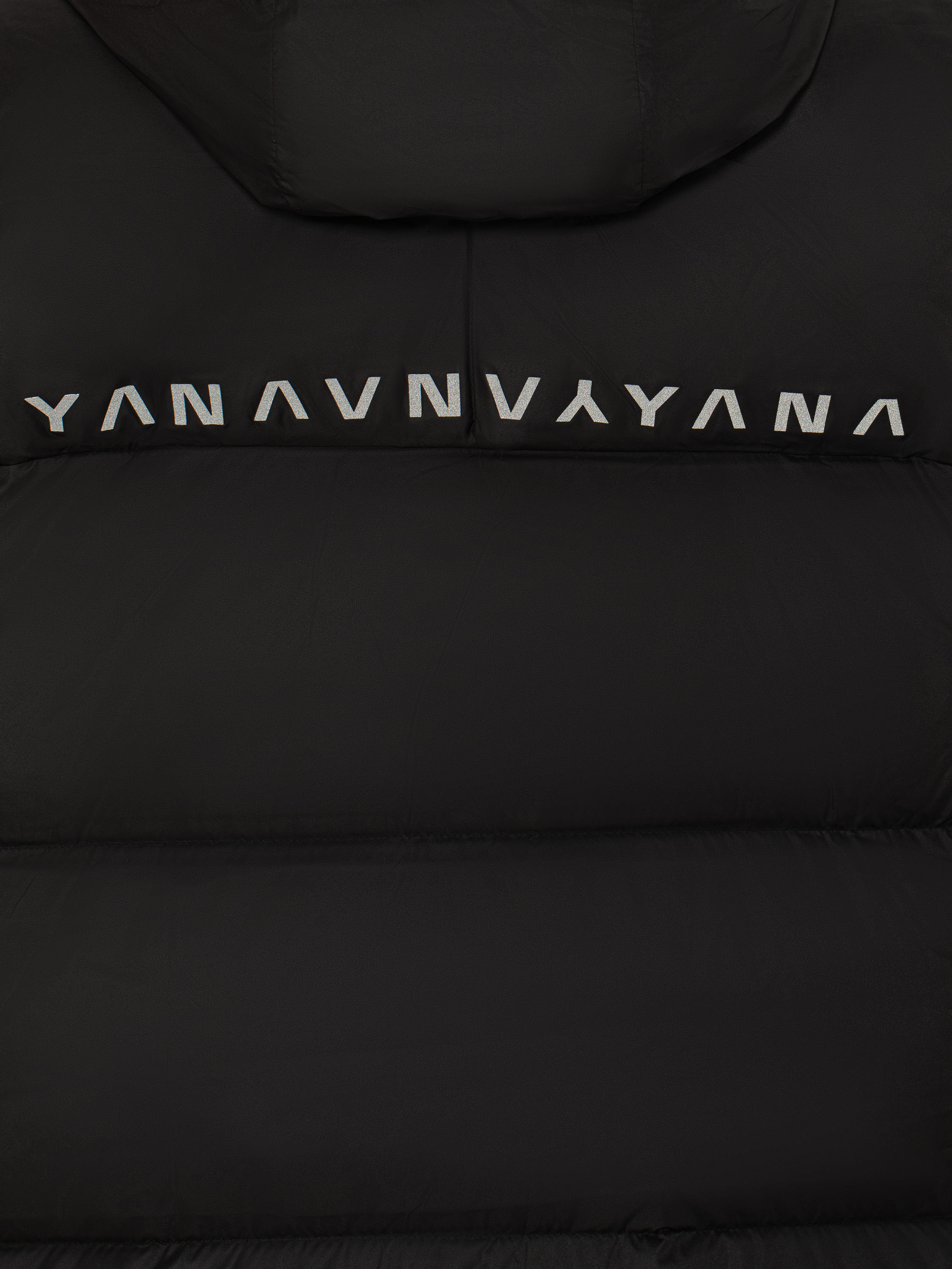The black unisex down jacket with a hood is made of thin soft-touch fabric treated with two types of coating: a water-repellent Teflon finish that also protects the fabric from splashes and dirt, and a membrane responsible for windproofing and thermoregulation. Premium-quality natural goose down makes the jacket voluminous yet ultra-light. The style is complemented by two large zip pockets on the sides, elastic cuffs with a thumbhole and reflective YANA print on the side and back. It fastens with a front zip. The cosy down jacket will keep you warm even in the coldest winter (down to -35°C).