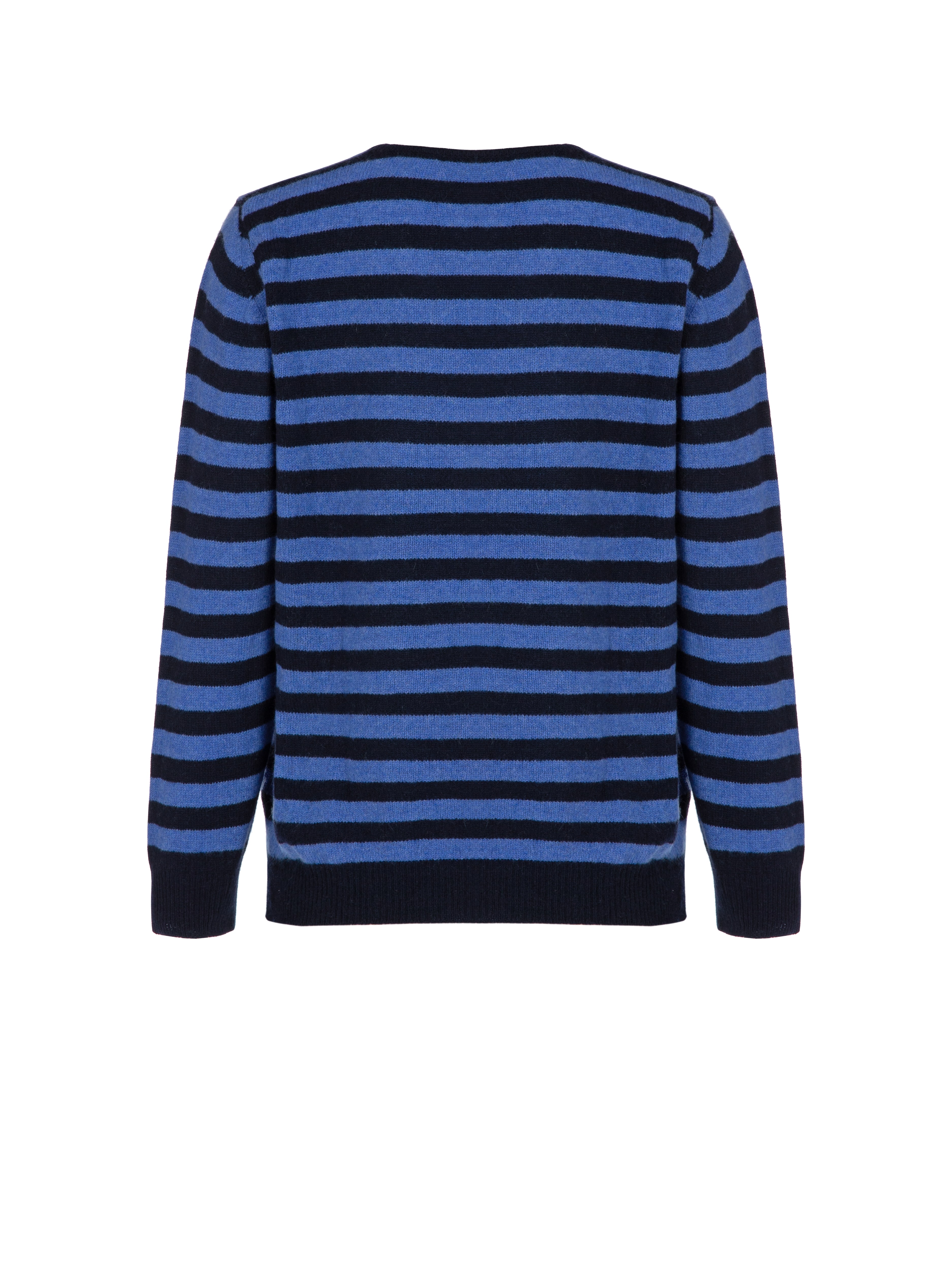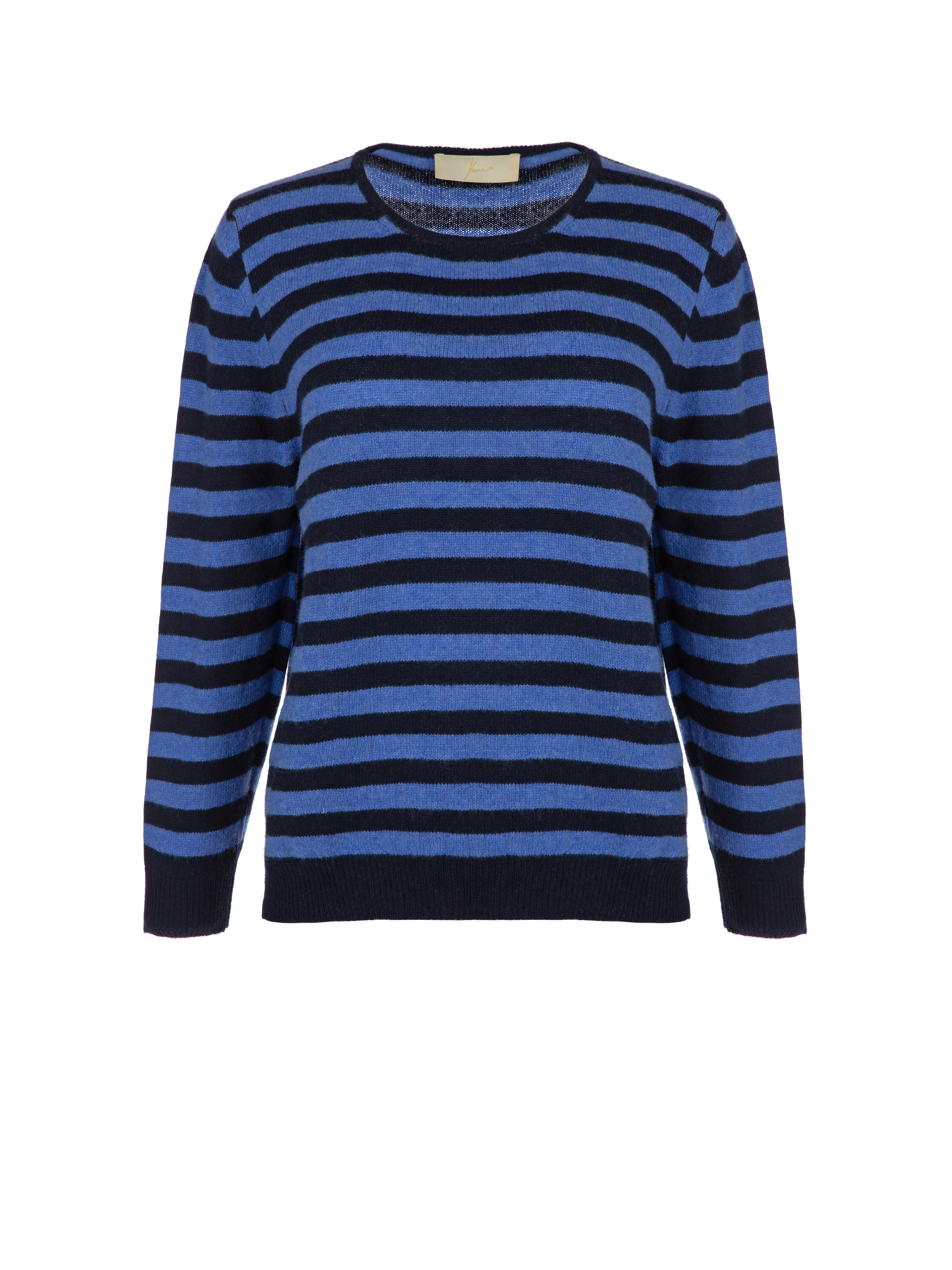 The casual pullover in black and purple stripes is made of natural cashmere. The pleasant-to-the-skin material retains warmth well. Complete the look with your favorite Yana Jeans.