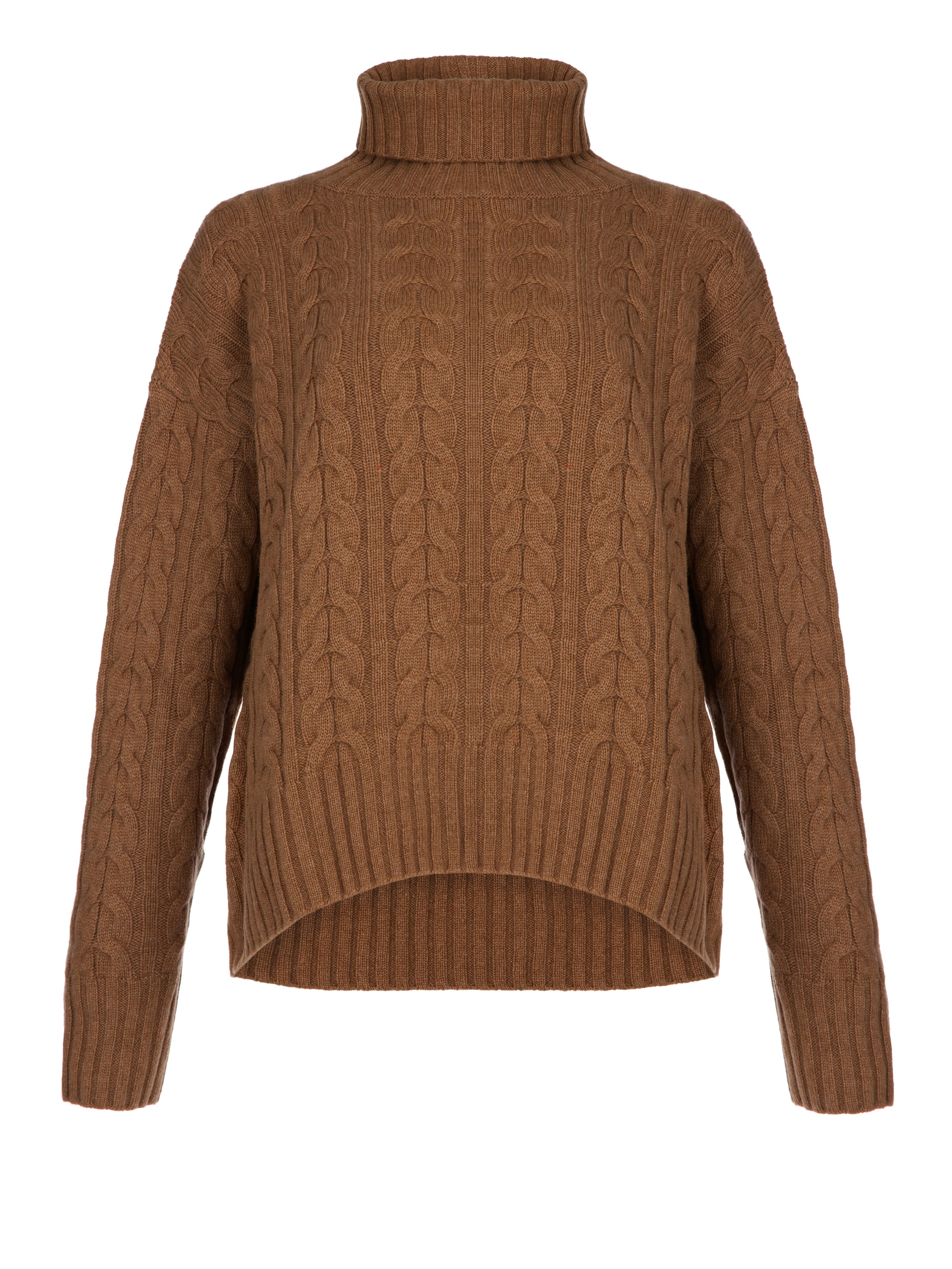 A cozy cable-knit sweater is made of natural cashmere in a trendy caramel shade. The high-neck design protects from wind and cold and gives its wearer a feeling of warmth even in the most inclement weather.