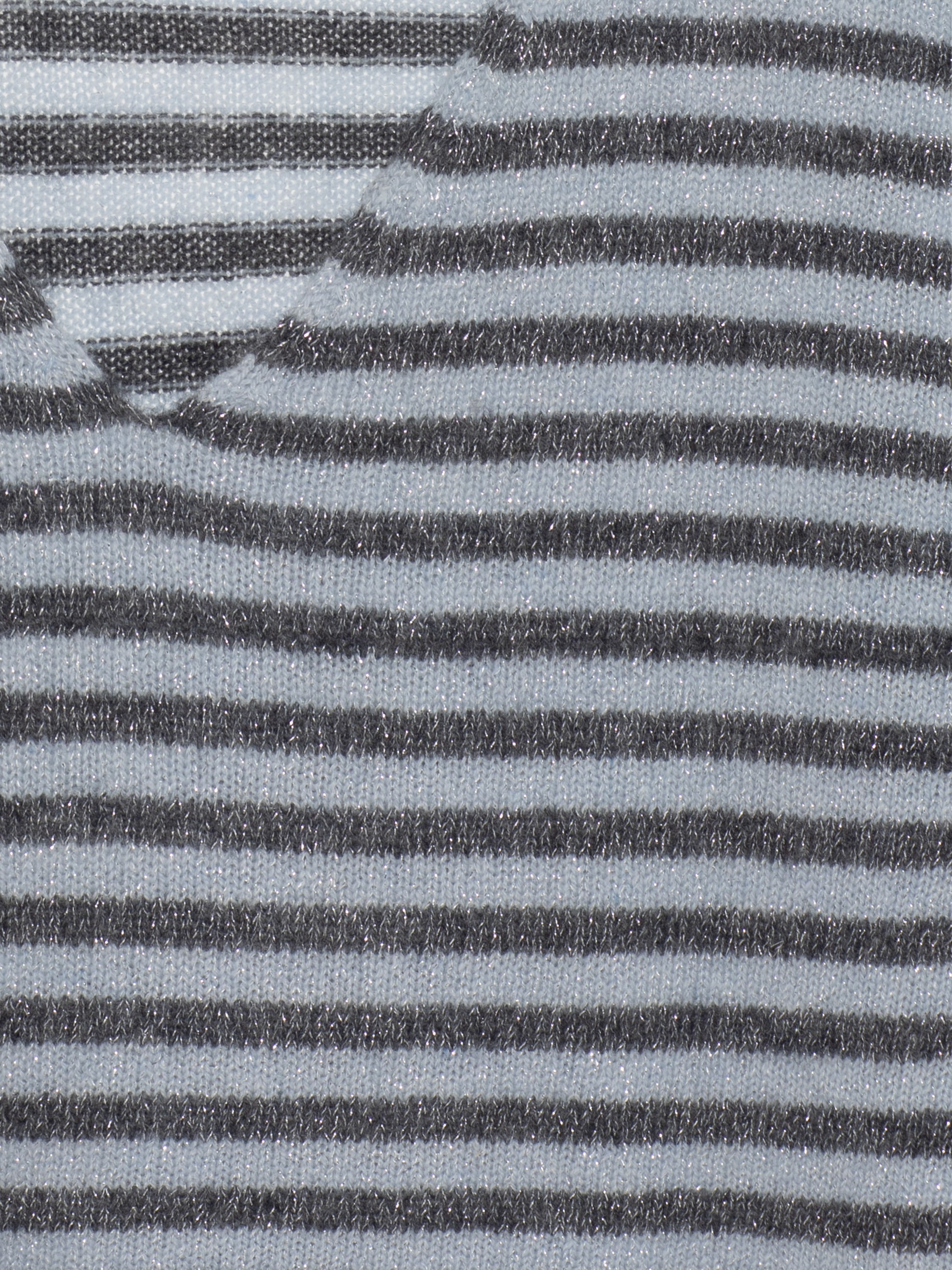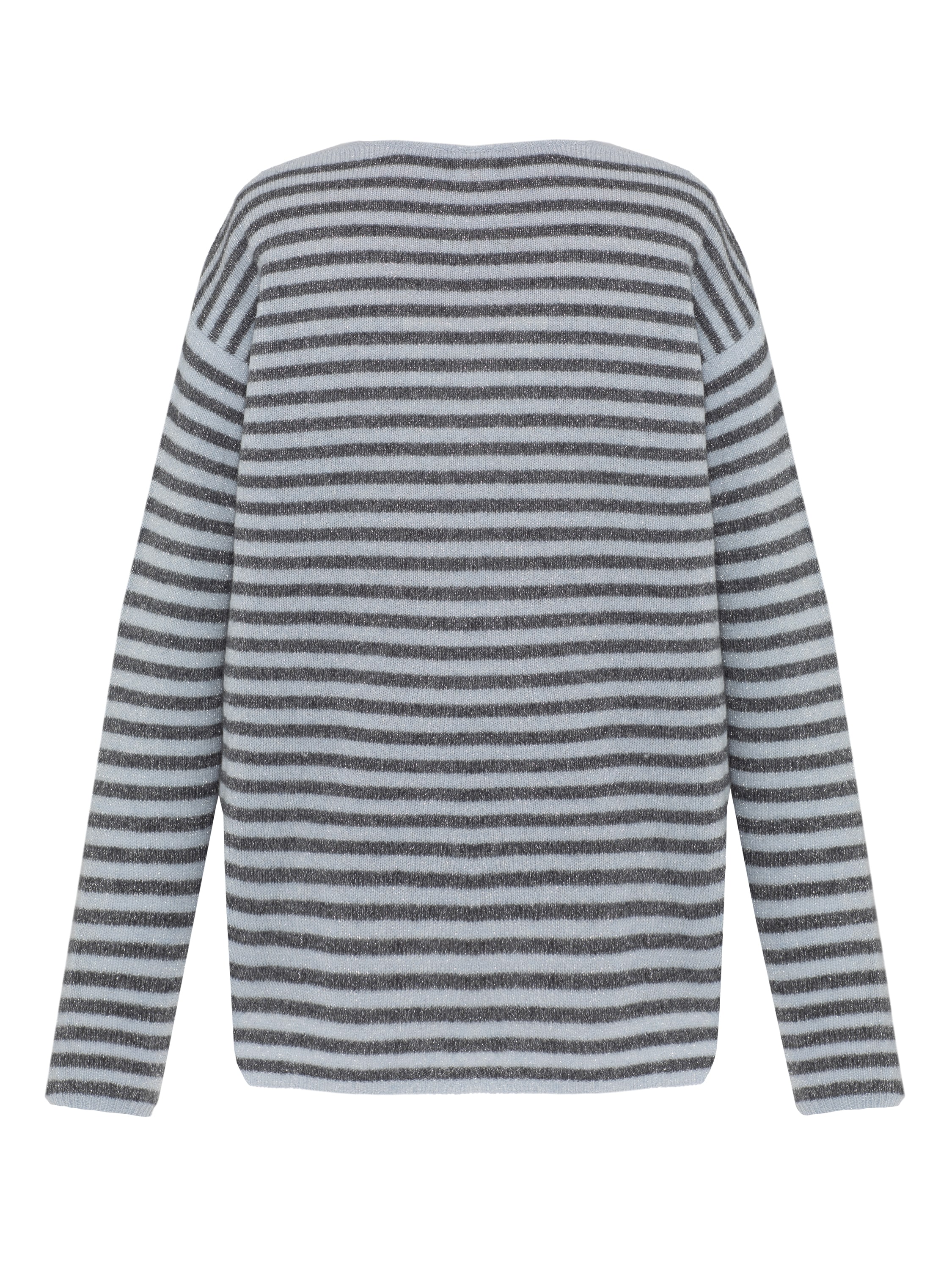 The gray striped pullover is made of natural cashmere with lurex. The model features a V-neck and long sleeves.