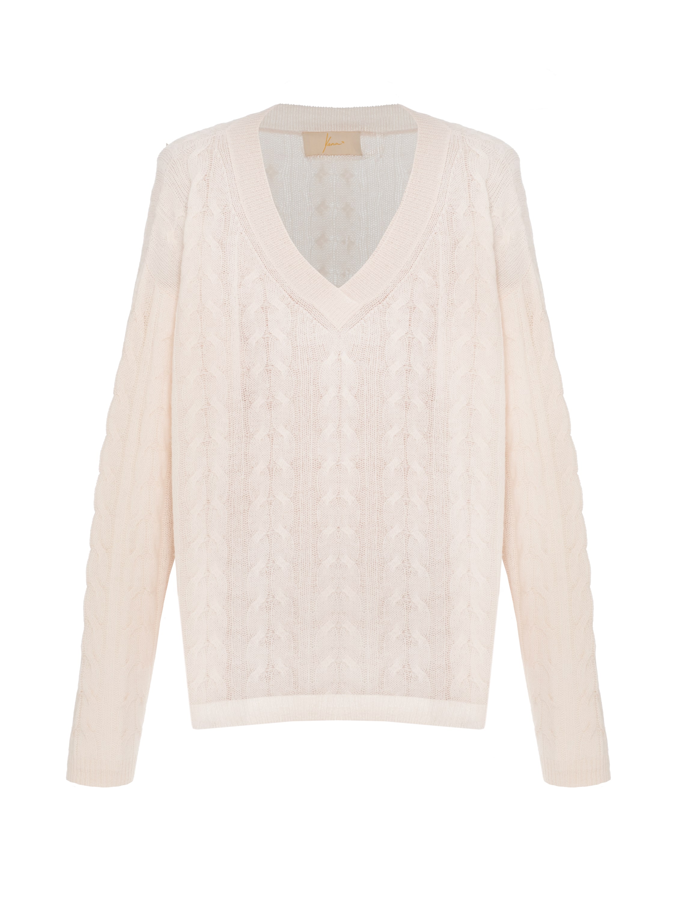 A light pink V-neck pullover is hand-knitted in a single thread from soft cashmere yarn. The textured cable knit pattern makes the basic model cozy and delicate.
