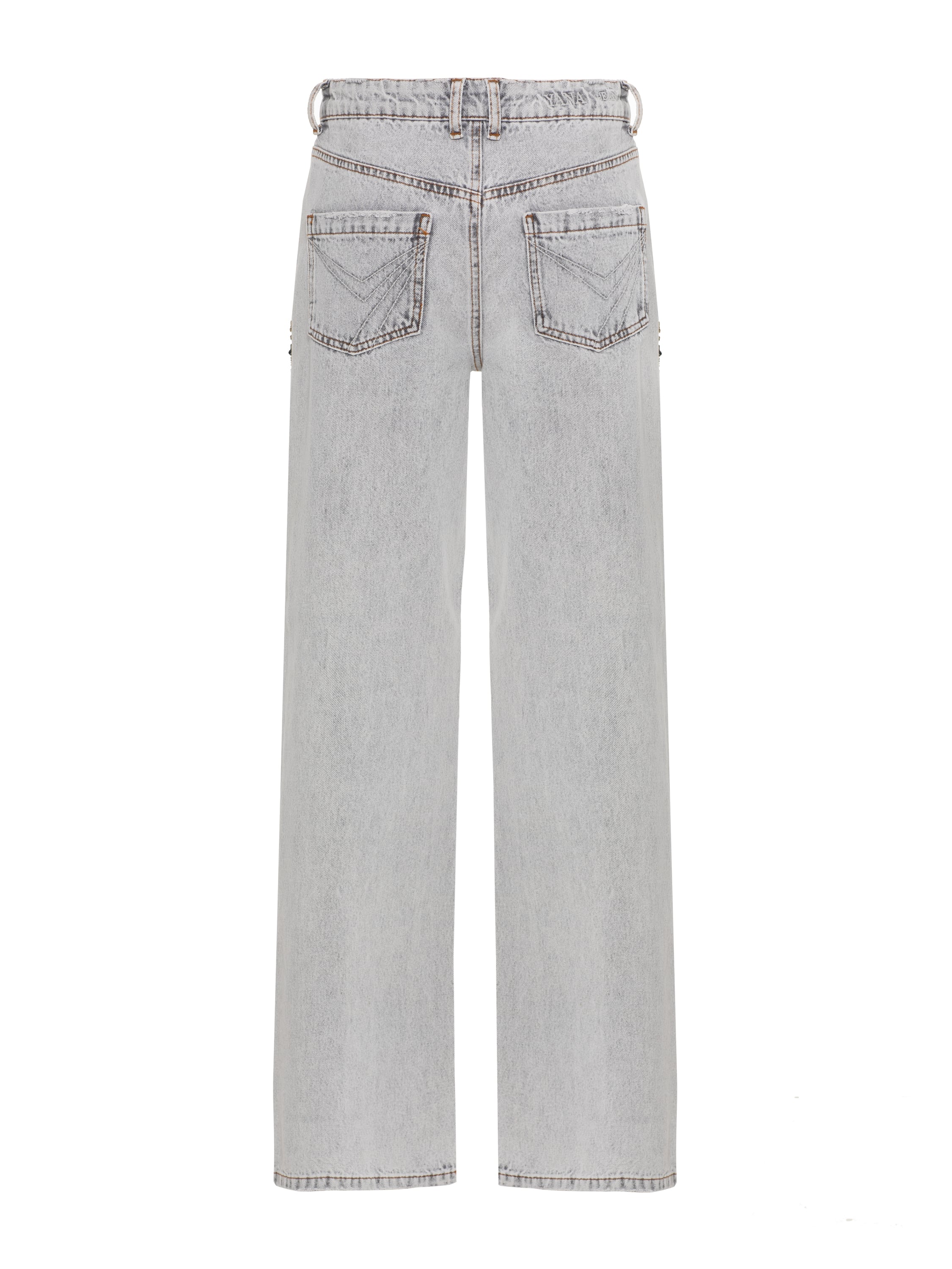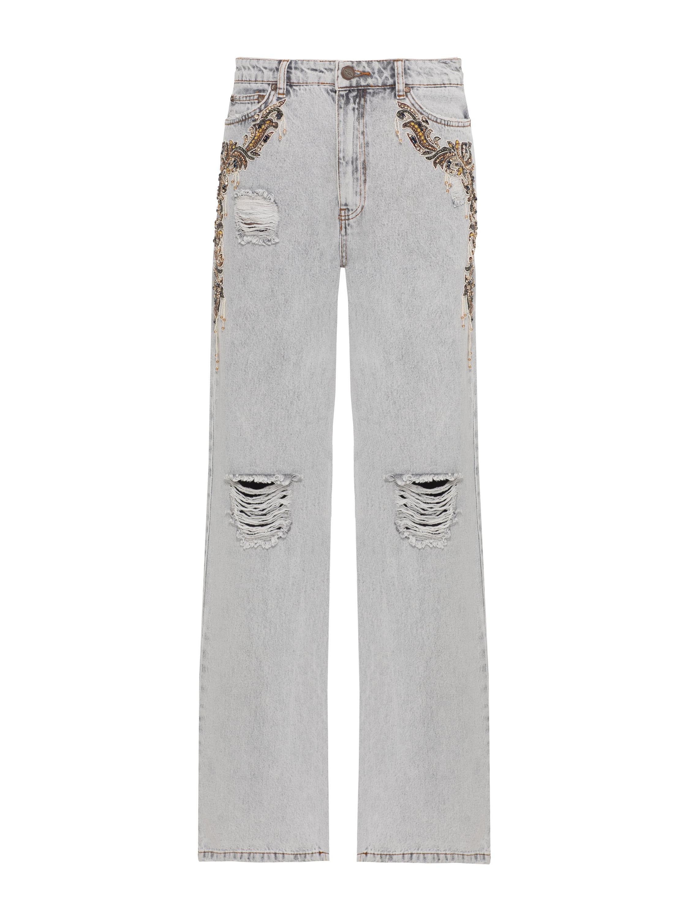 Light grey low-rise jeans are hand-decorated with luxurious crystal embroidery on the pockets. The basic model looks extraordinary while remaining versatile. Wide-leg jeans are an option that is perfect for any body type.