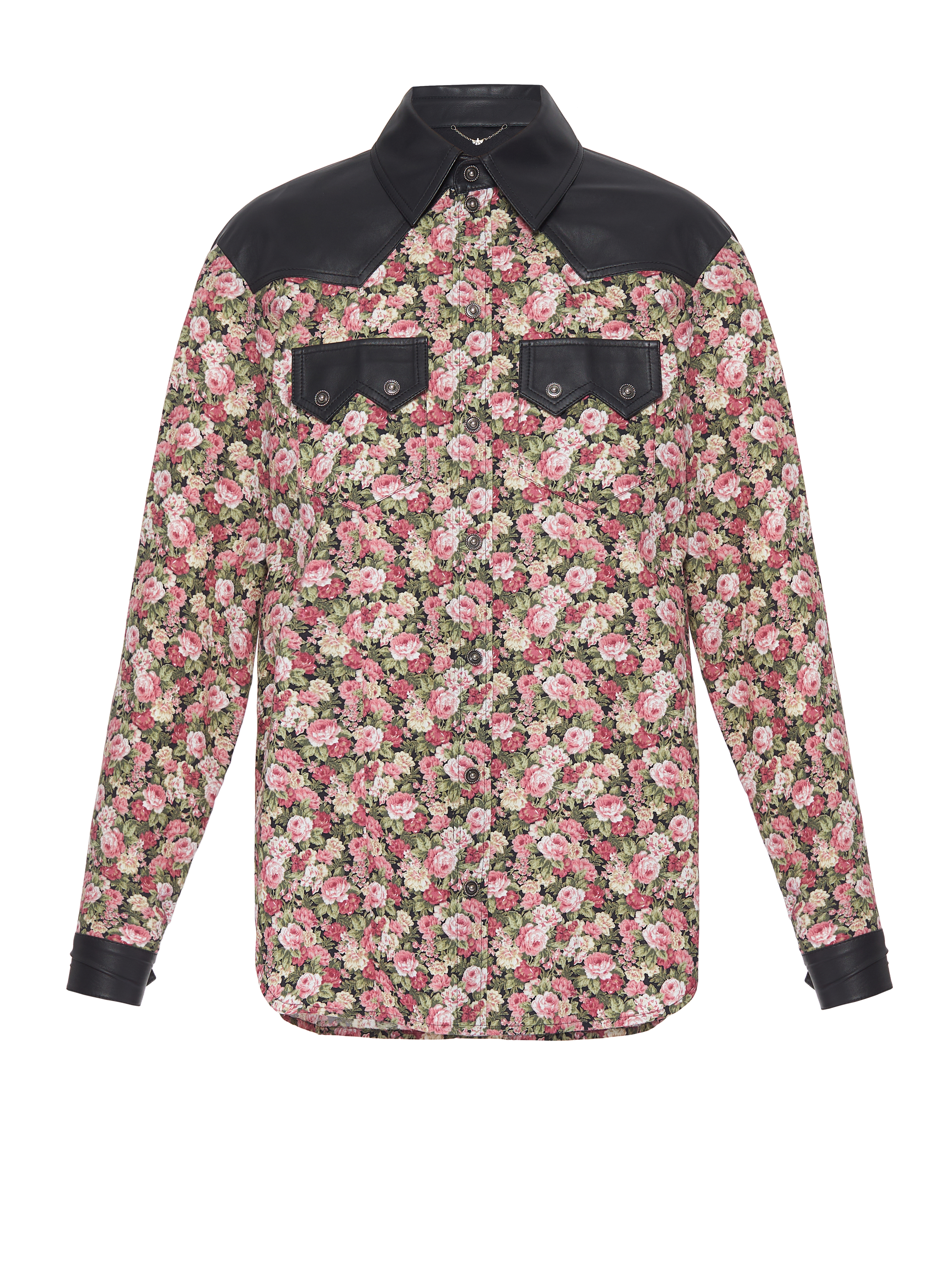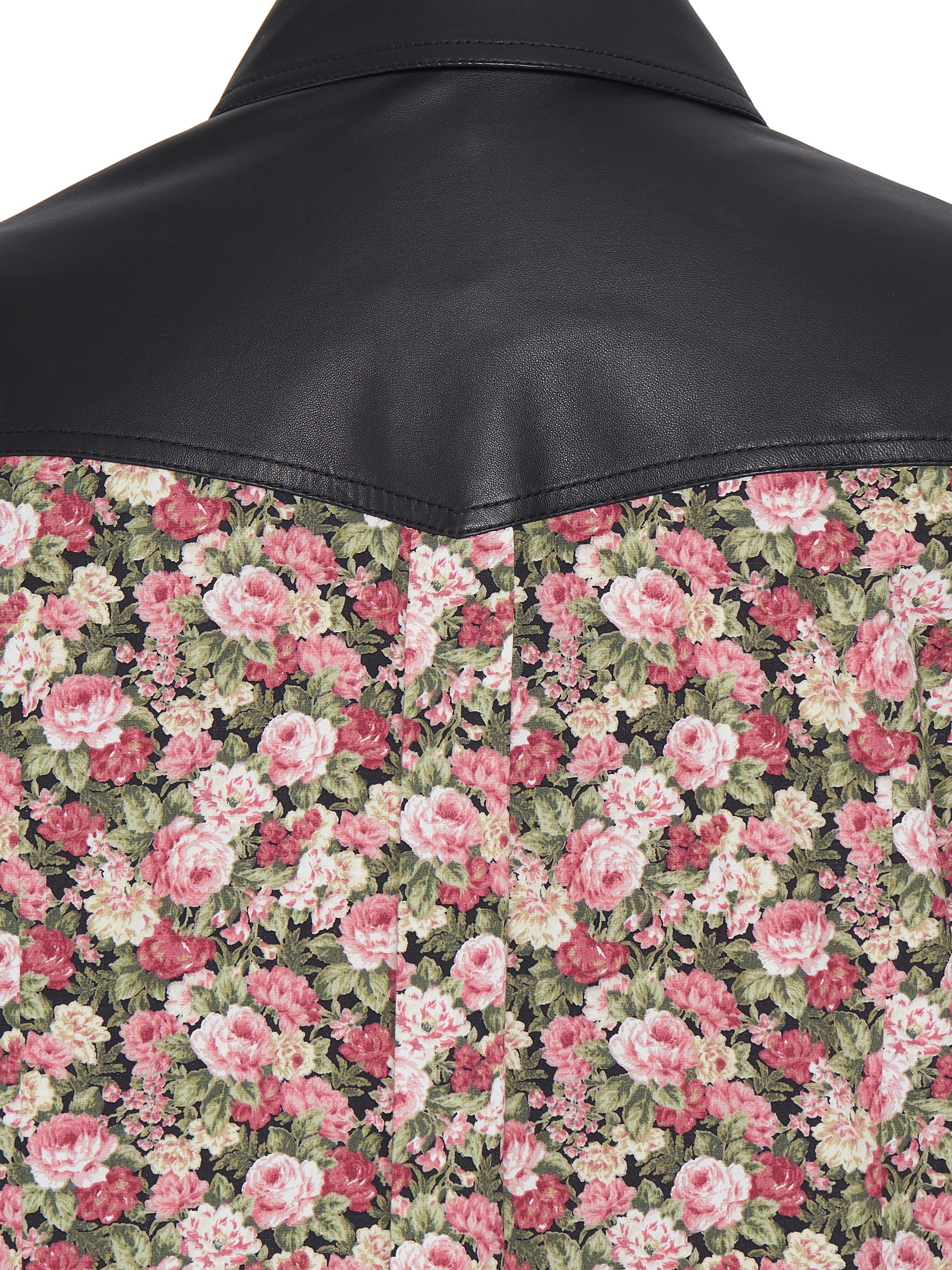 The pink shirt with a floral print is made of natural cotton and complemented by a black leather yoke and shaped leather flaps on the pockets. The model fastens with snaps at the front.