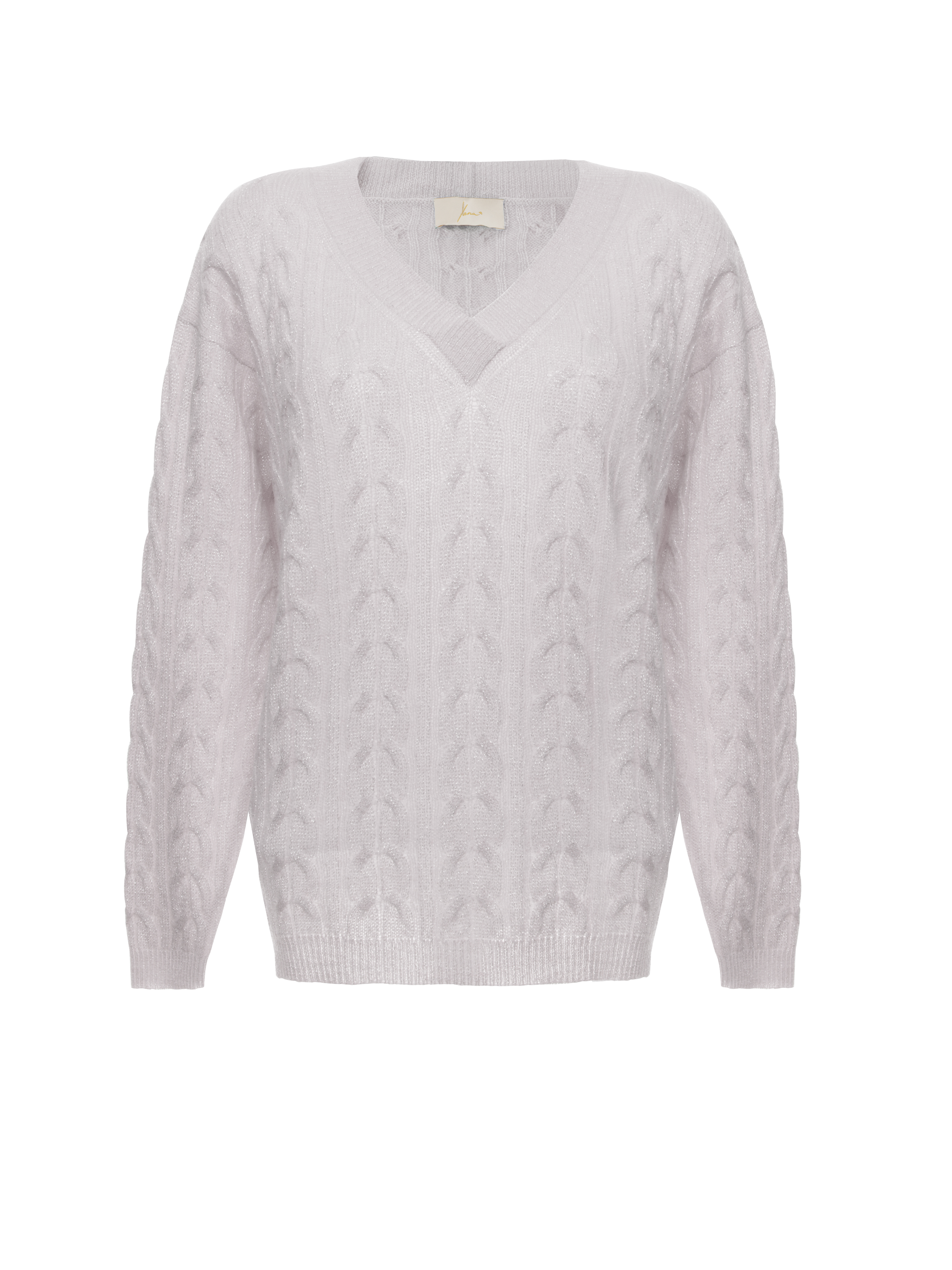 A cozy pink cable knit pullover made of natural cashmere with lurex and complemented with a V-neckline.