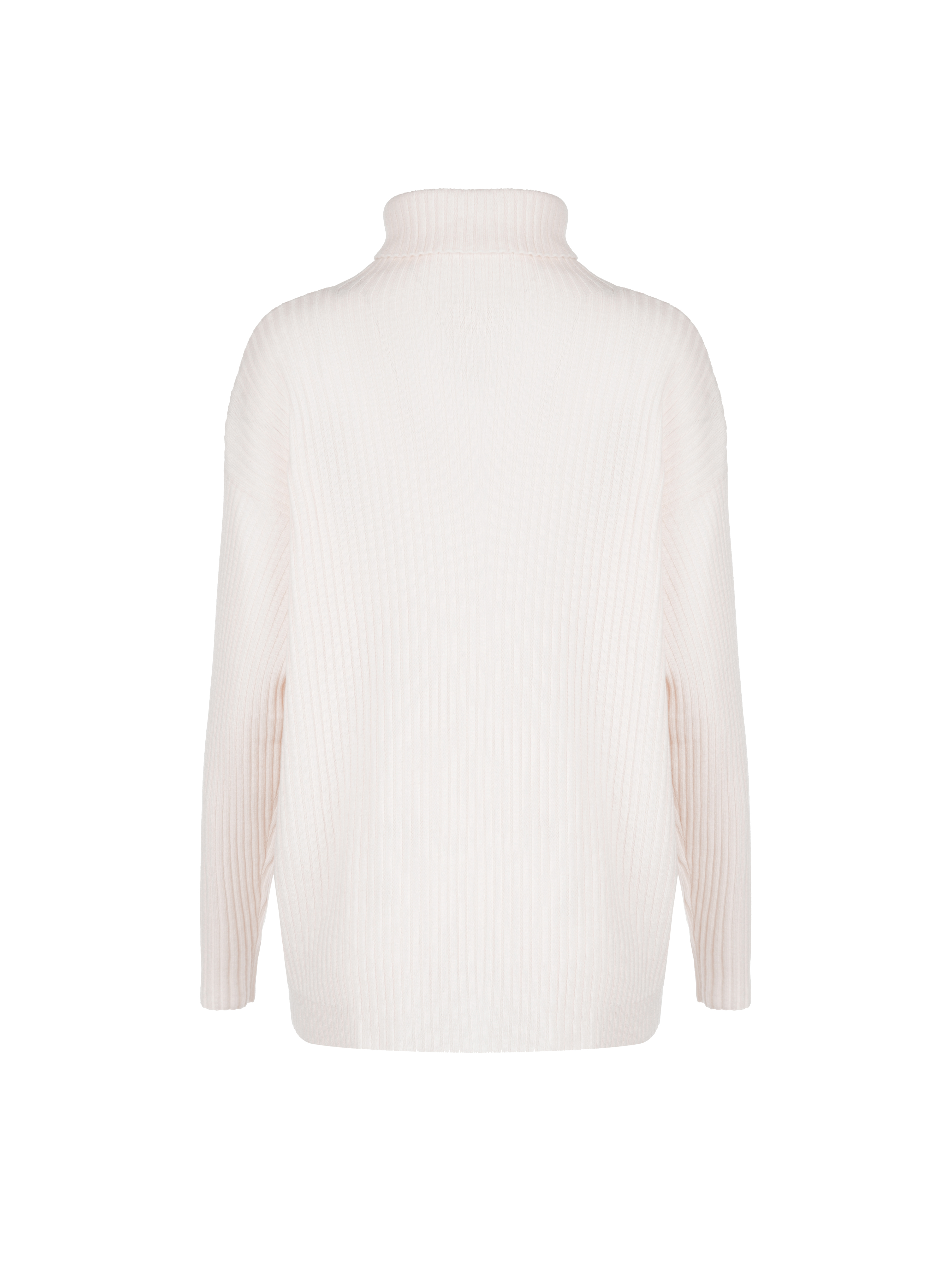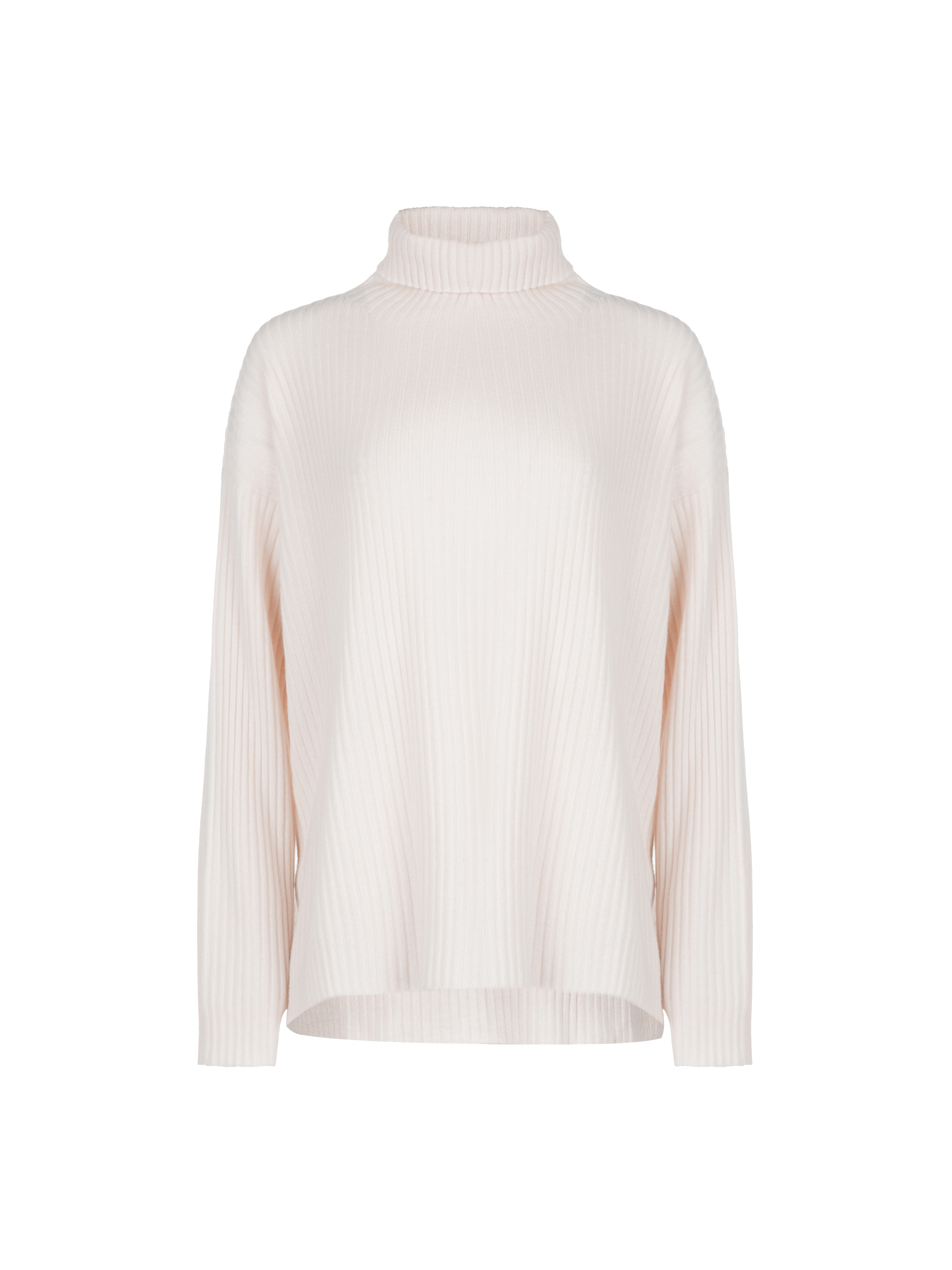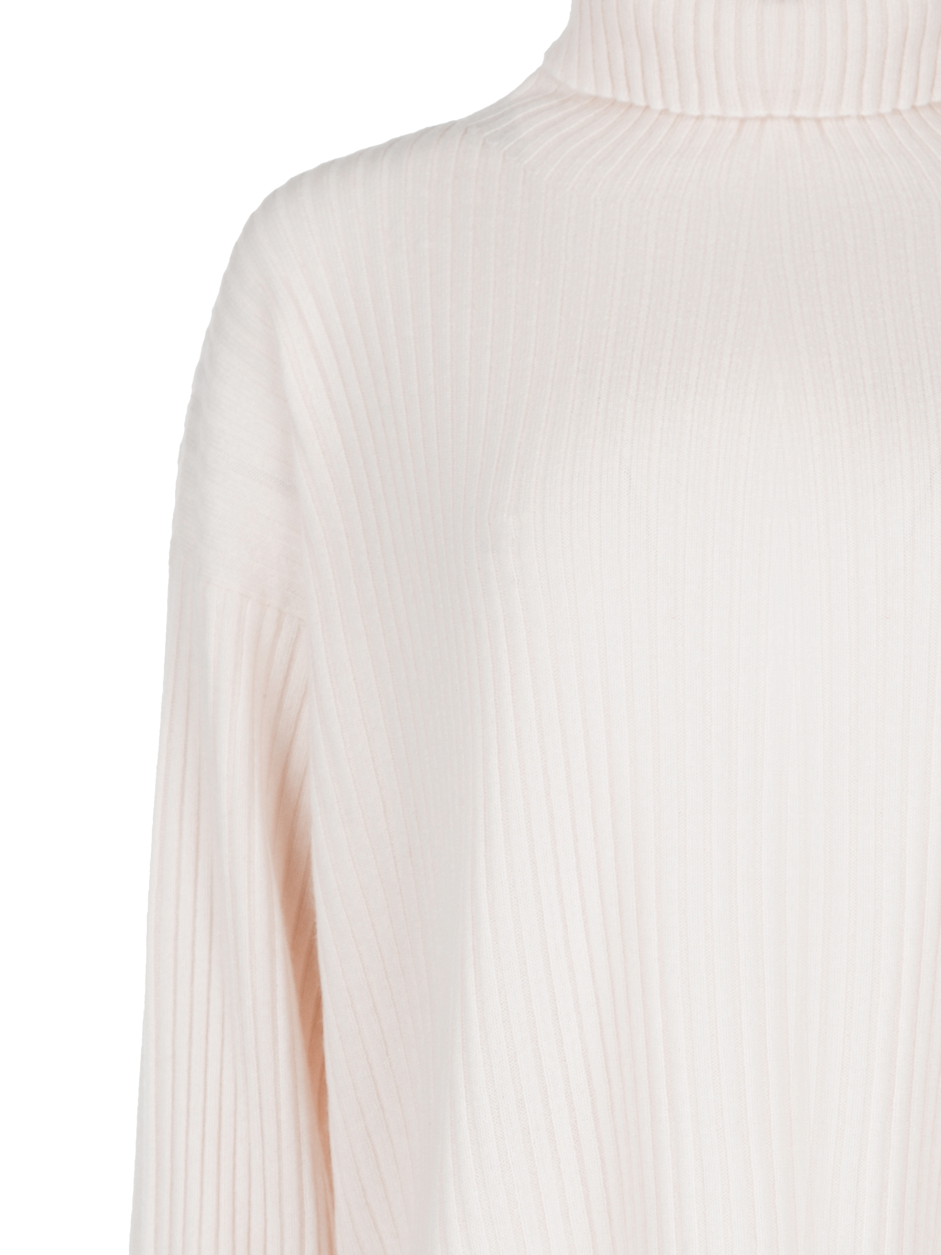 A pink oversized turtleneck sweater will serve as a good base for everyday looks and will keep you warm on cold days. The model is made of ribbed natural cashmere.