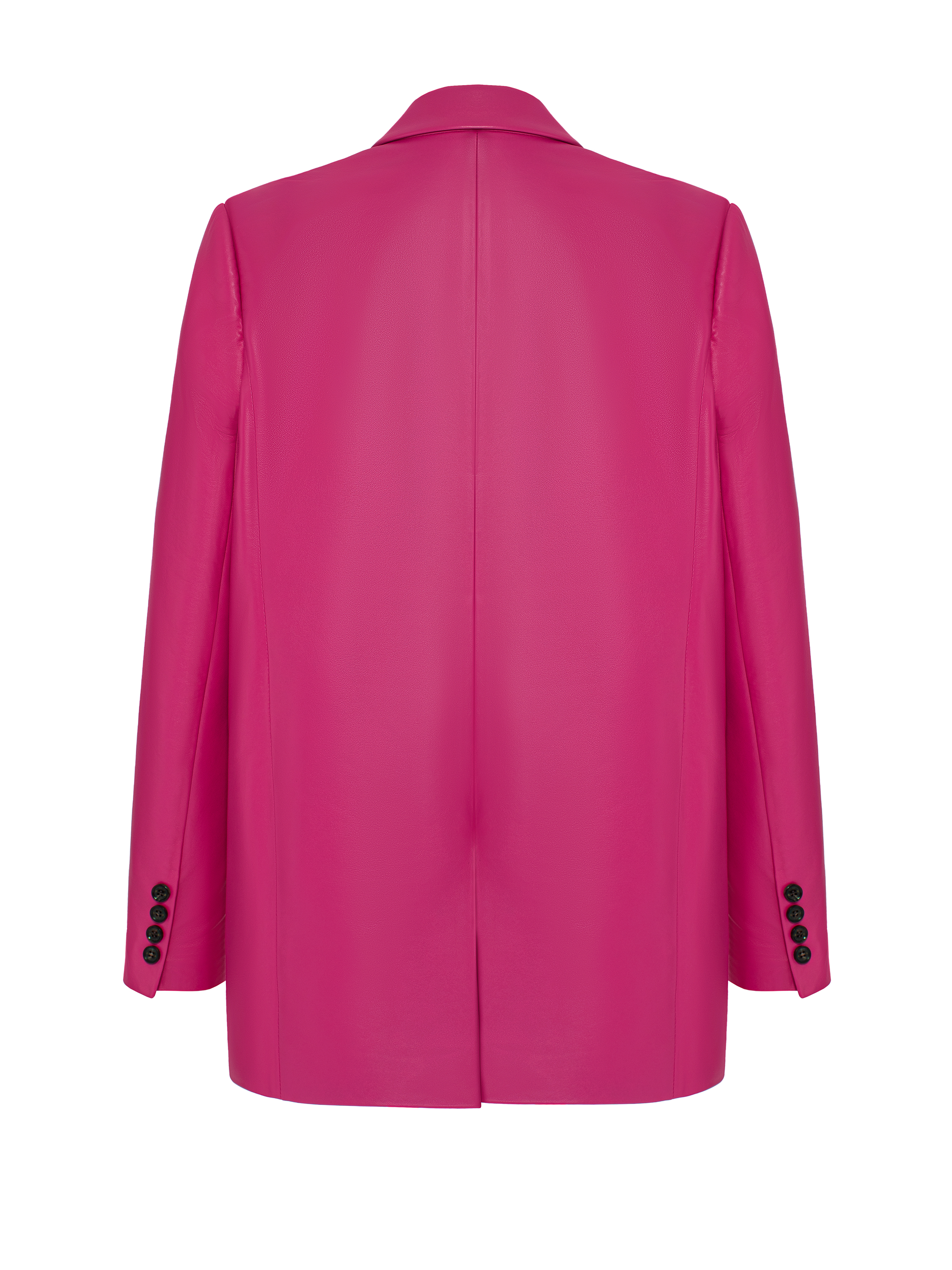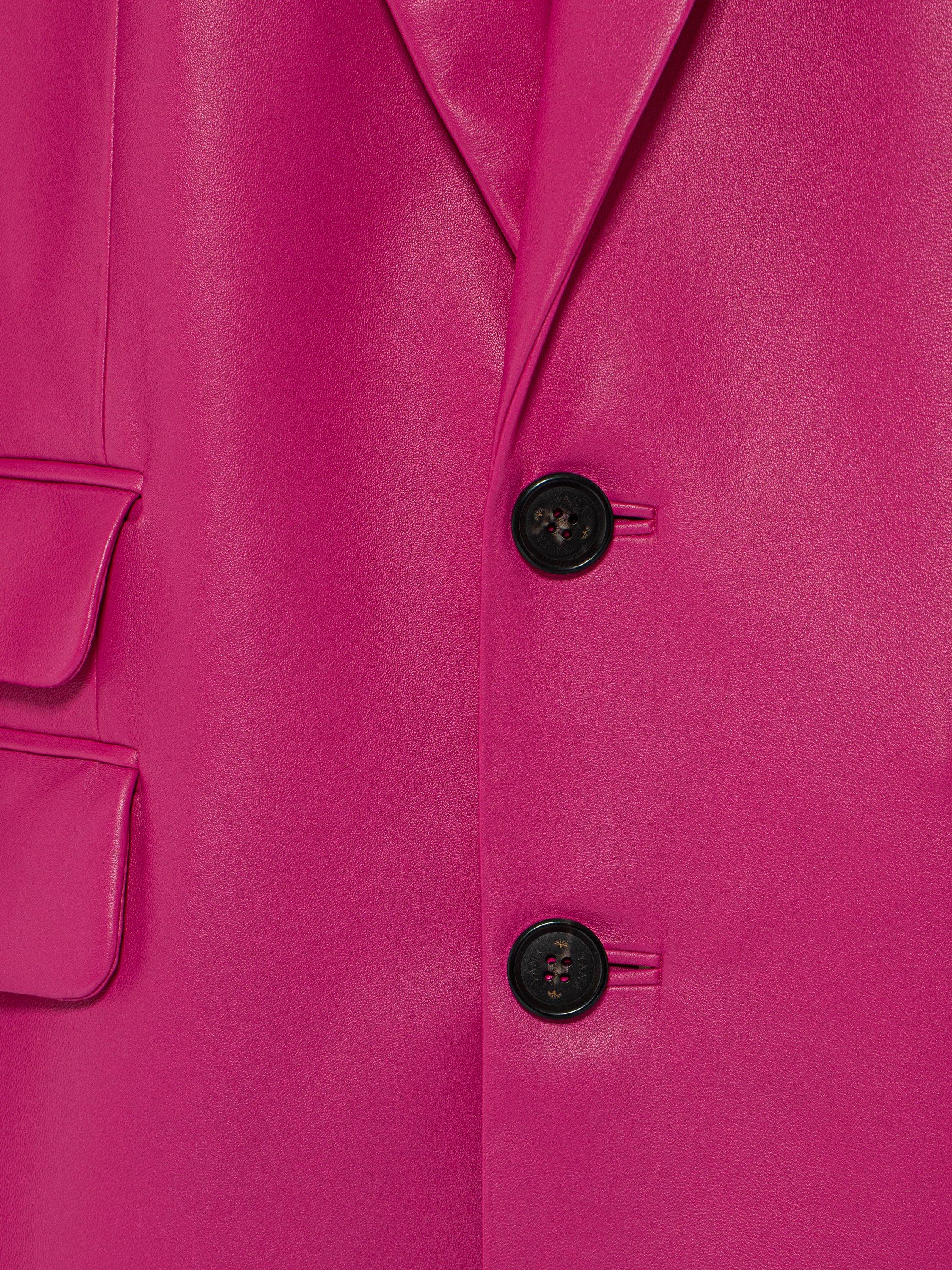 A bright pink single-breasted straight-cut jacket is made of natural smooth leather. The model is complemented by side flap welt pockets and shaped lapels.