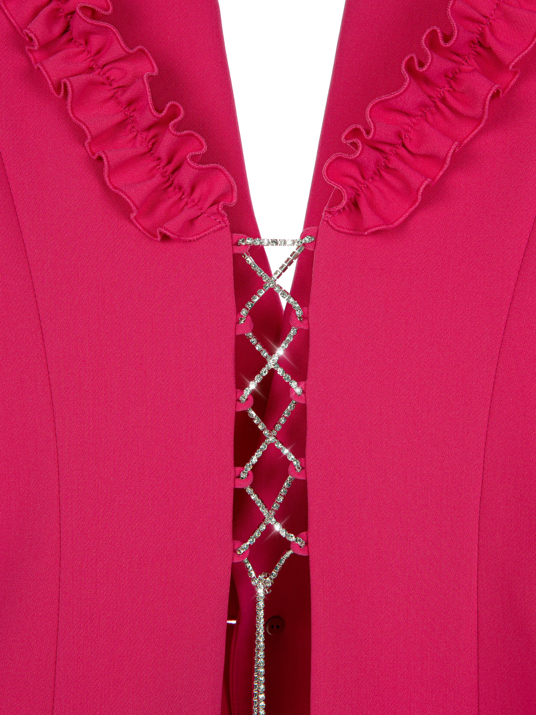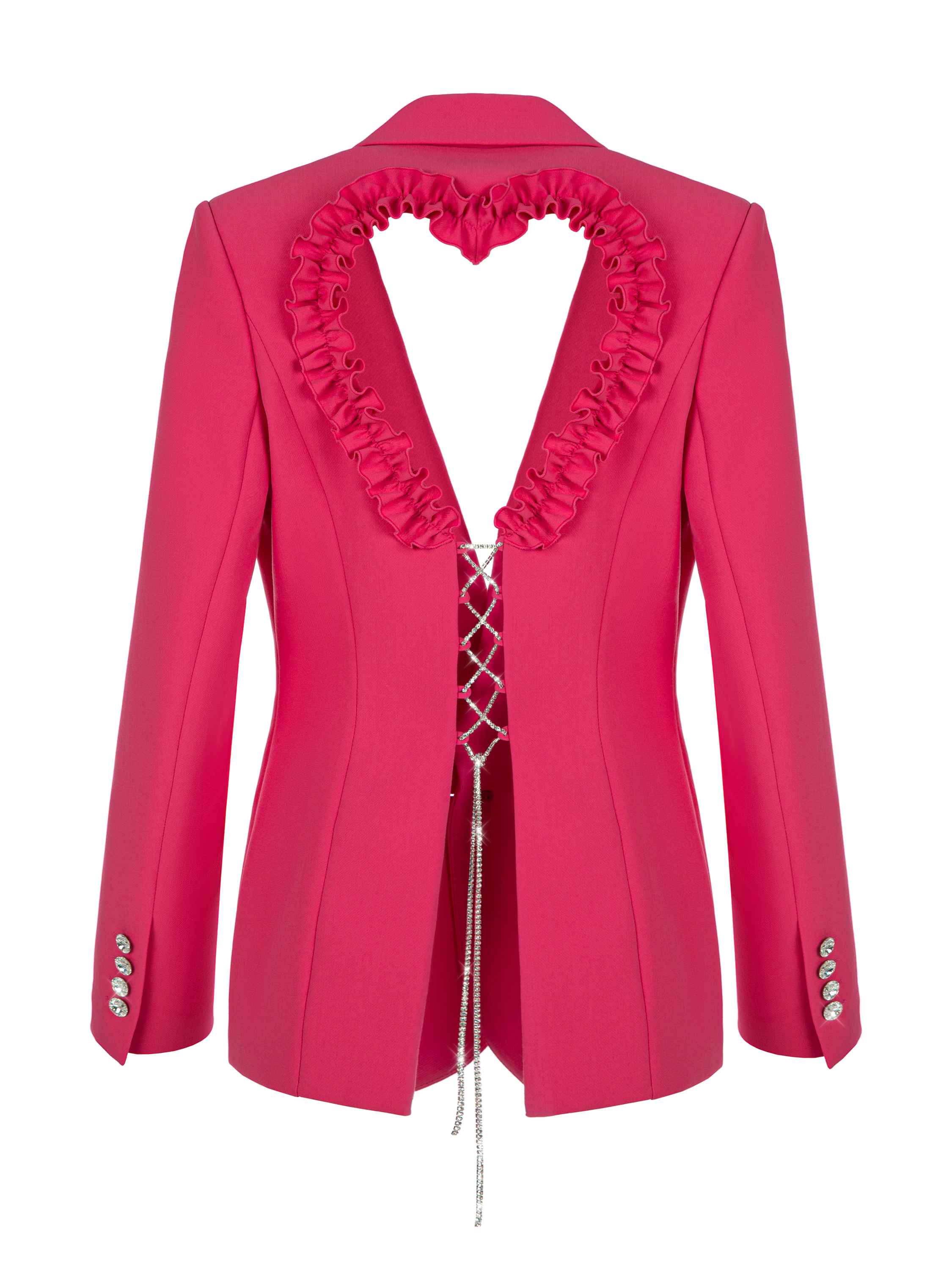 Bright pink single-breasted blazer with silk lining and a notched collar. The piece is complemented by a heart-shaped cutout on the back. The cutout is trimmed with tone-on-tone ruffles and lacing made of shimmering rhinestones. Fastens with a large crystal button.