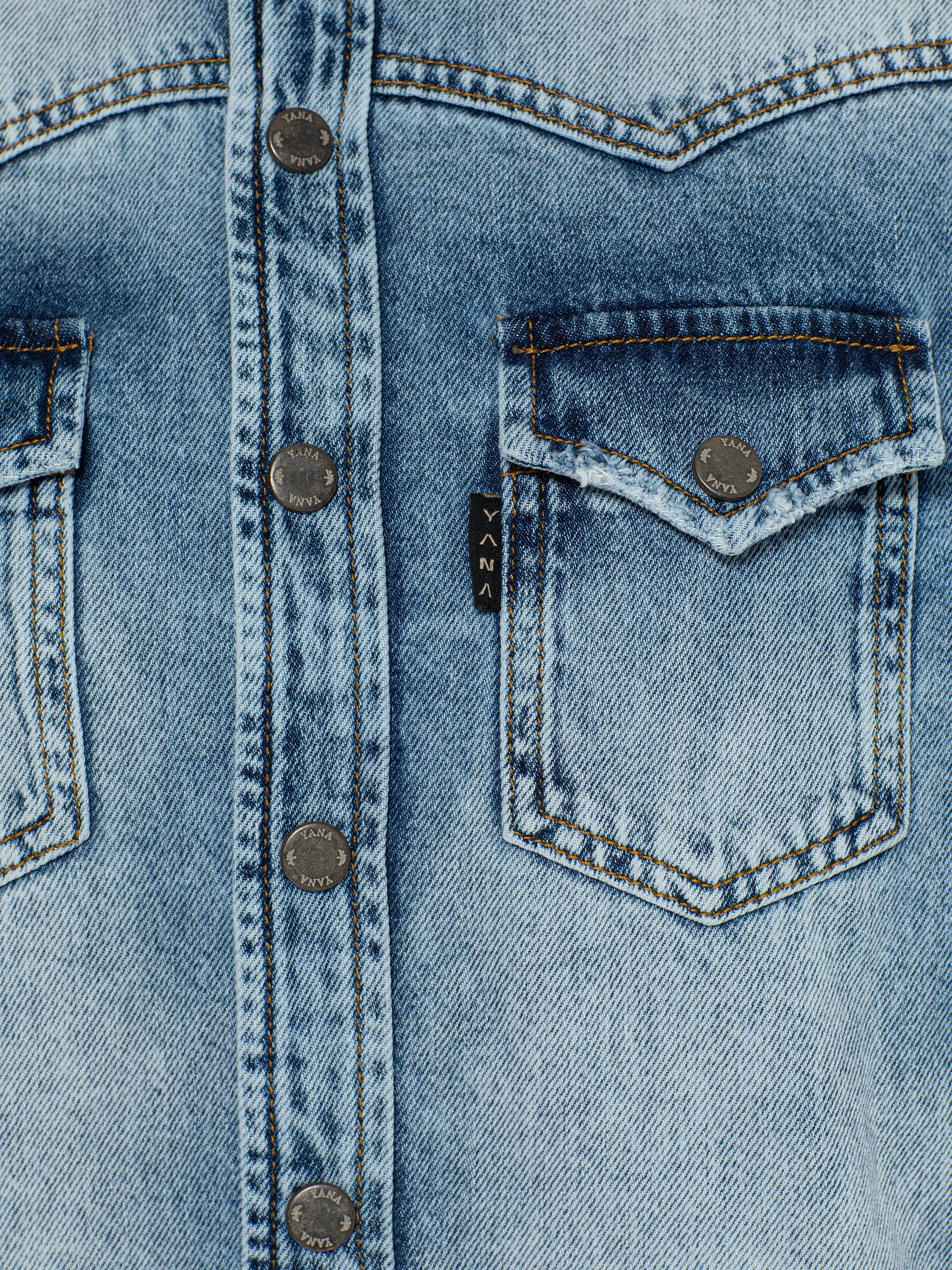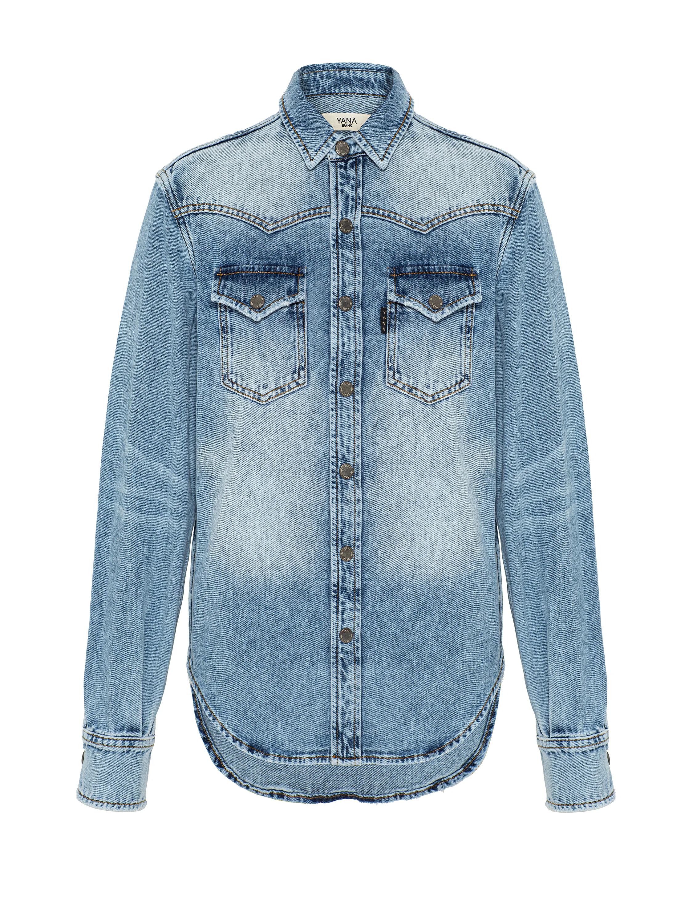 An oversized light blue denim shirt with distressed details. A classic model with a turn-down collar and large patch pockets on the chest. Pair it with your favorite jeans and cowboy boots from Yana Dress.