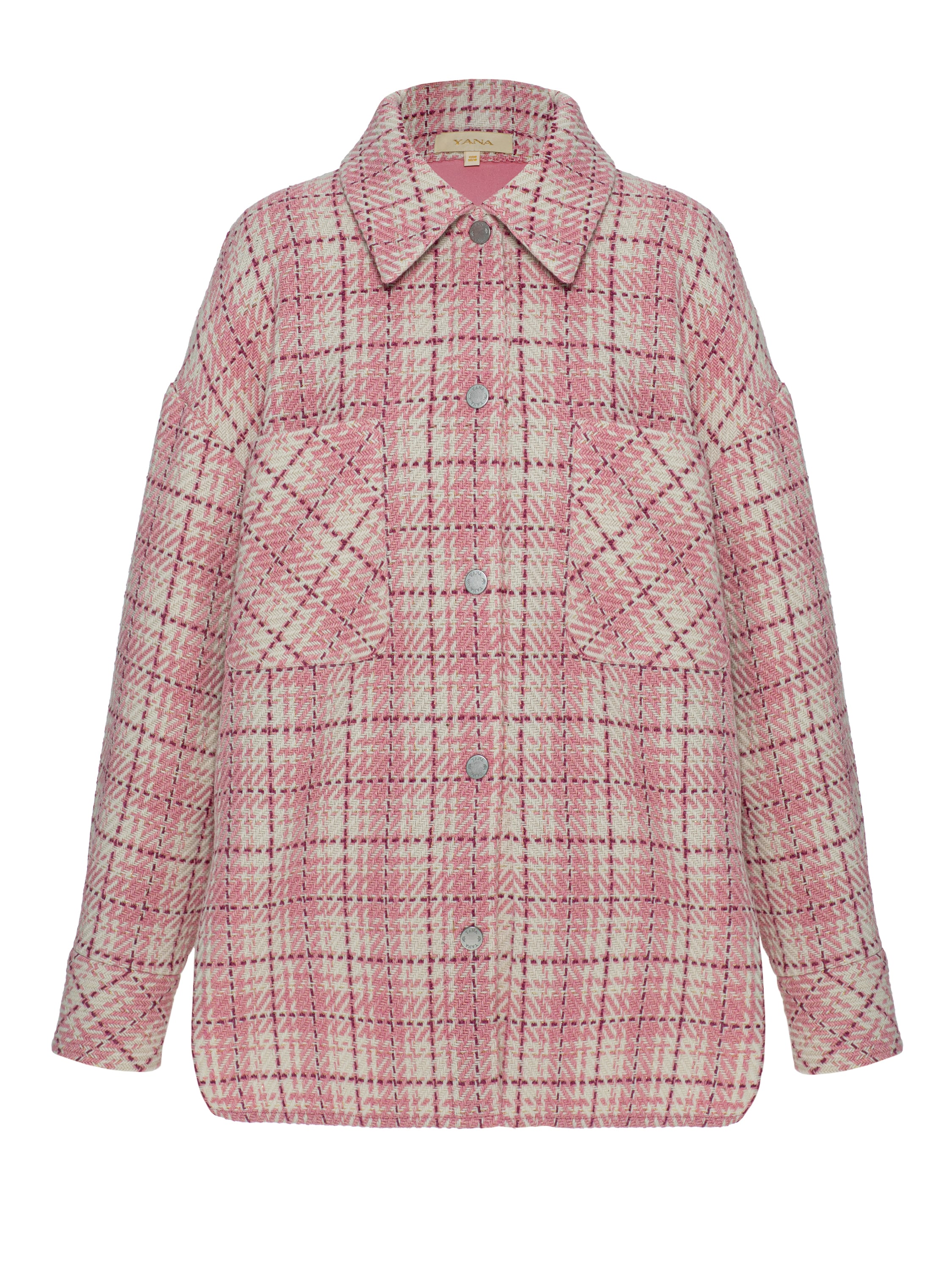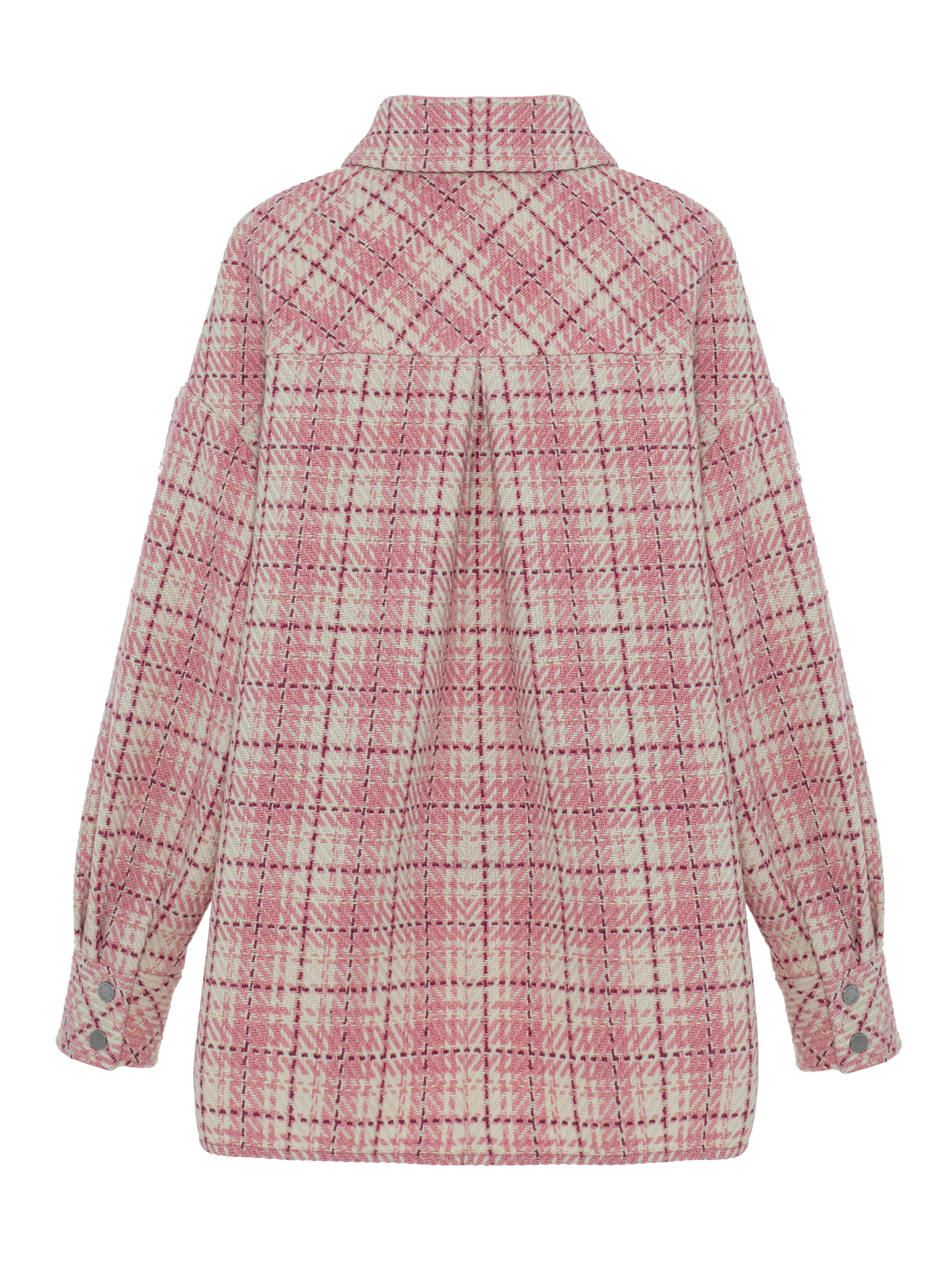 The loose pink checked shirt is made of tweed fabric. Snap-button fastening at the front. Two patch pockets on the chest at the front.
