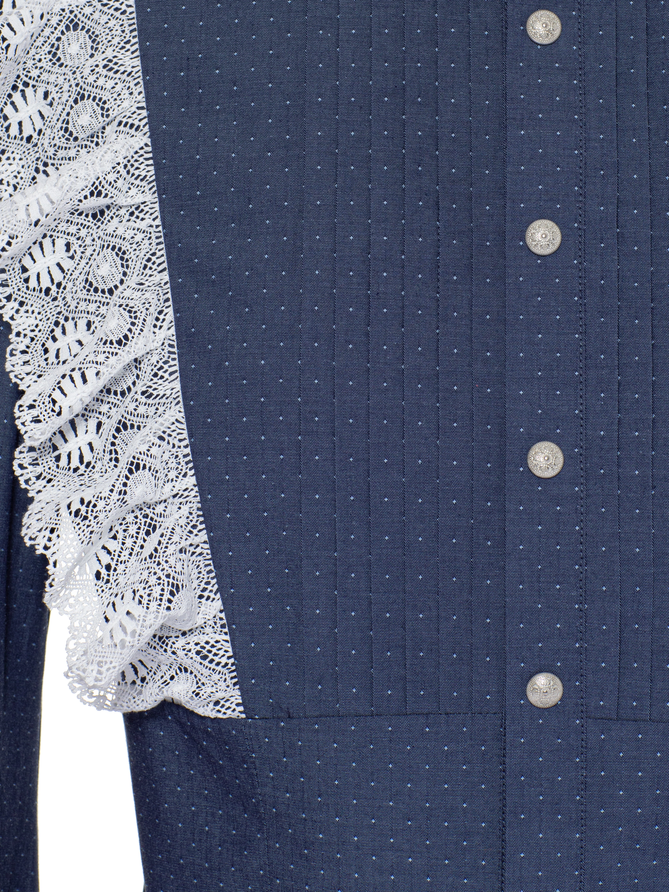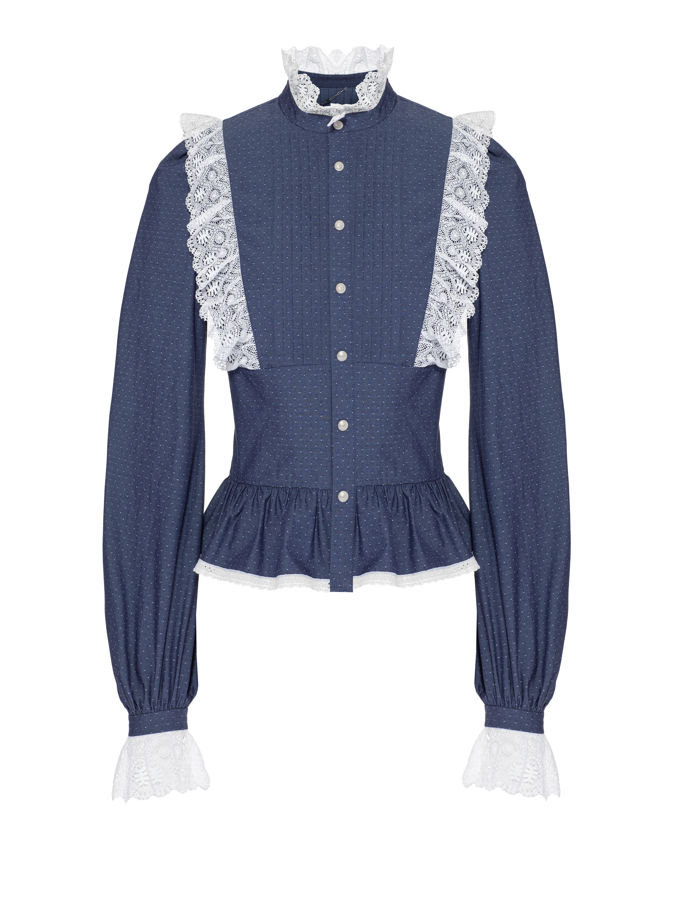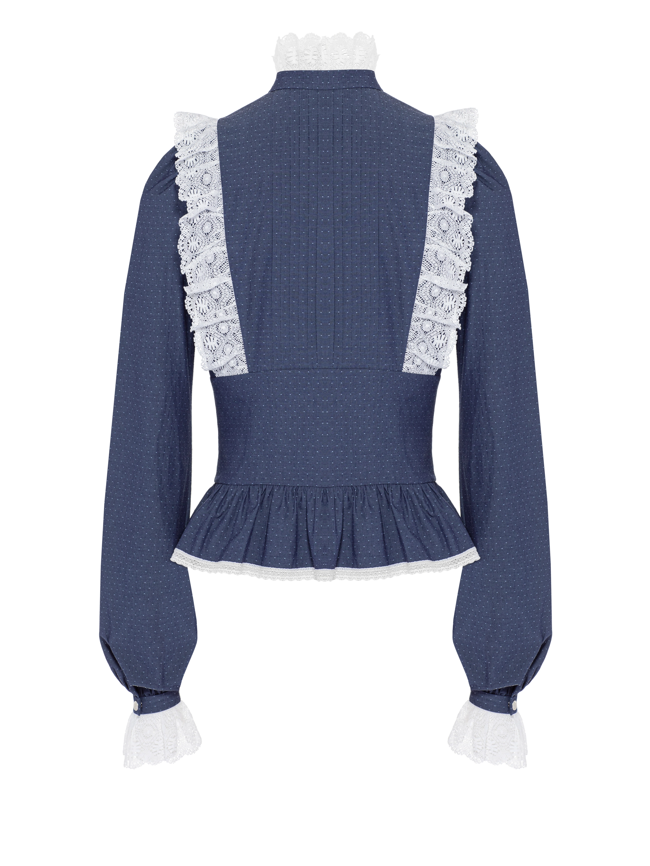 A blue blouse with a stand-up collar is made of soft cotton with a small light blue polka dot pattern. The model is complemented by pleats at the chest, ruffles, and trim made of semi-sheer white lace. It fastens with snaps at the front.