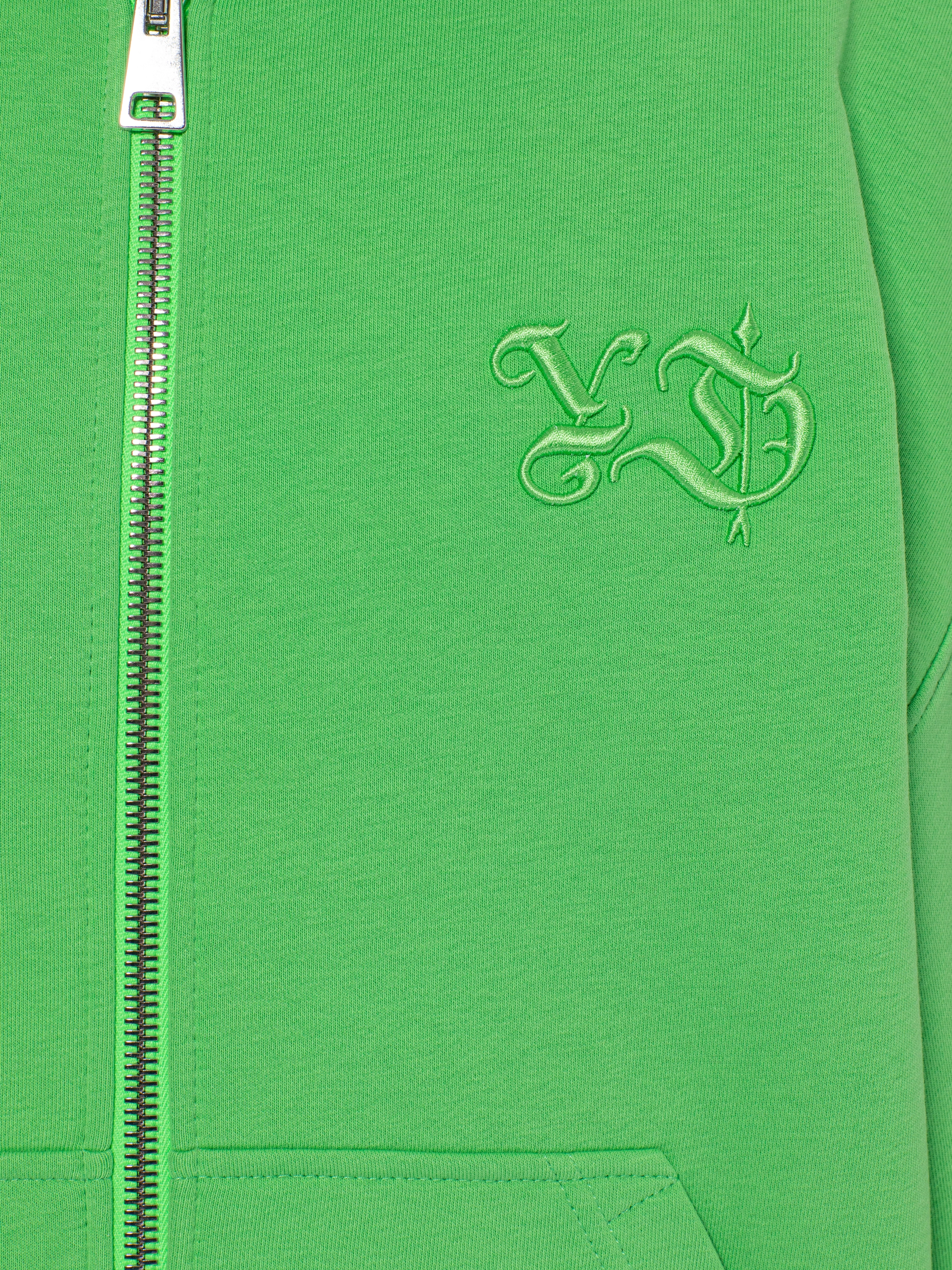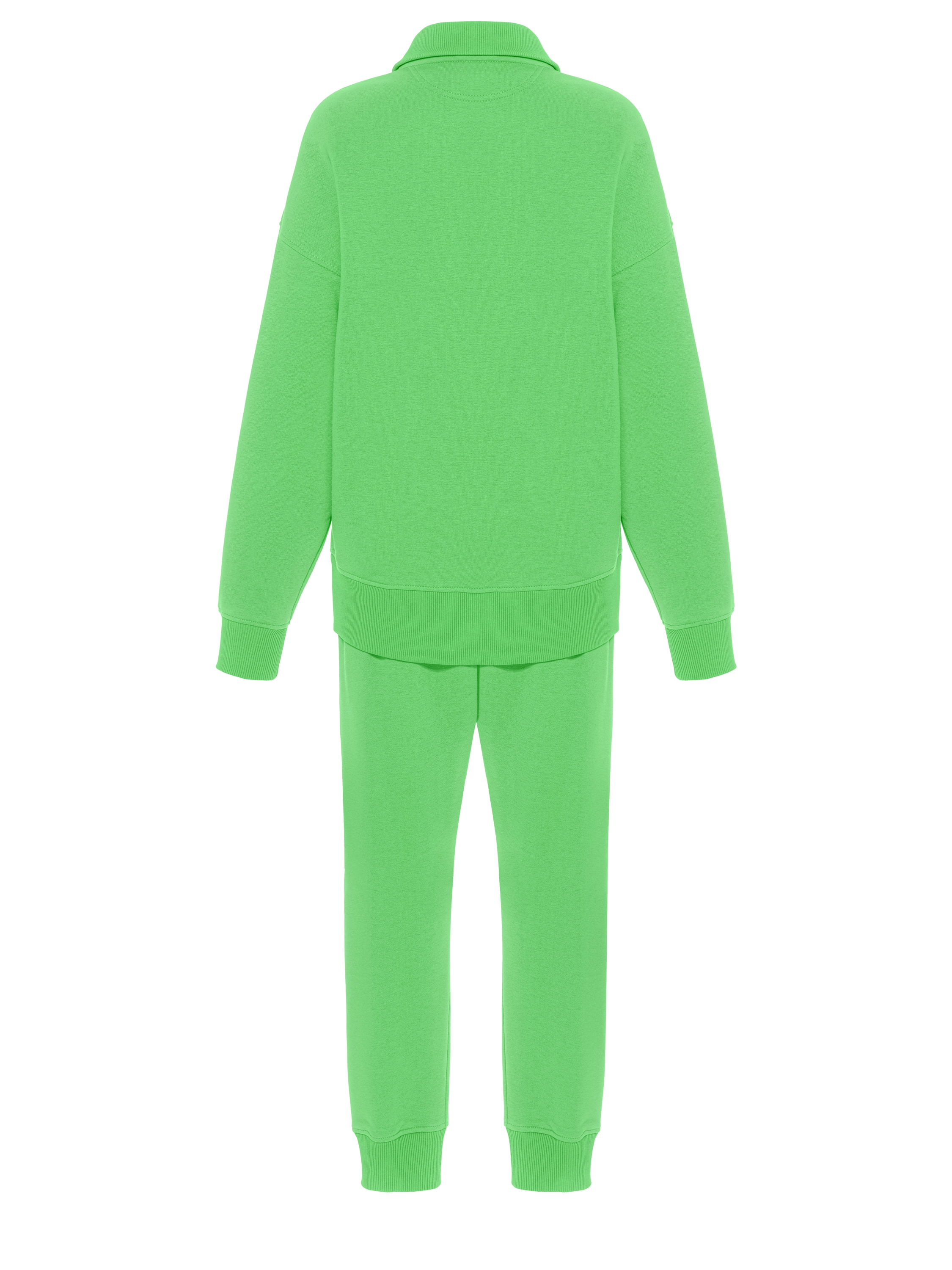 The unisex knit tracksuit is made of light green jersey and consists of a zip-up sweatshirt with a stand-up collar and track pants. The cuffs and collar are finished with a wide elastic band. The sweatshirt and the back pocket of the pants are decorated with tone-on-tone YD embroidery.