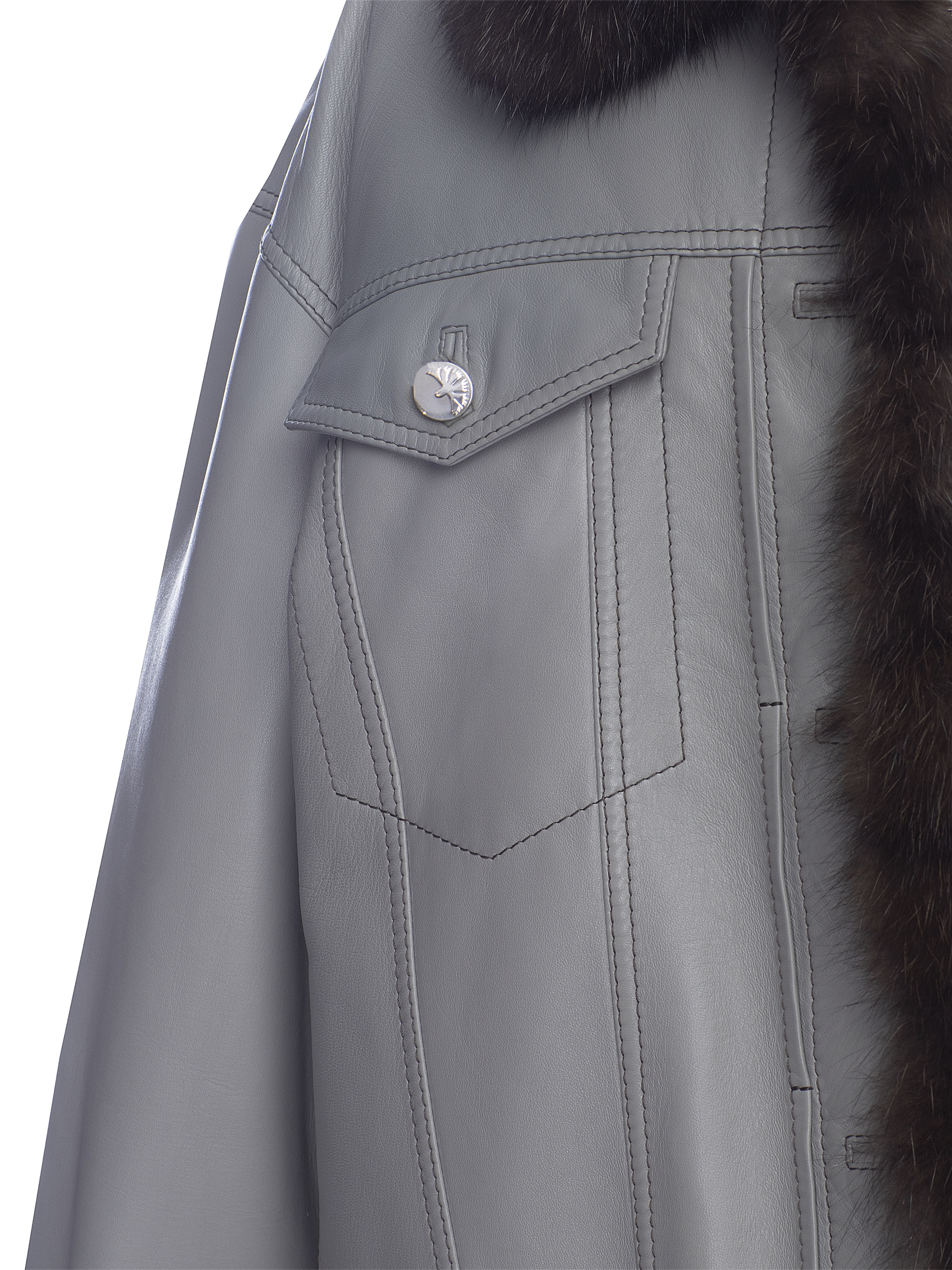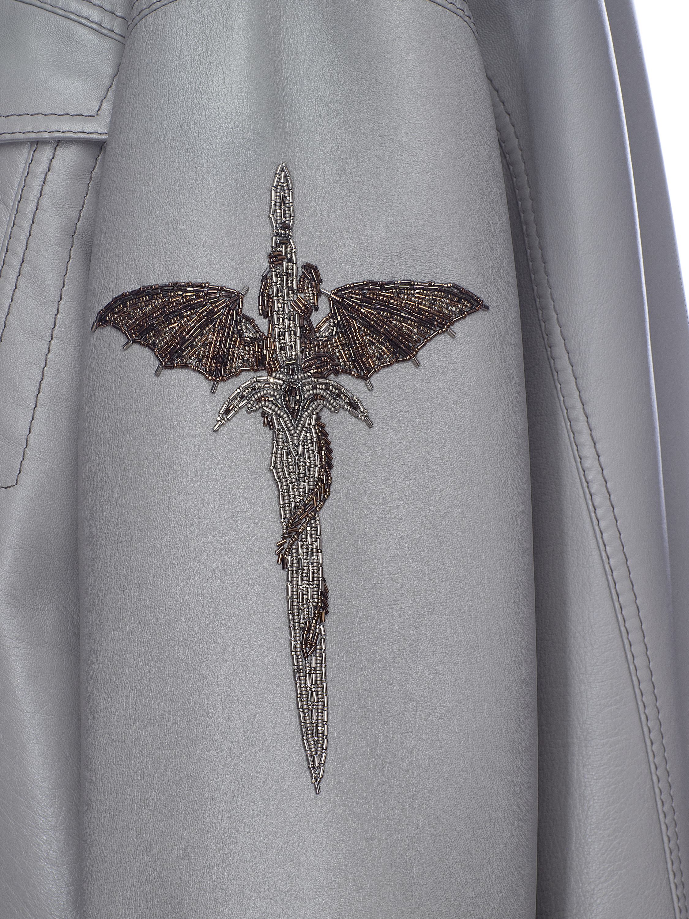 A jacket made of soft gray leather is lined with brown fur of Barguzin sable. On the sleeve there is hand-made bead embroidery in the shape of a sword.
