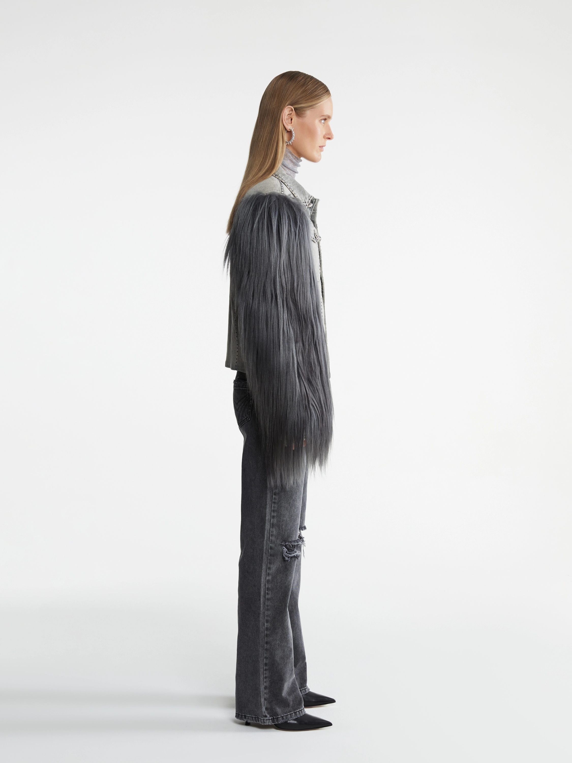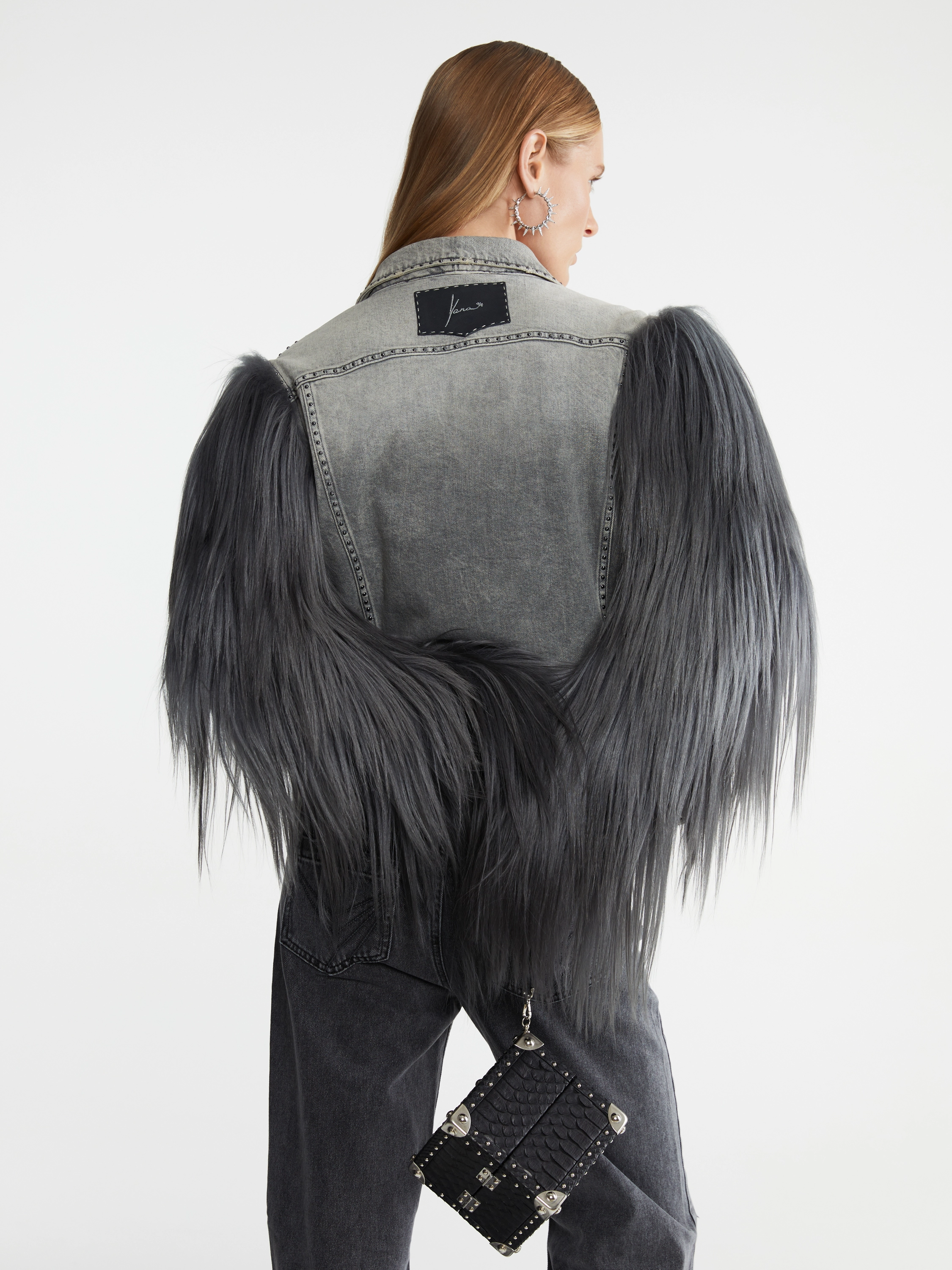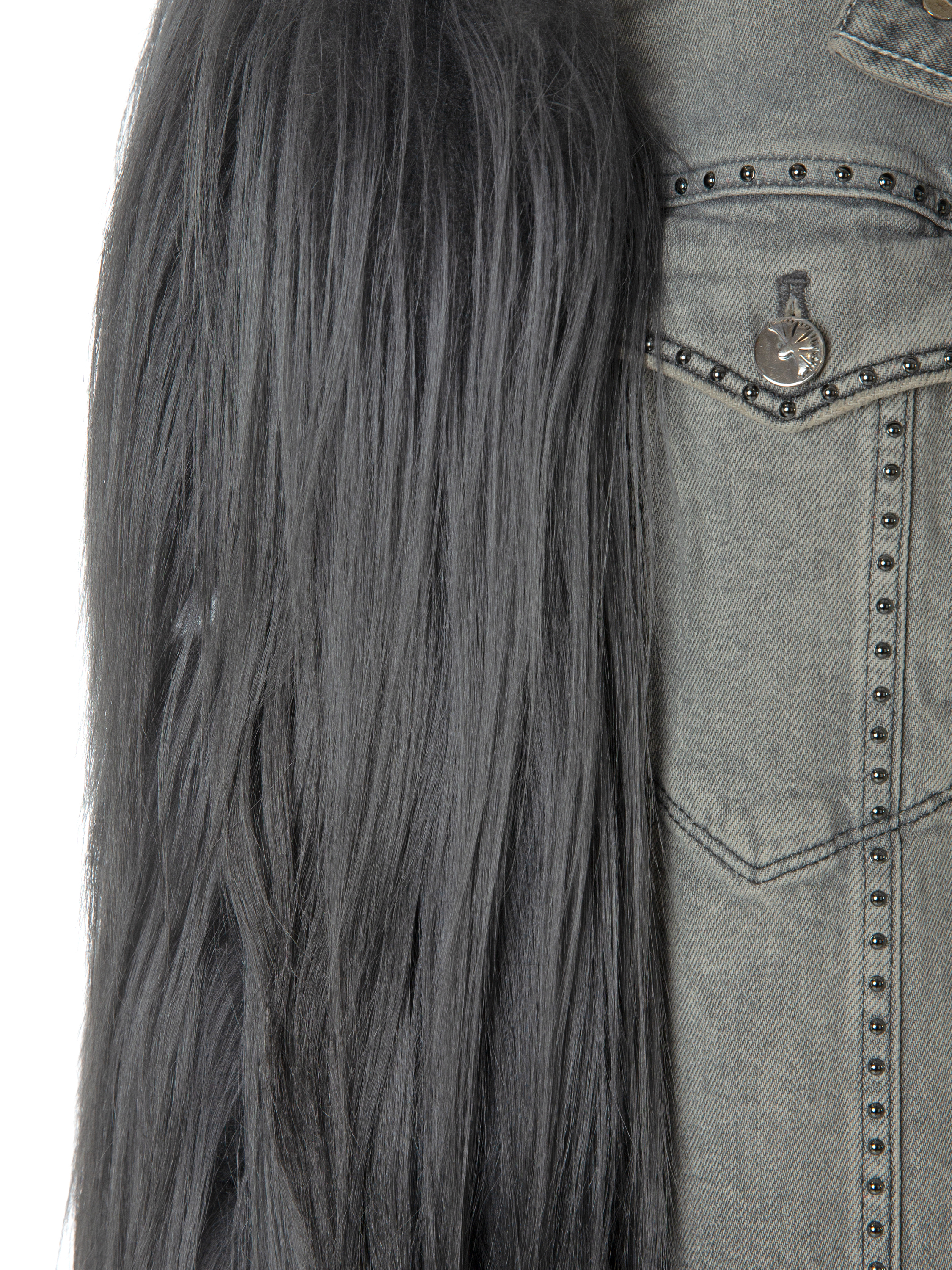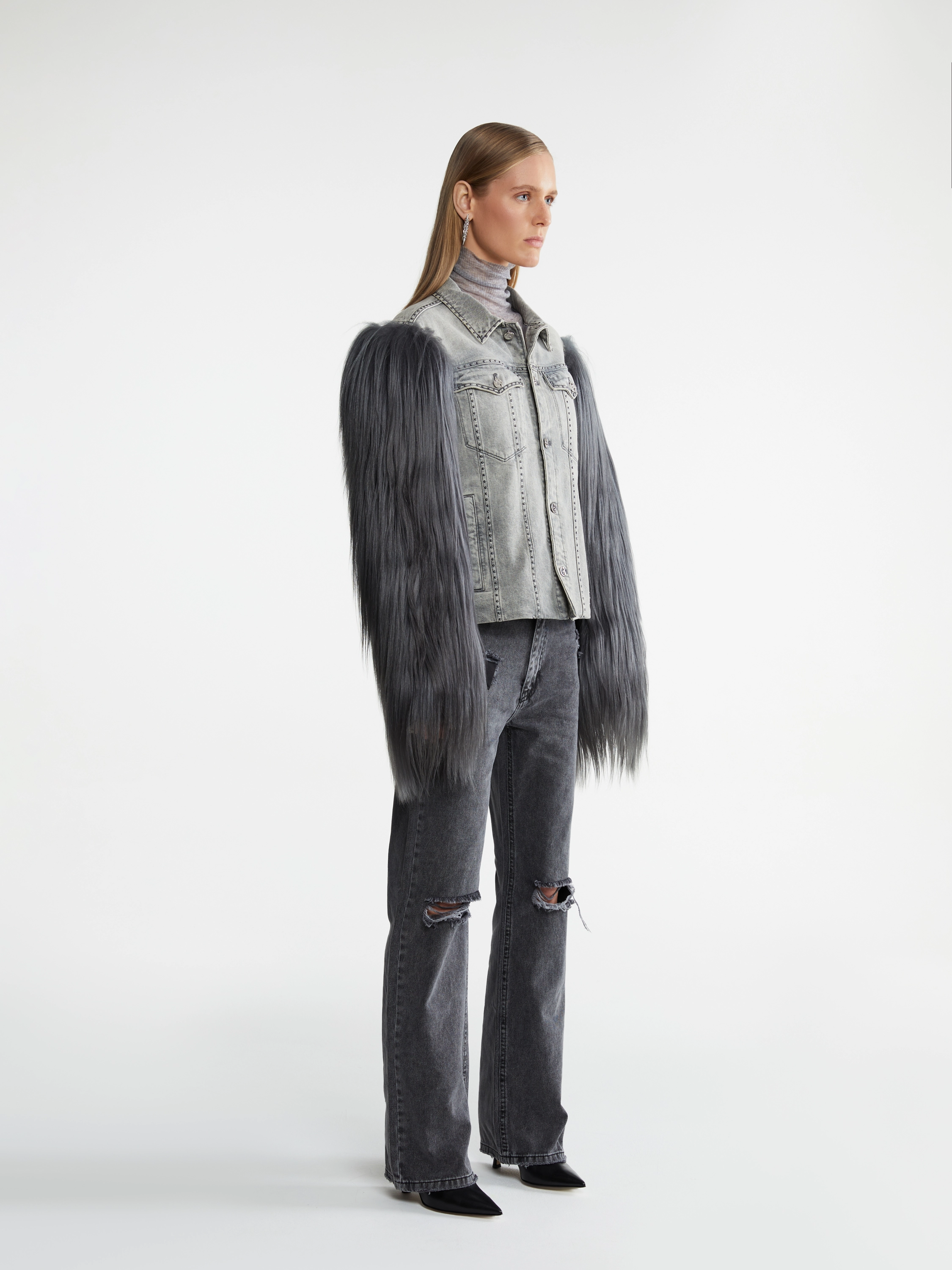 The denim jacket made of grey denim is complemented by decorative studs along the seams. The sleeves are made of natural graphite-colored yak fur. Two patch pockets on the chest and two welt pockets on the sides. The model fastens with silver-tone buttons featuring a cornflower, and has a leather brand logo patch on the back.