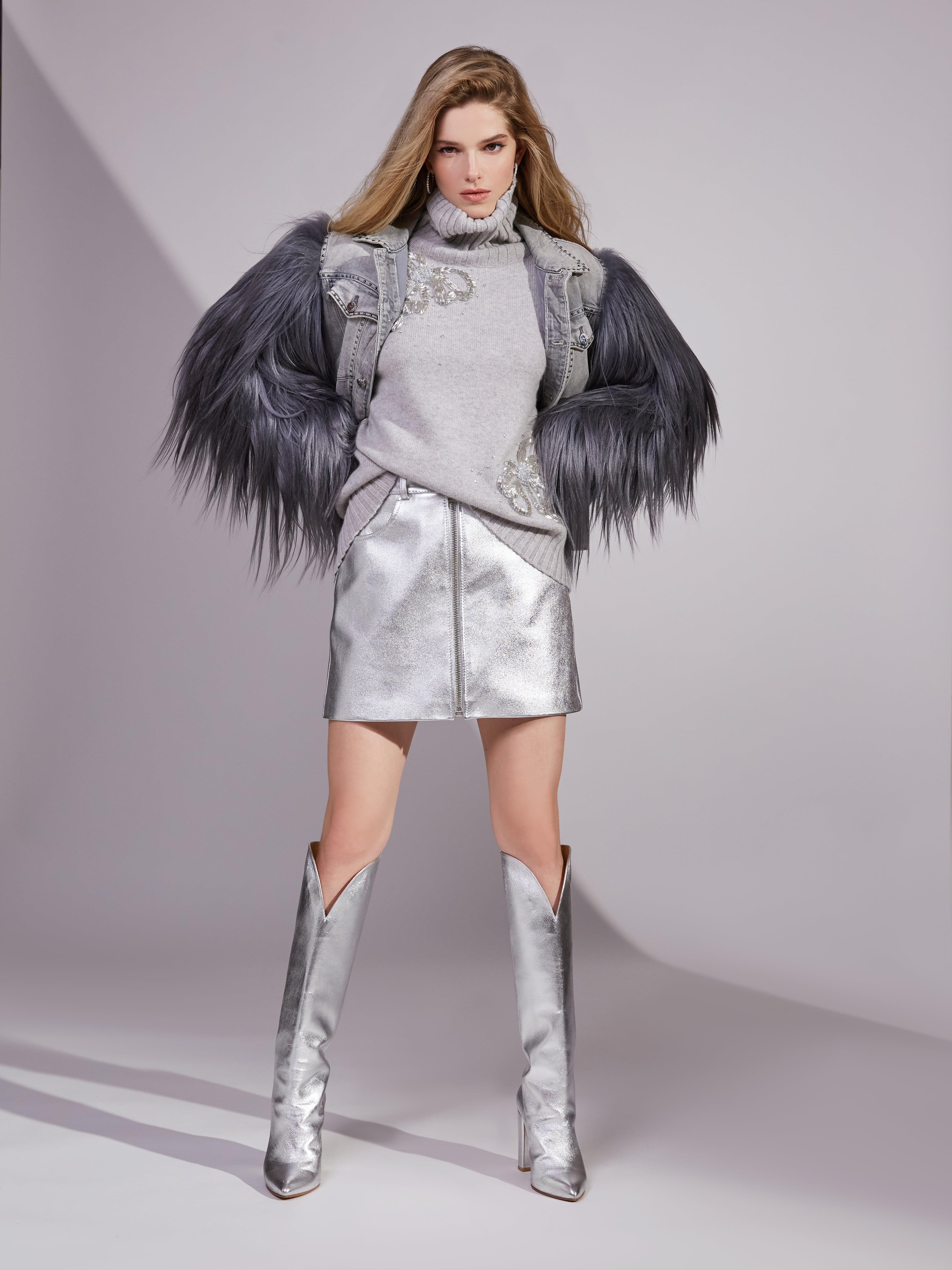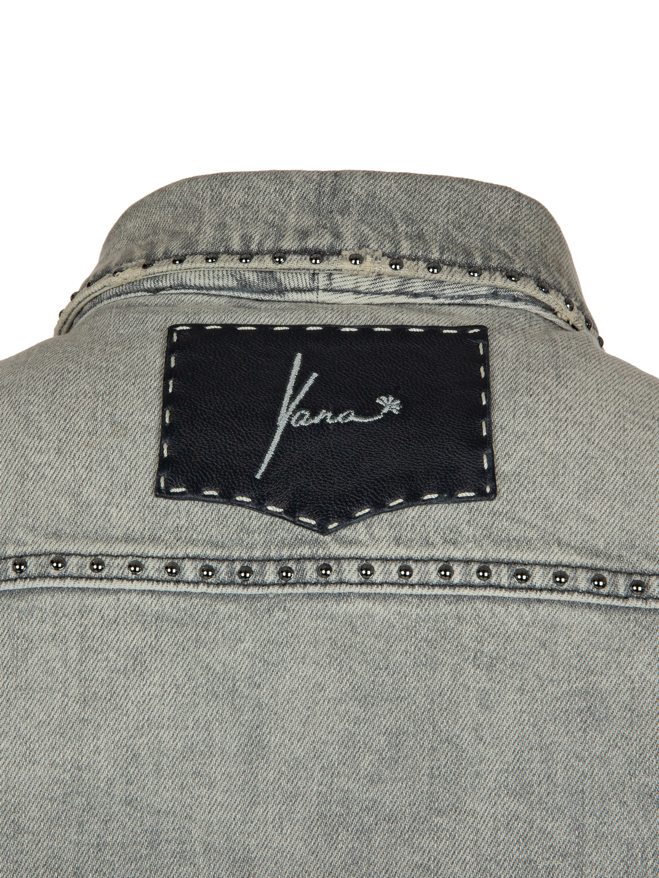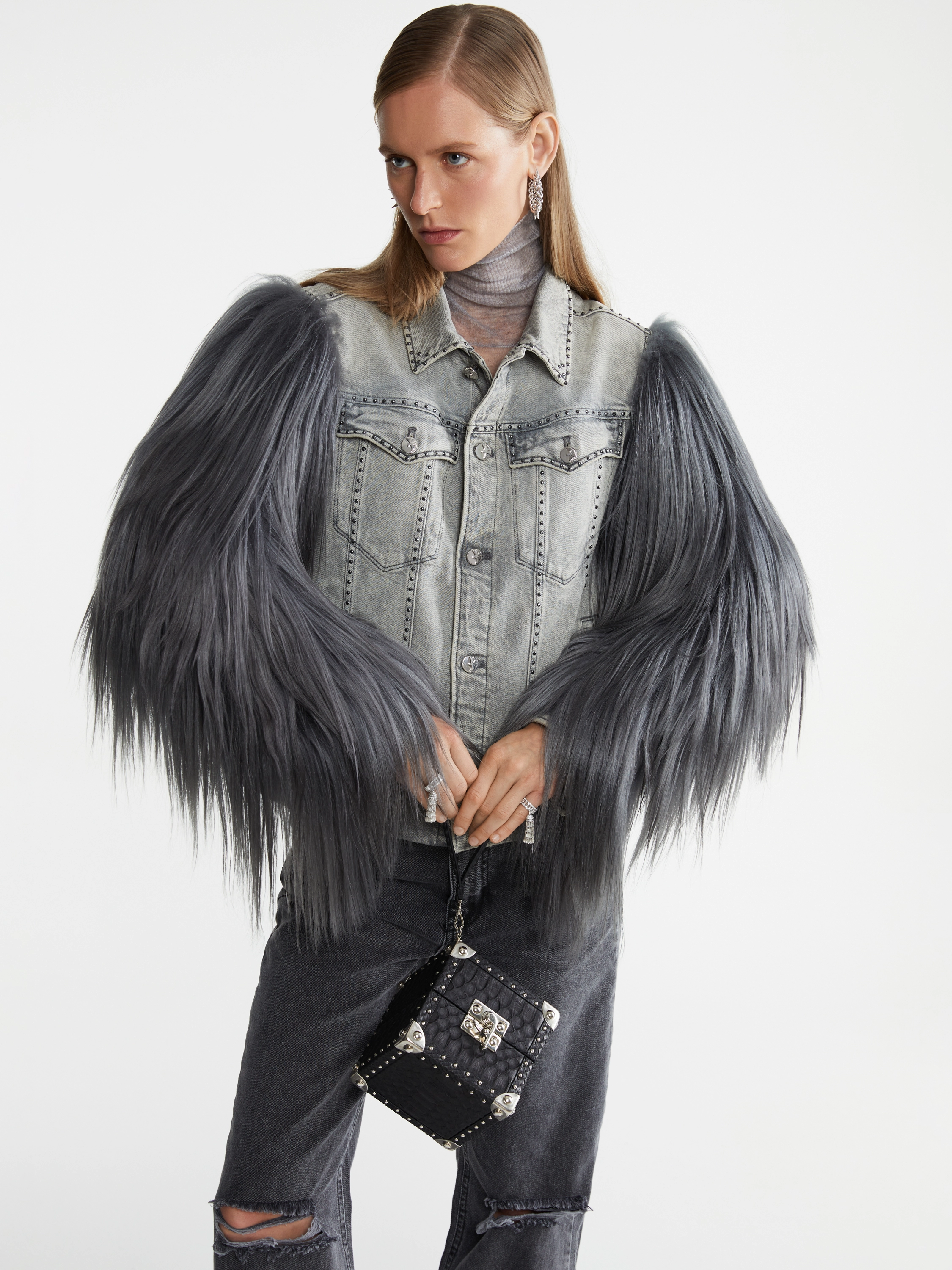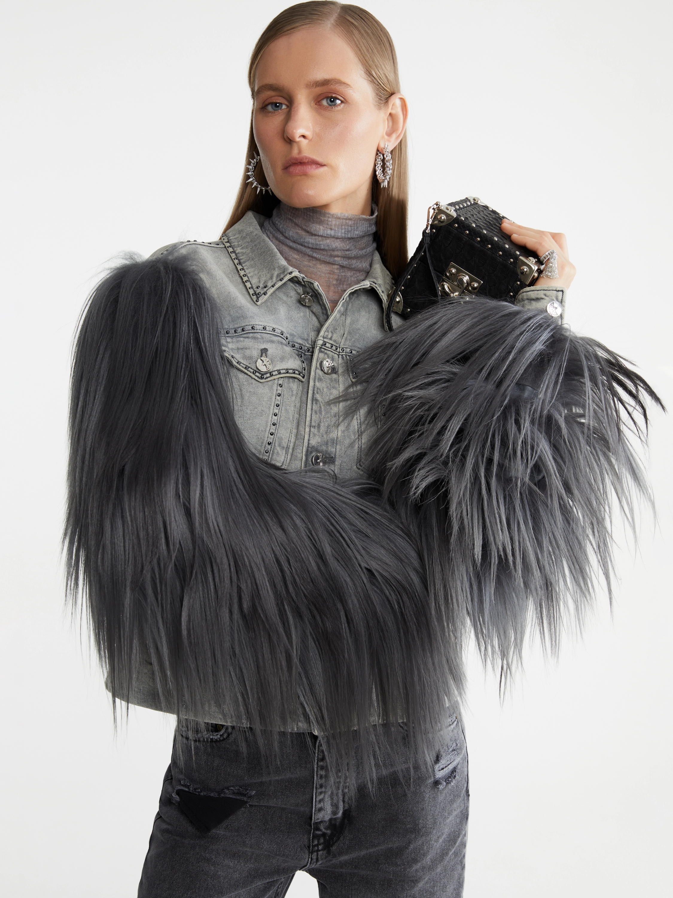 The denim jacket made of grey denim is complemented by decorative studs along the seams. The sleeves are made of natural graphite-colored yak fur. Two patch pockets on the chest and two welt pockets on the sides. The model fastens with silver-tone buttons featuring a cornflower, and has a leather brand logo patch on the back.