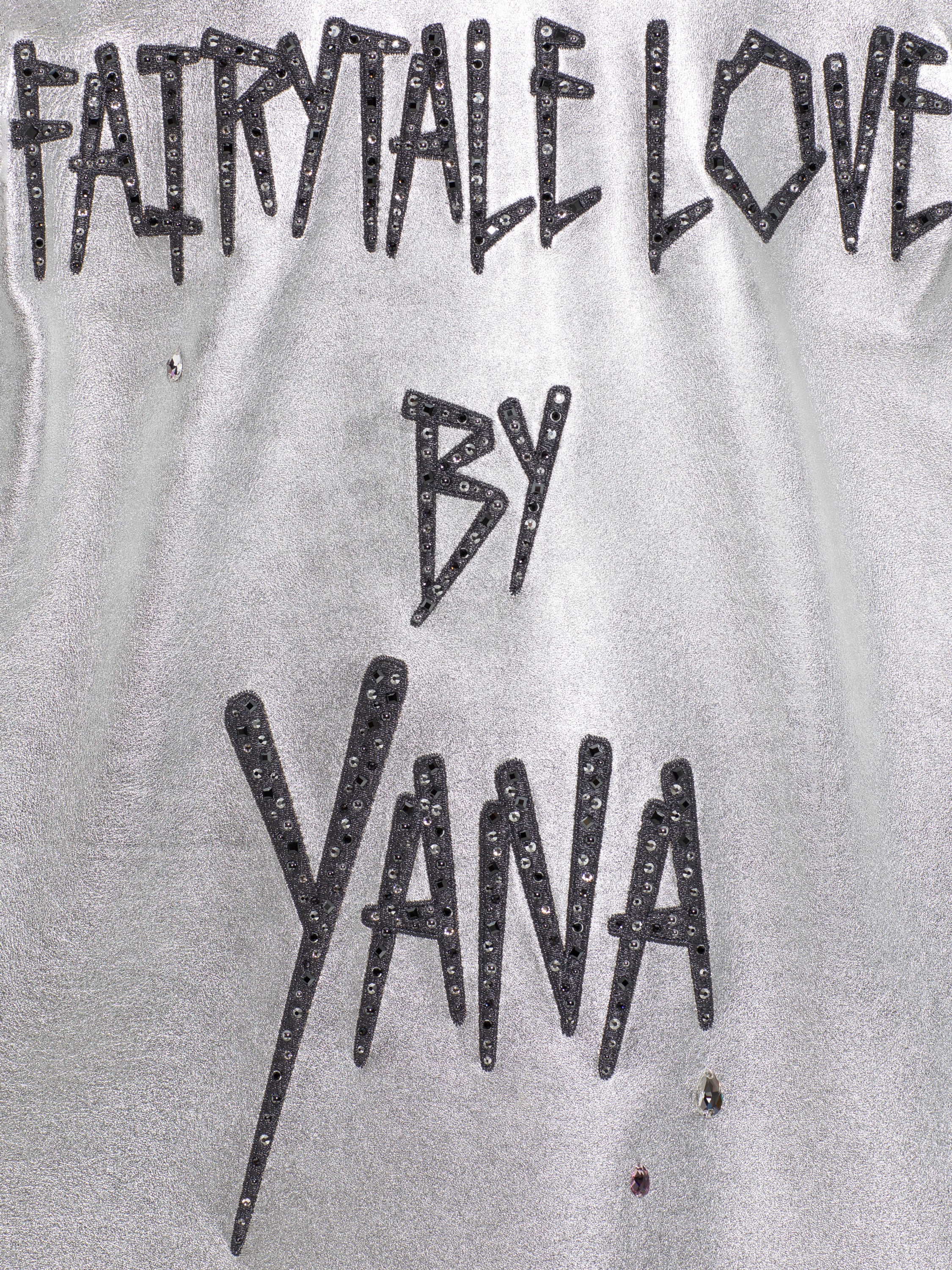 The silver cape is made of genuine leather and complemented by lilac heart-shaped lapels. On the back: black embroidered Fairytale Love by Yana inscription with Swarovski crystals.