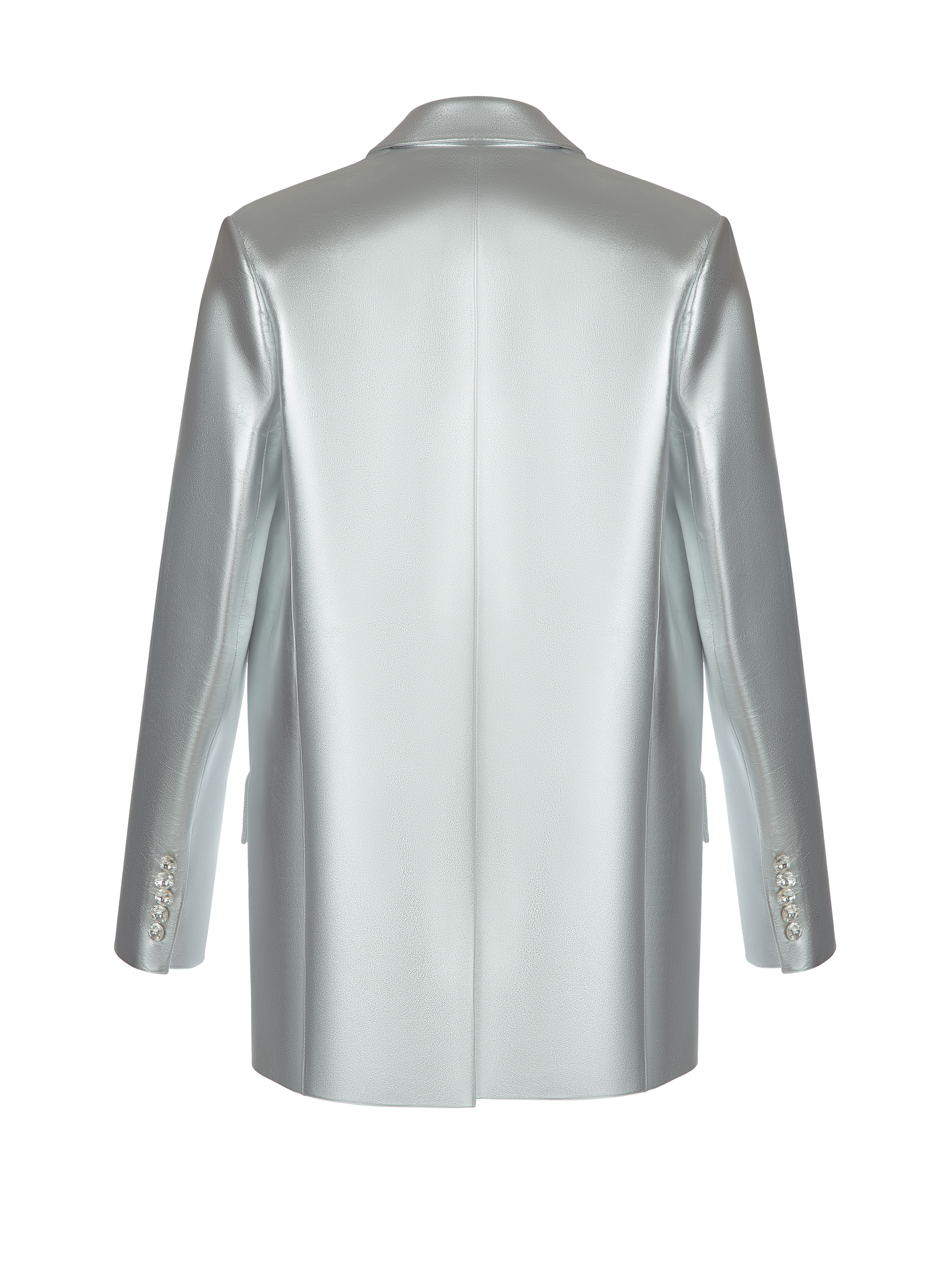 The single-breasted blazer is made of textured silver-colored leather with a large grain. Classic straight cut, silk lining and notched lapel collar. Fastens with two large crystal-shaped buttons.