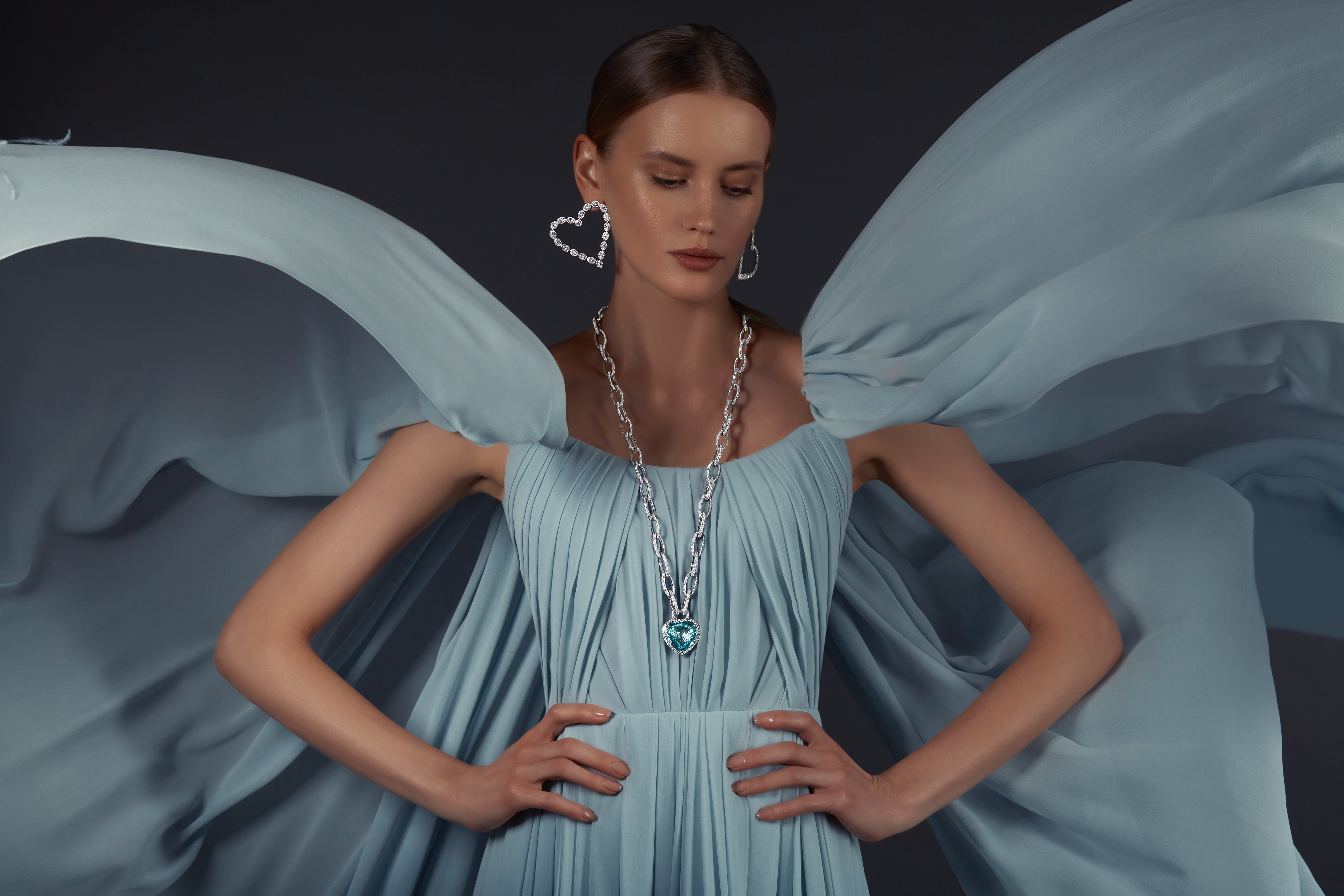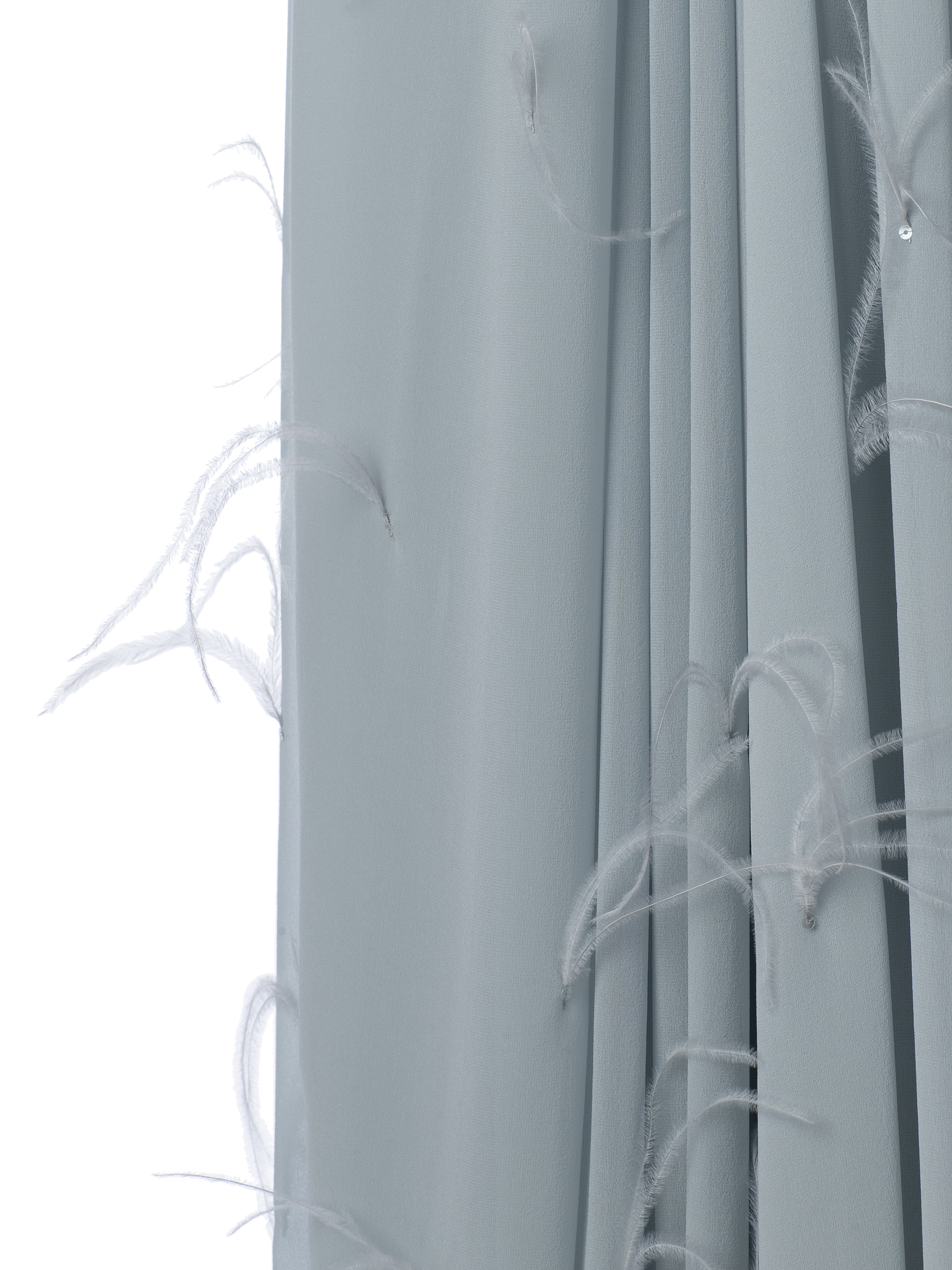 A grey-blue maxi dress with bare shoulders is made of draped chiffon. Flowing floor-length wing sleeves turn into a spectacular train. The hem of the dress is decorated with feathers.