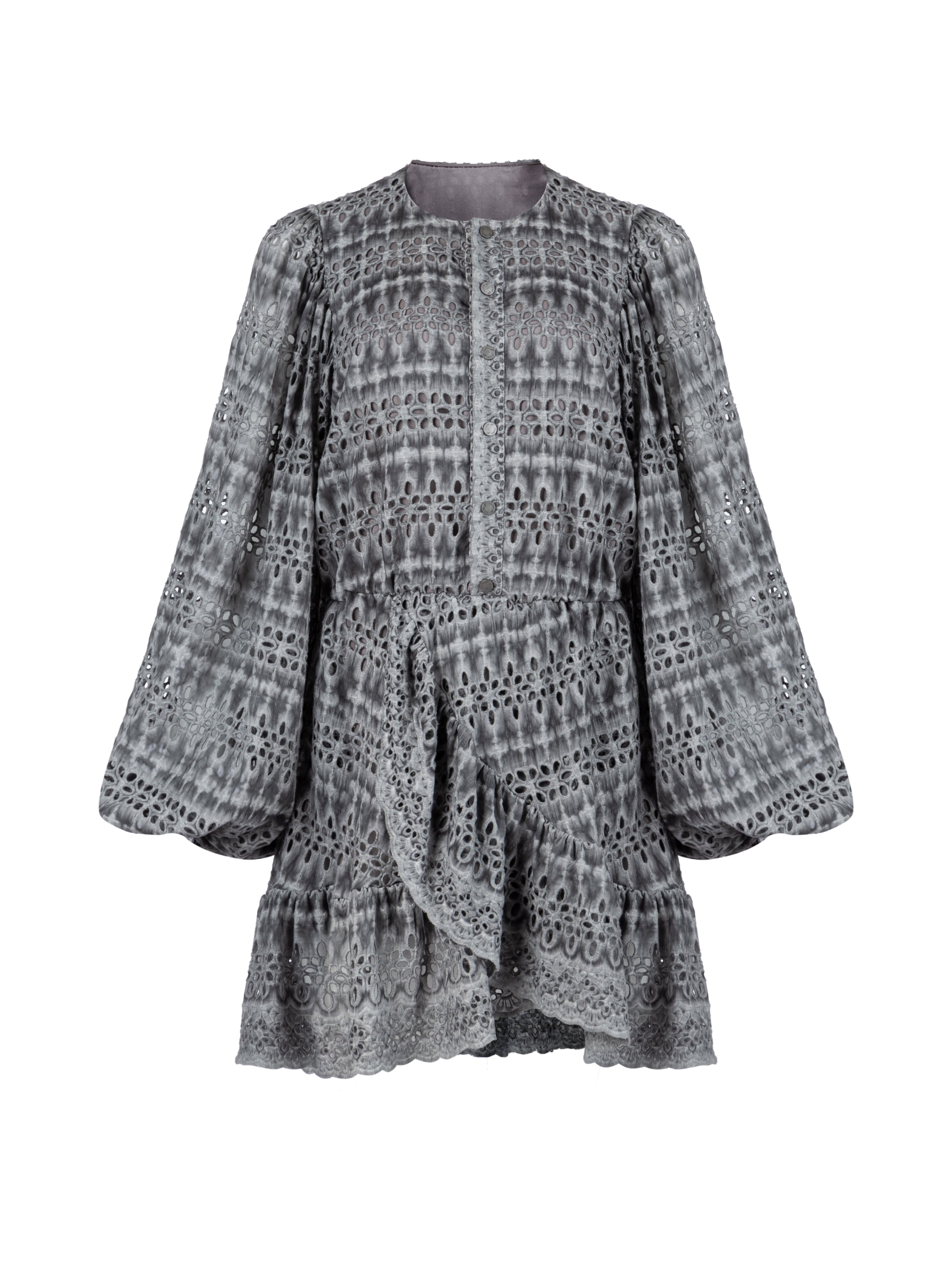 The grey mini dress is made of cotton fabric with perforation. The flowing silhouette is accentuated by long puff sleeves and a ruffle at the hem.