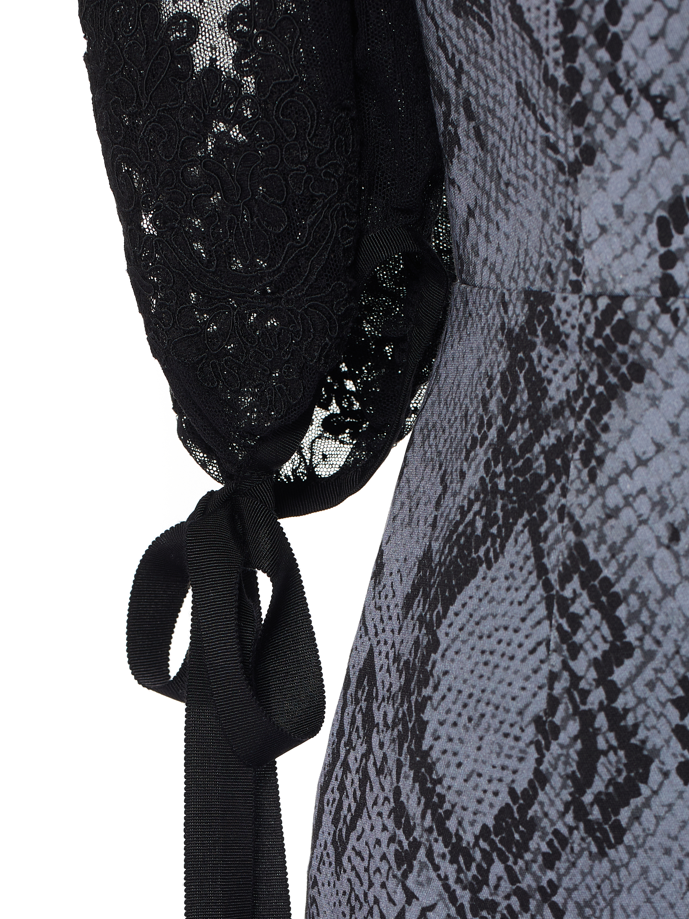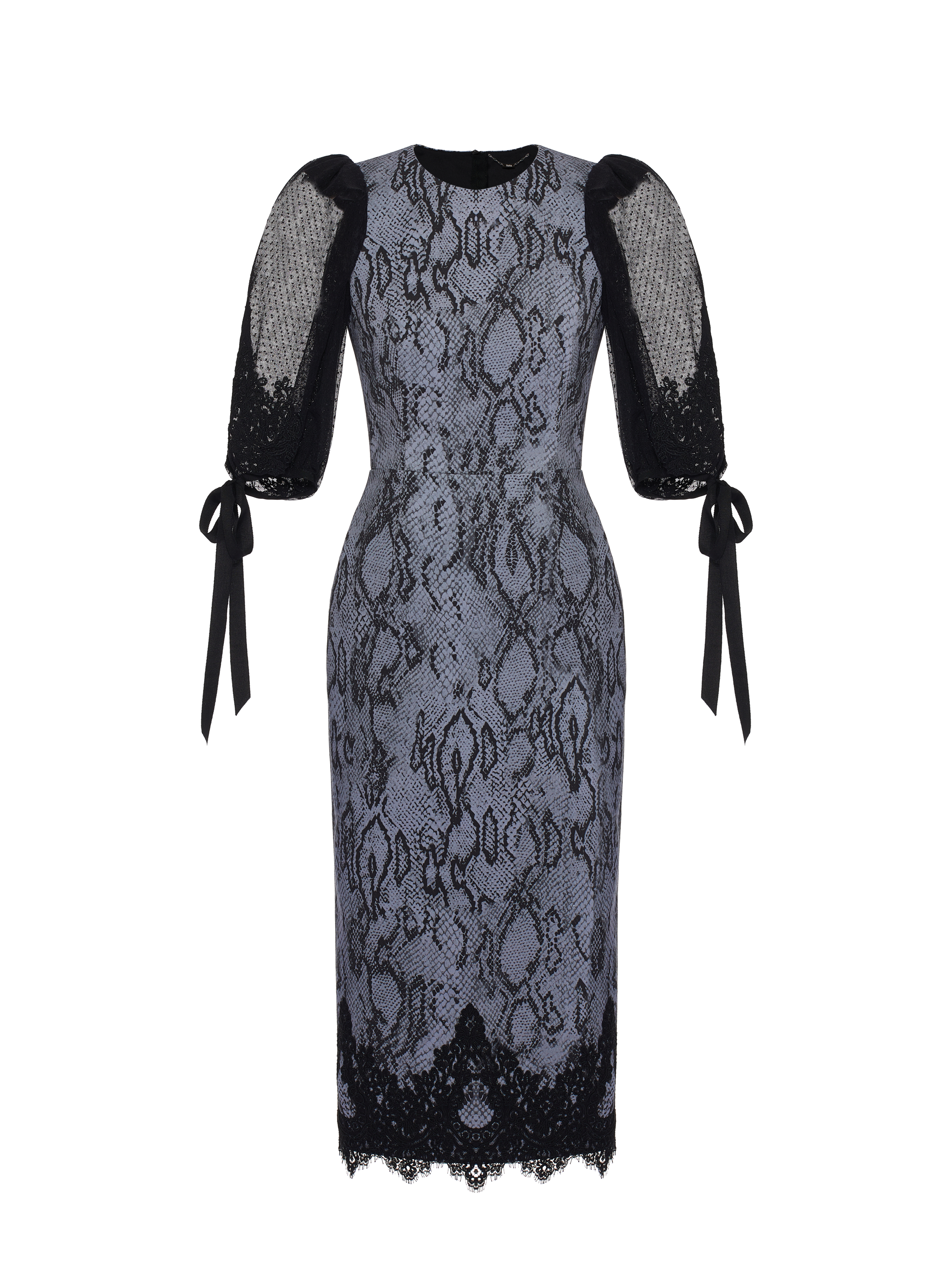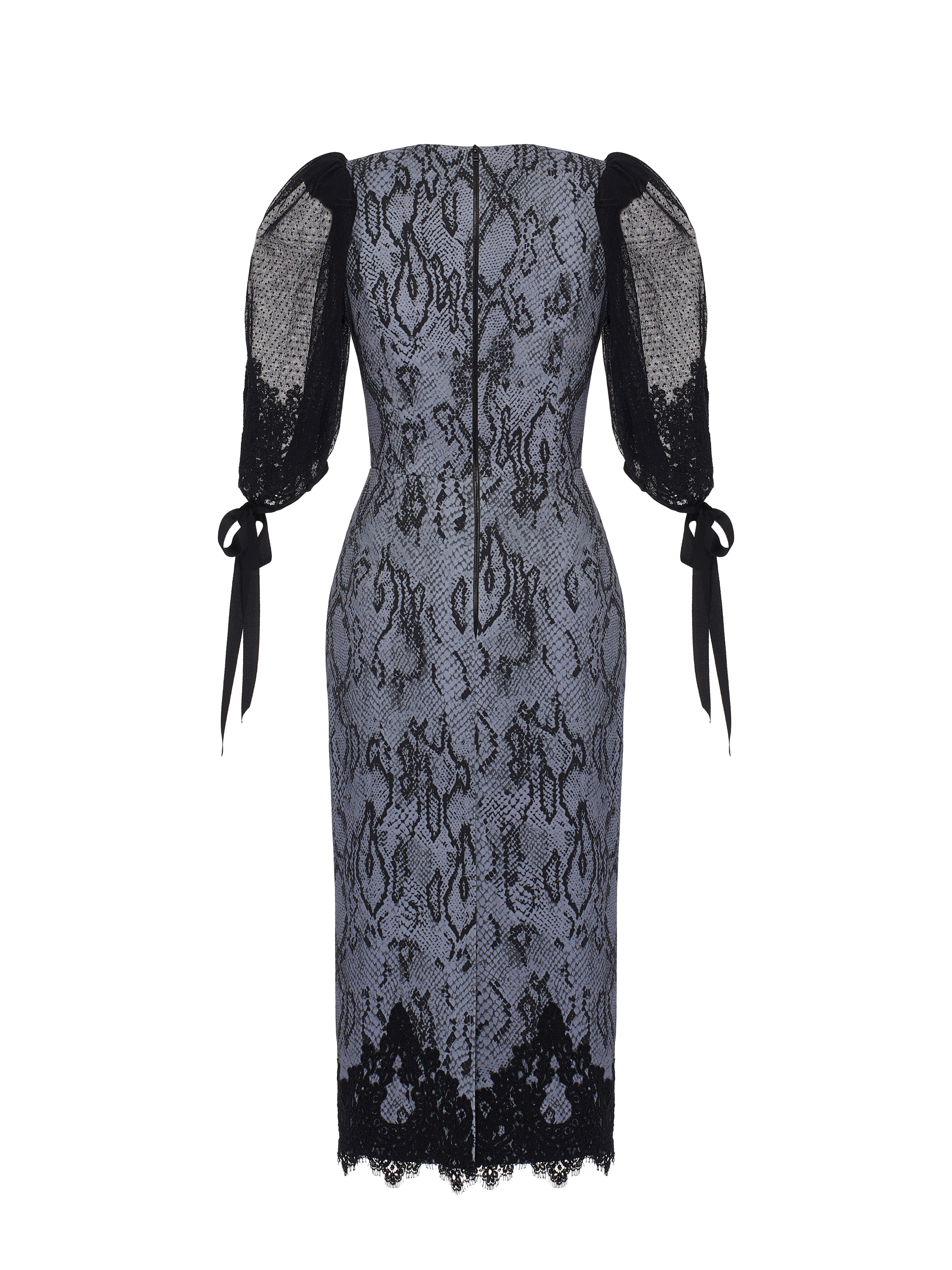A figure-hugging midi dress is made of grey denim with a snake print. The model is complemented by voluminous puff sleeves made of black semi-sheer lace with tone-on-tone ribbon ties. The hem is decorated with fine black lace. The dress fastens with a zipper at the back.