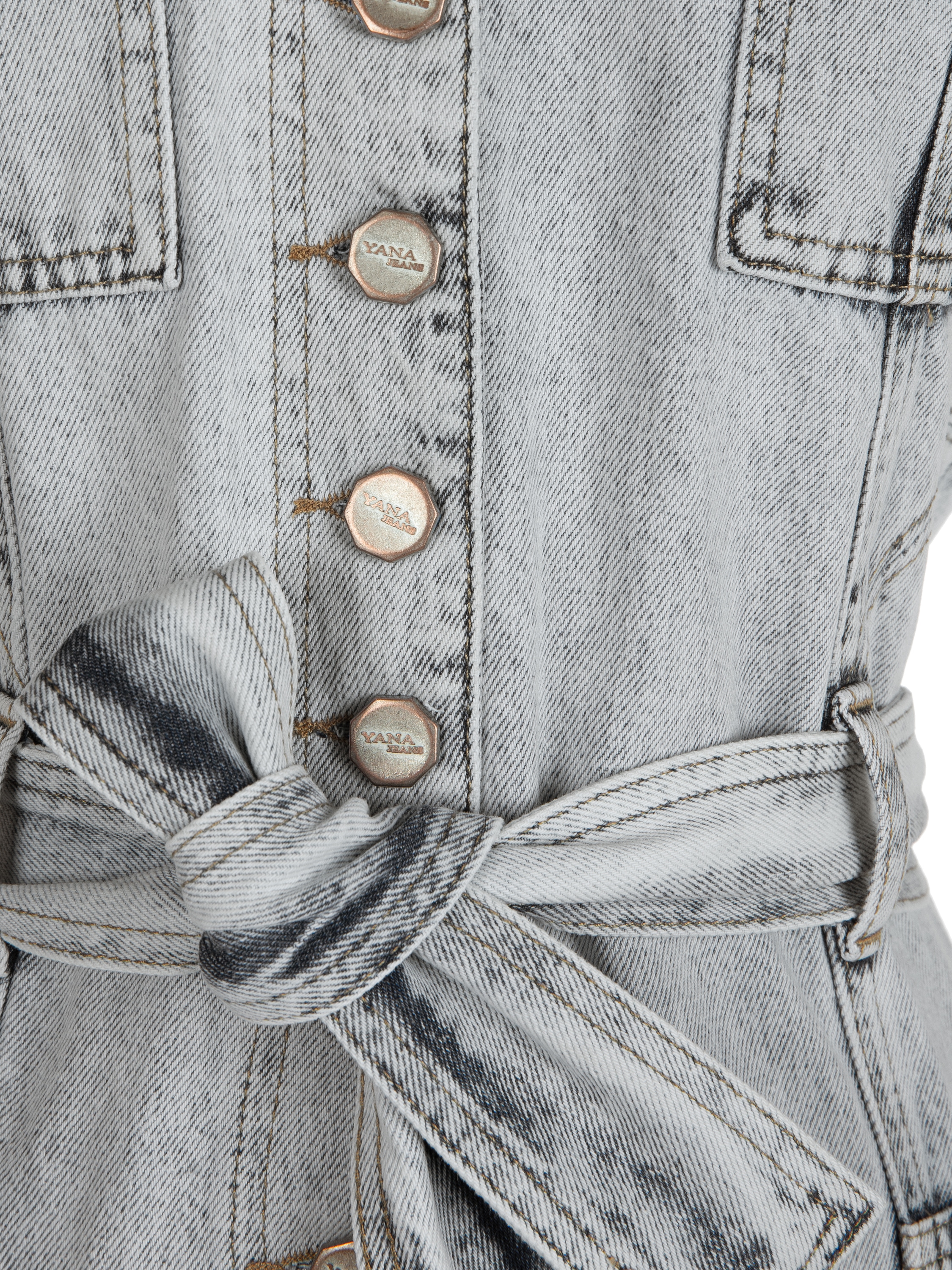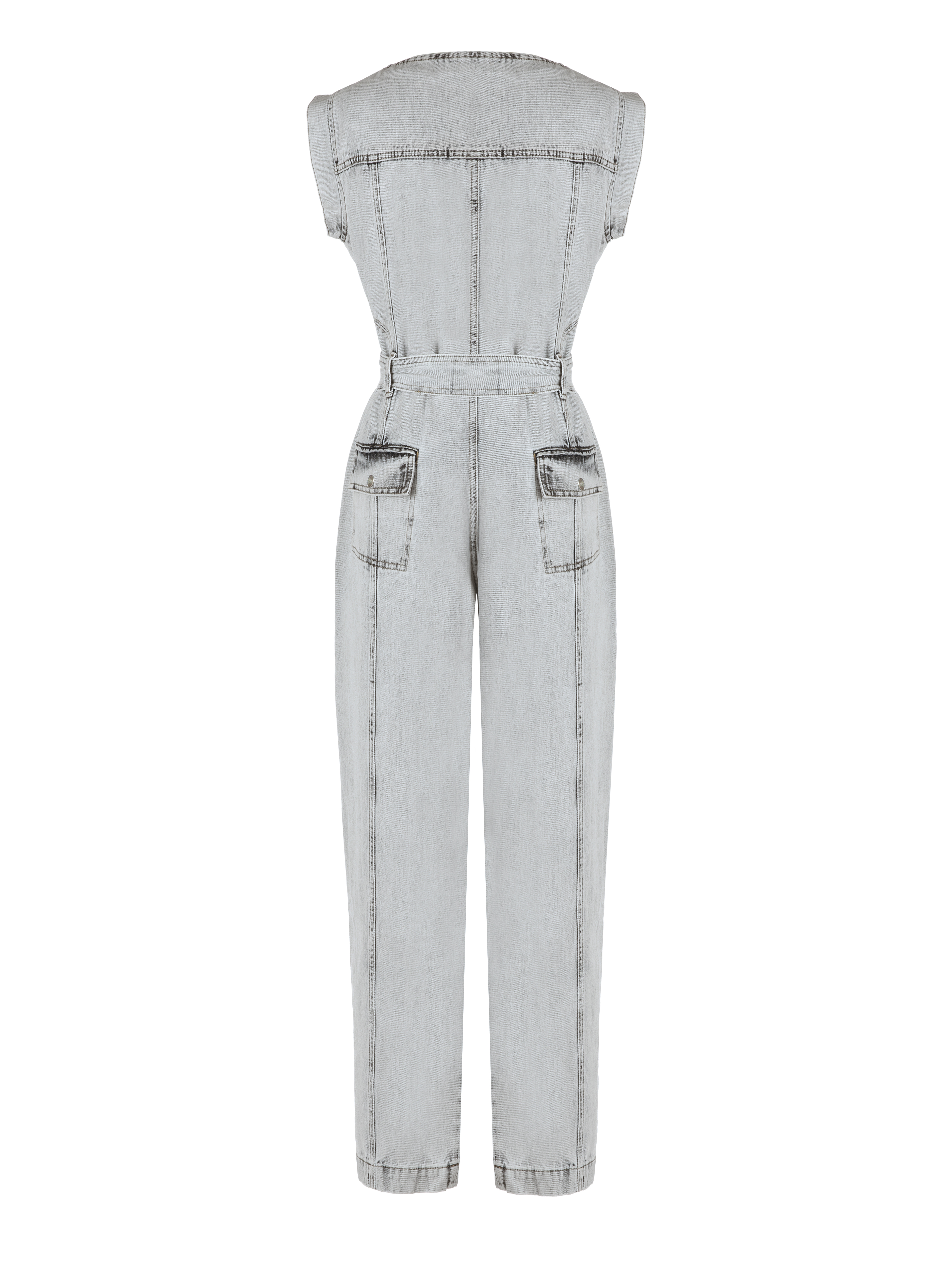 The light grey sleeveless jumpsuit is made of denim. The model fastens with front buttons and is complemented by a belt and patch pockets at the front and back. Pair with Yana Shoes footwear and Yana Jewellery accessories.