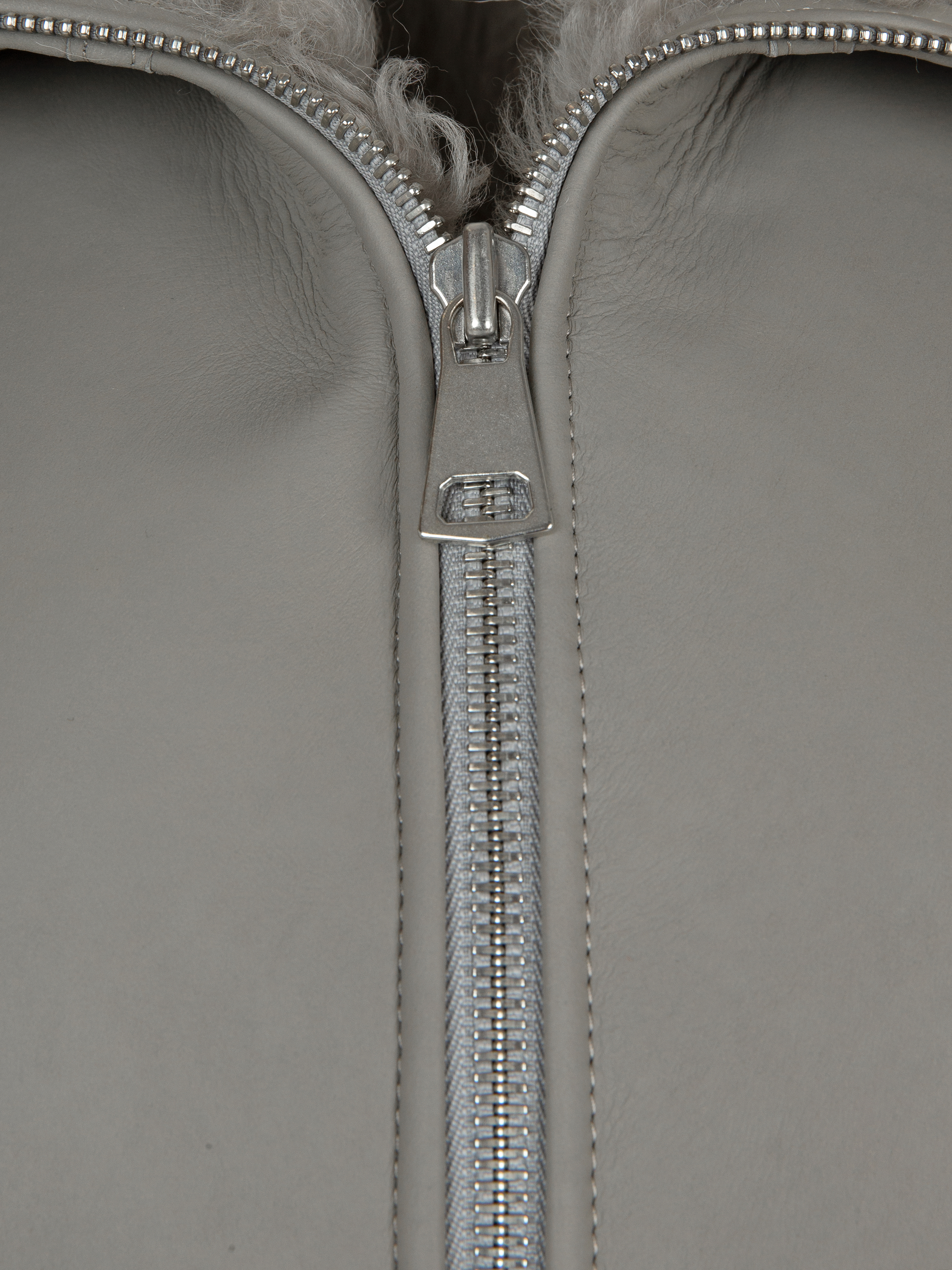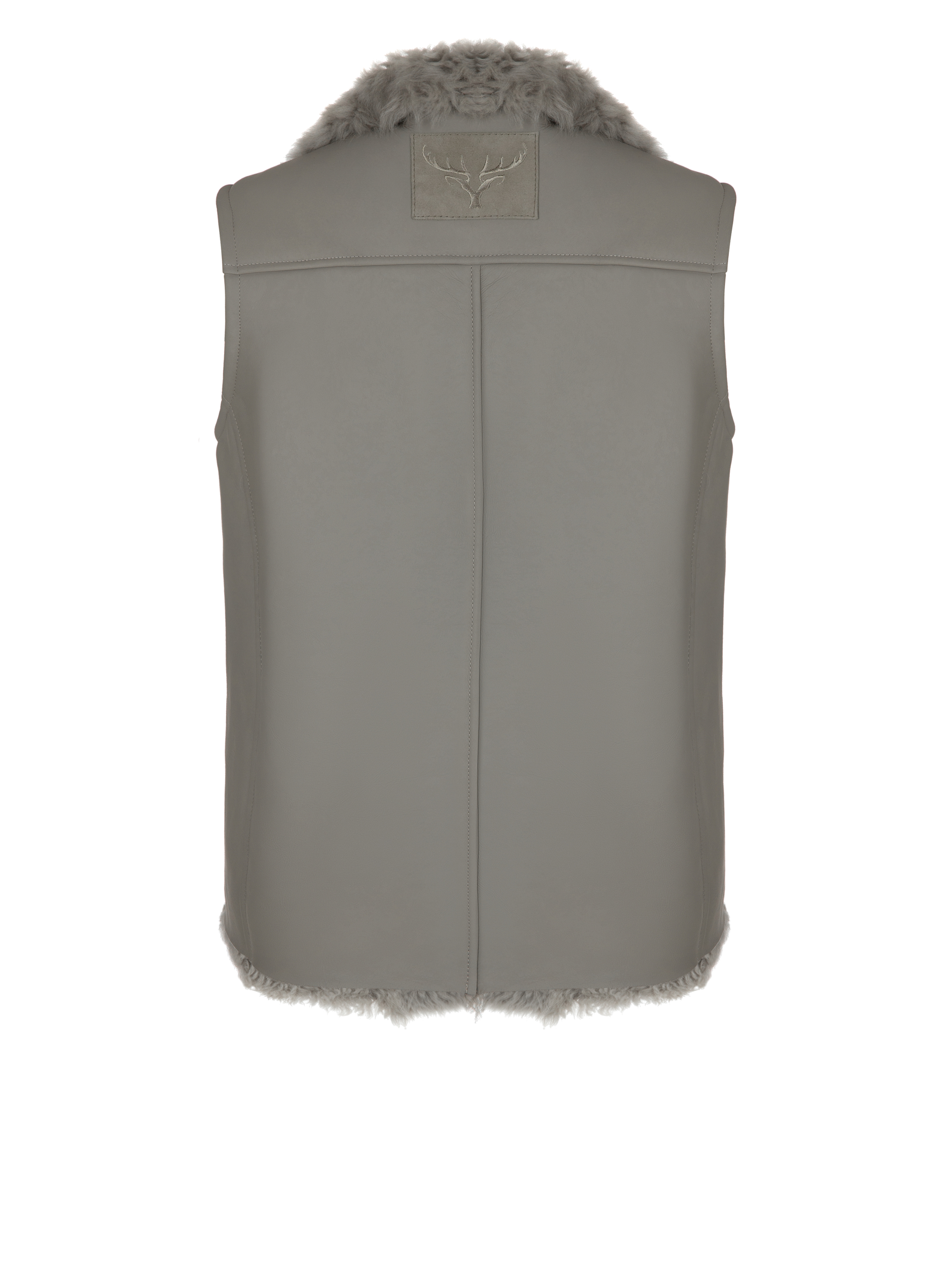 Straight-cut grey vest made of genuine sheepskin. Zip fastening with a stand-up collar. A suede patch with an embroidered deer on the back.