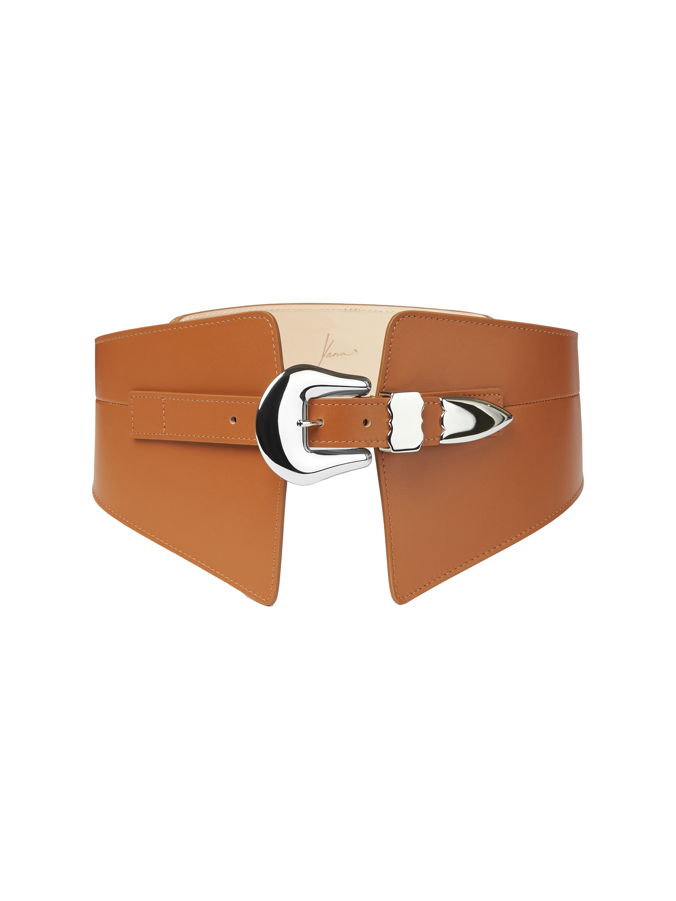The versatile brown belt made of smooth genuine leather is complemented by a silver-tone metal buckle. The wide belt will help accentuate the waist and become a highlight of your look. XS — 65 cm, S — 70 cm, M — 75 cm, L — 80 cm.