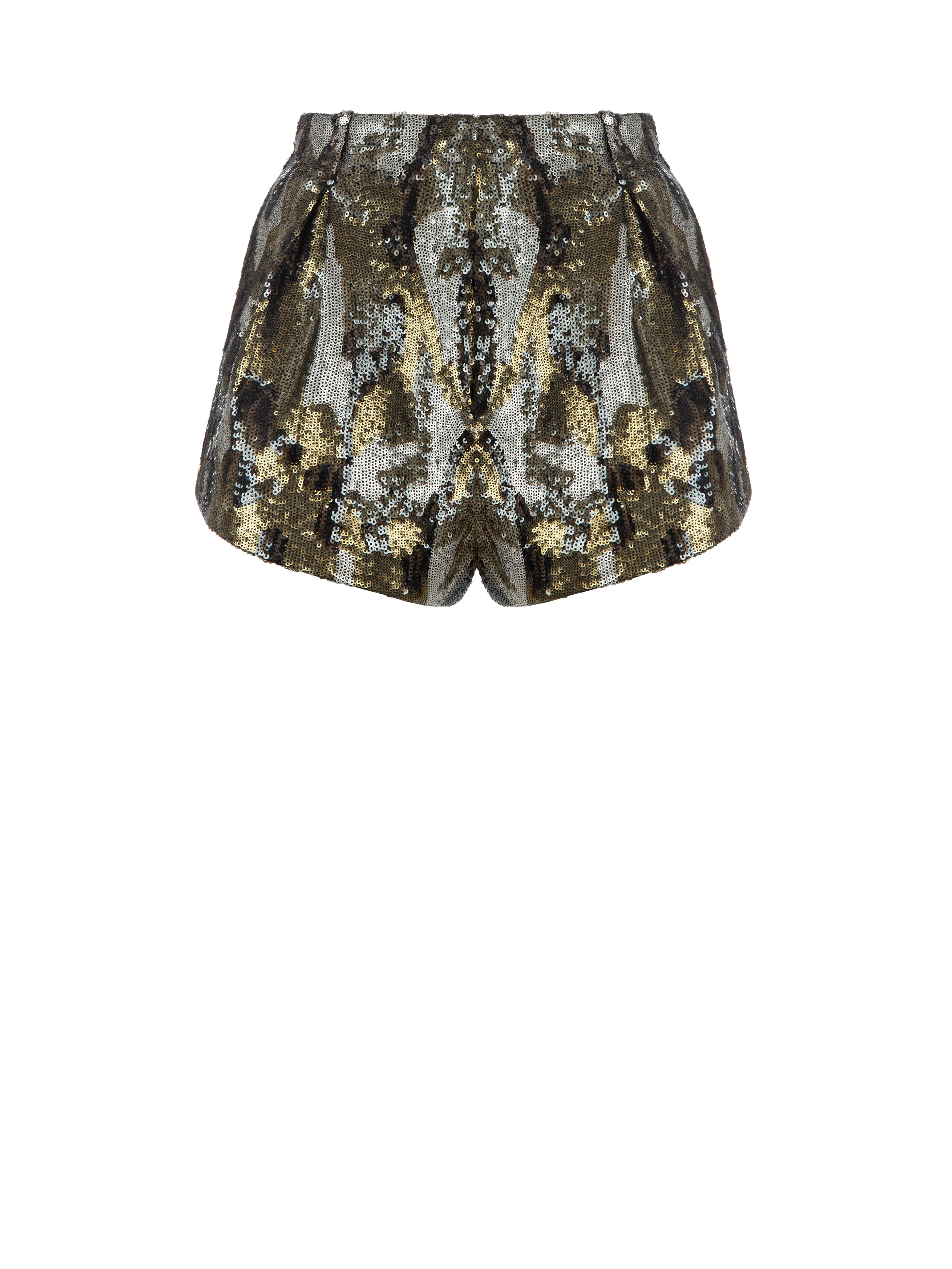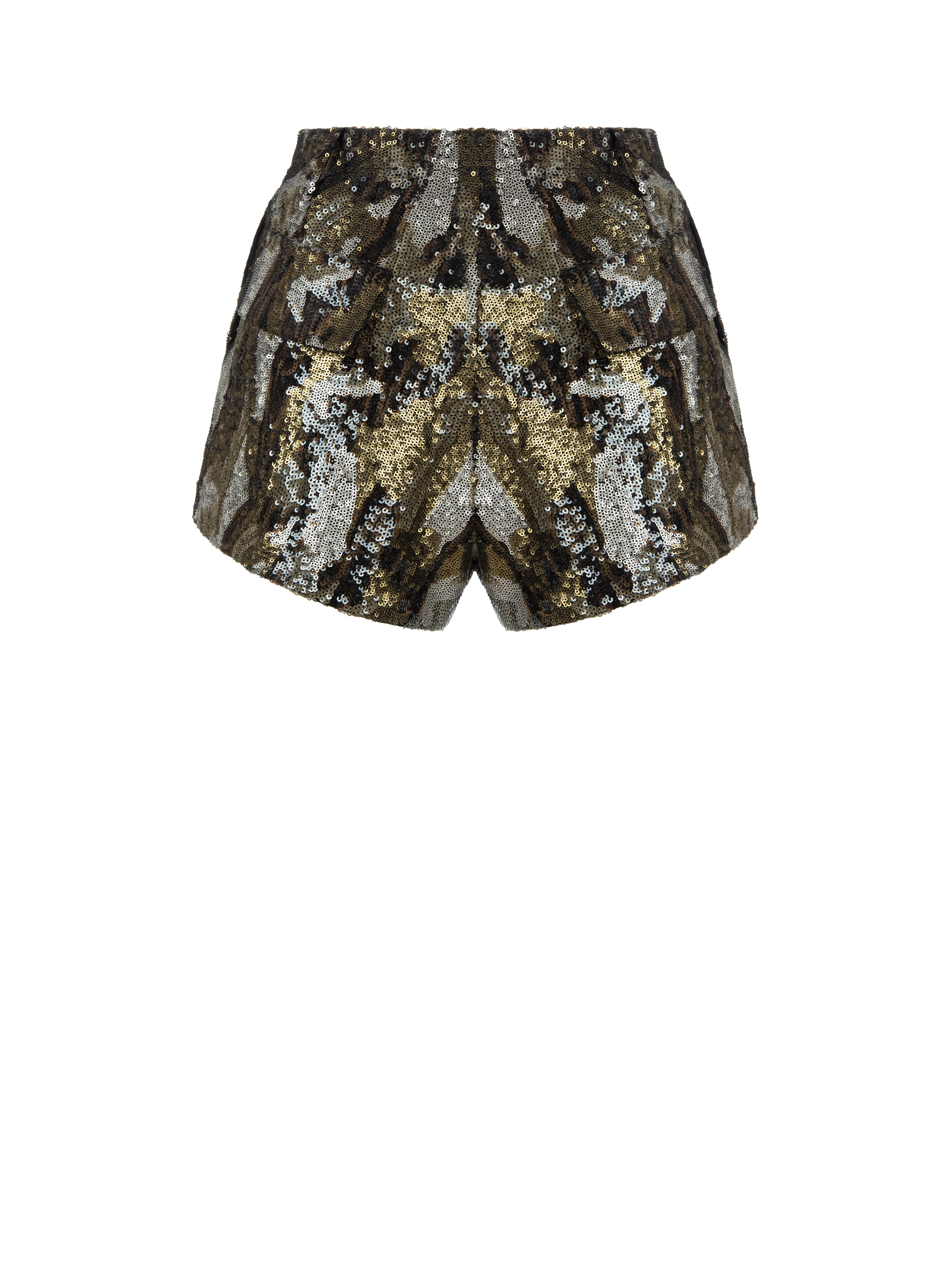 Shorts with a camouflage pattern made of black, green and silver sequins.