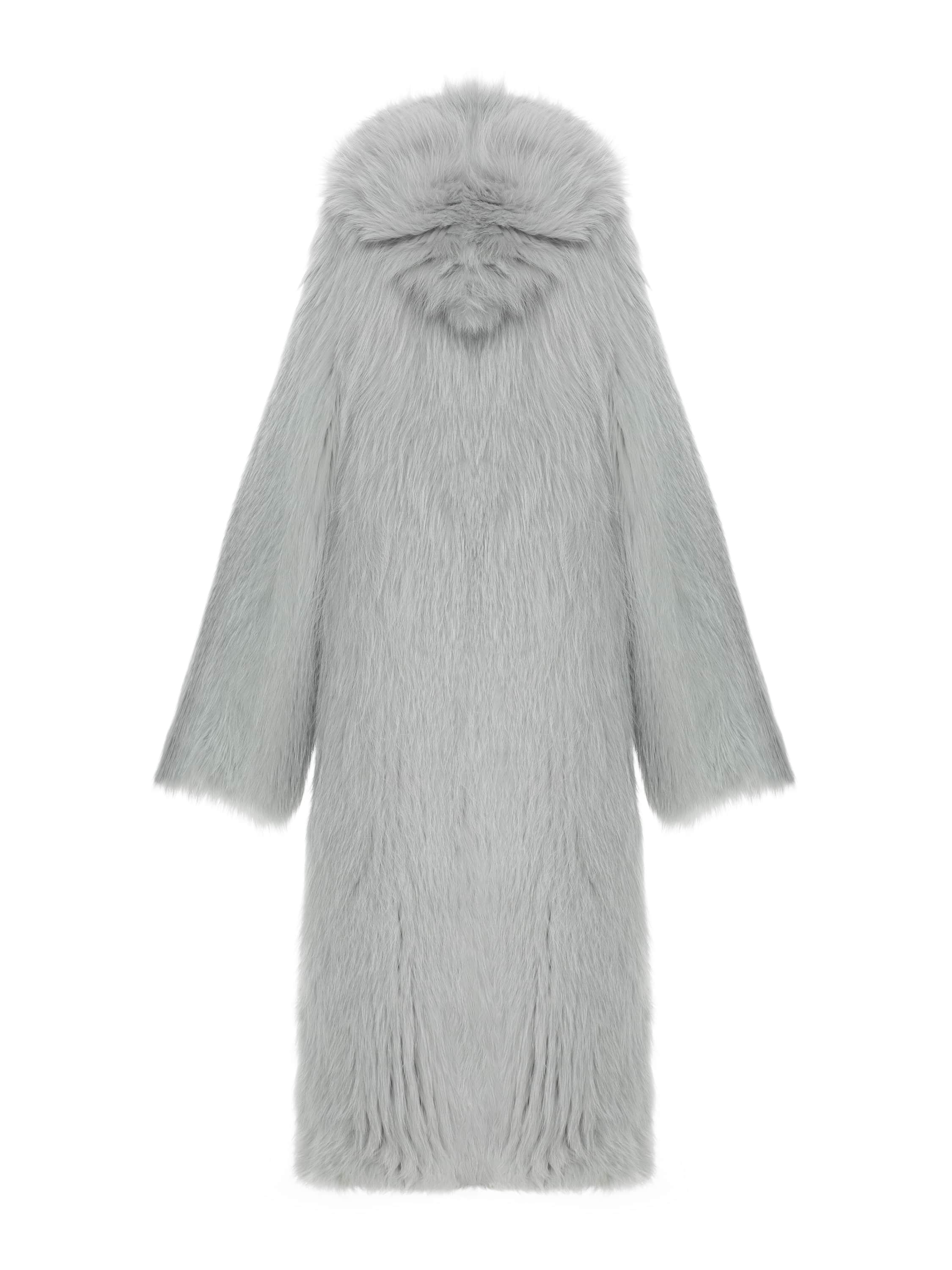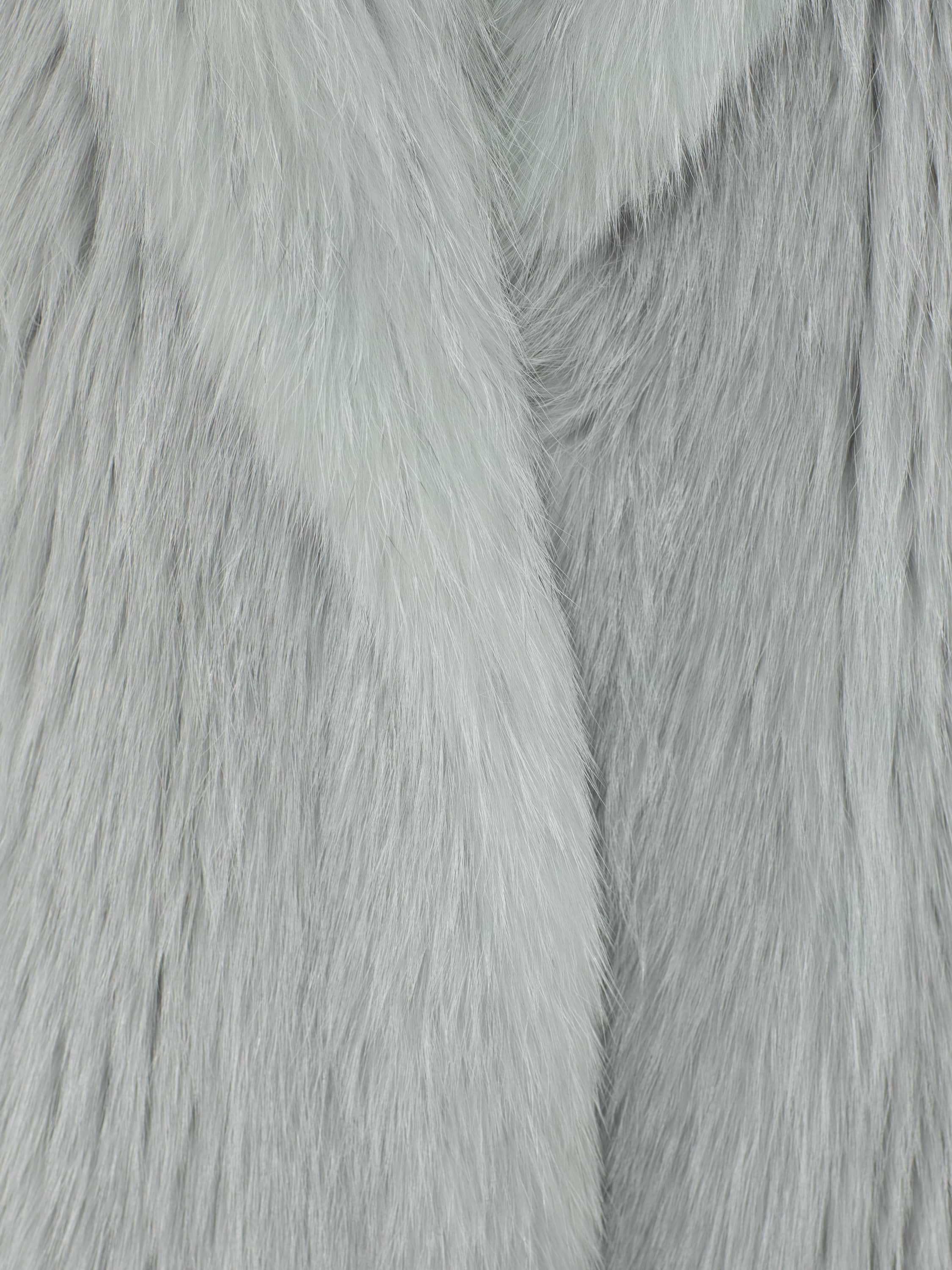 A grey knitted fur coat made of fox fur retains heat well and does not lose its texture in drizzling rain and wet snow. Trendy voluminous model with a shawl collar and flared sleeves.