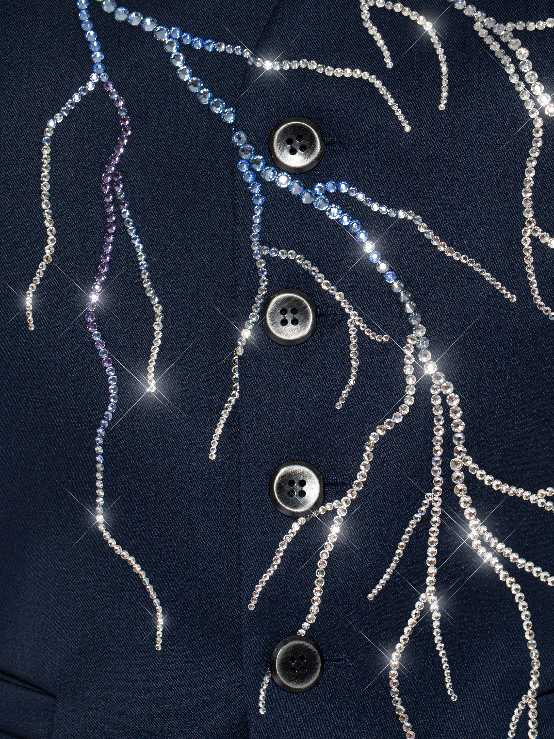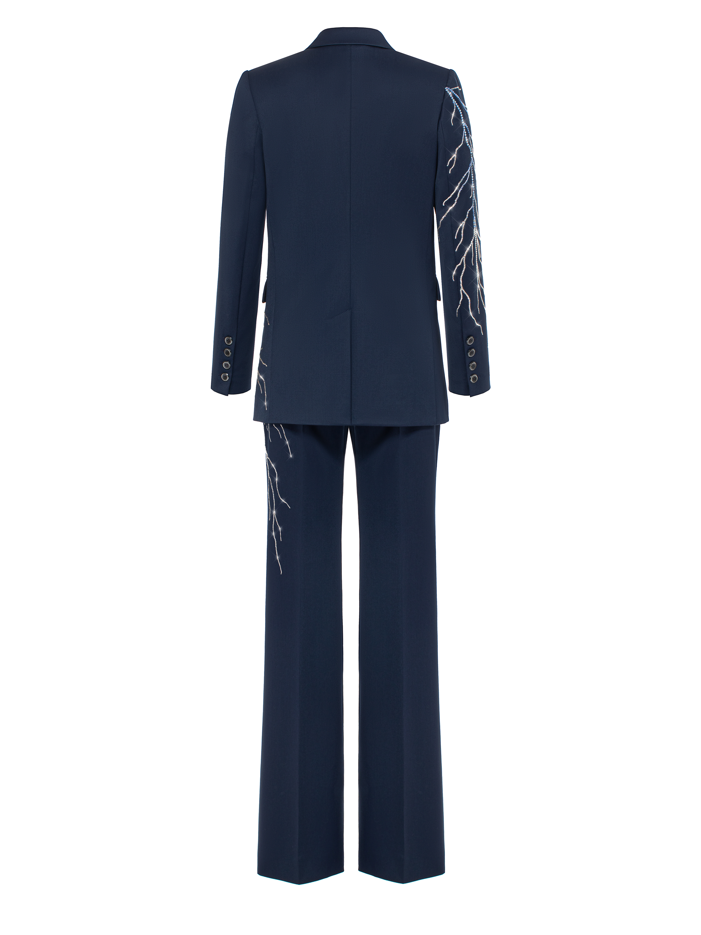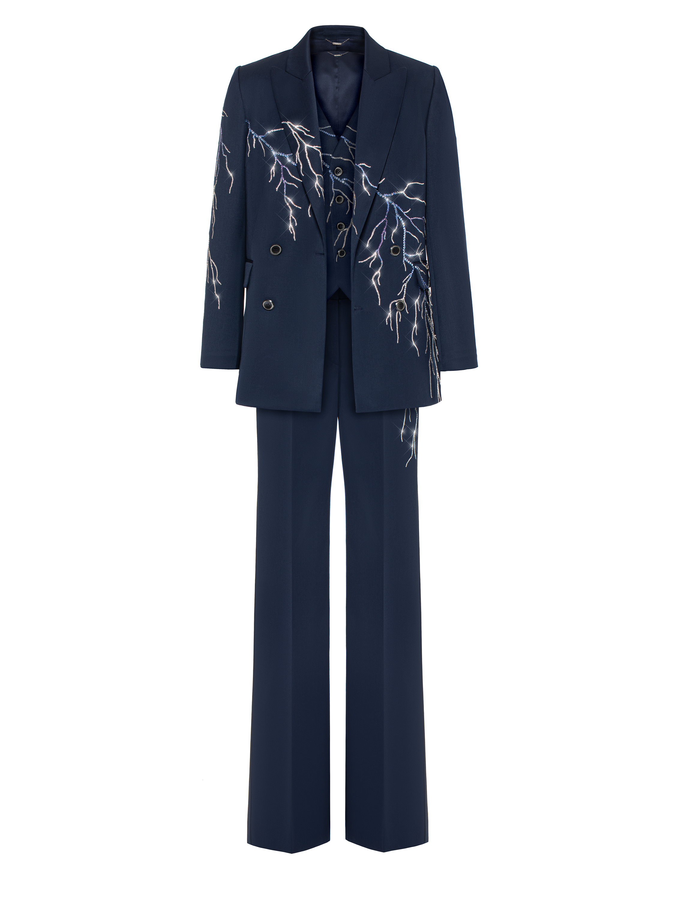 A classic three-piece suit is a timeless item. The model is made of dark blue wool and decorated with lightning motifs made of shimmering Swarovski crystals in silver and blue. The suit consists of straight-leg trousers with pressed creases, a vest, and a double-breasted jacket with sharp shaped lapels and two welt flap pockets. It took 54.5 hours of handwork by Yana fashion house craftsmen to create the suit.