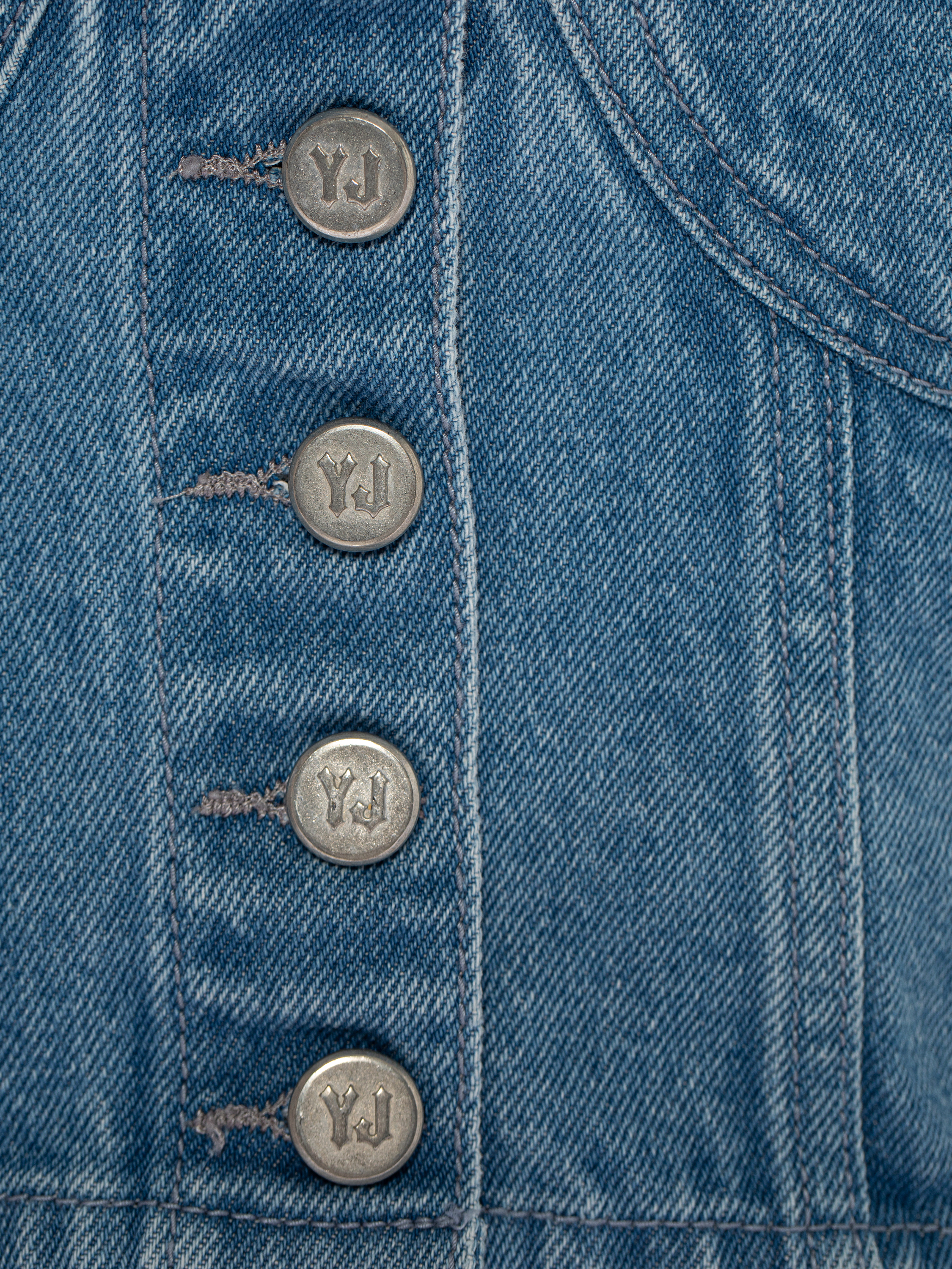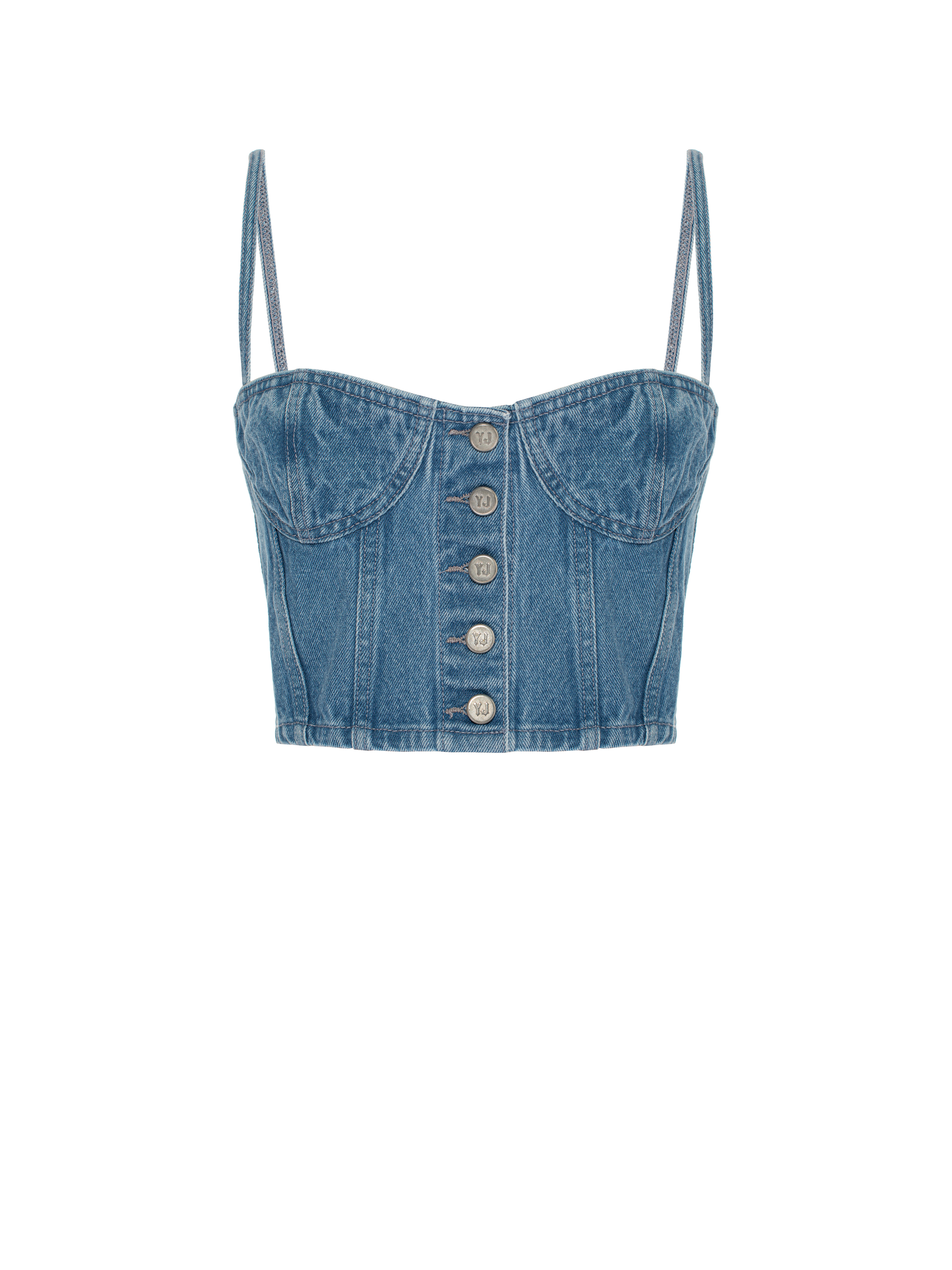 A corset top with thin straps is made of washed blue denim. It fastens at the front with branded logo buttons.