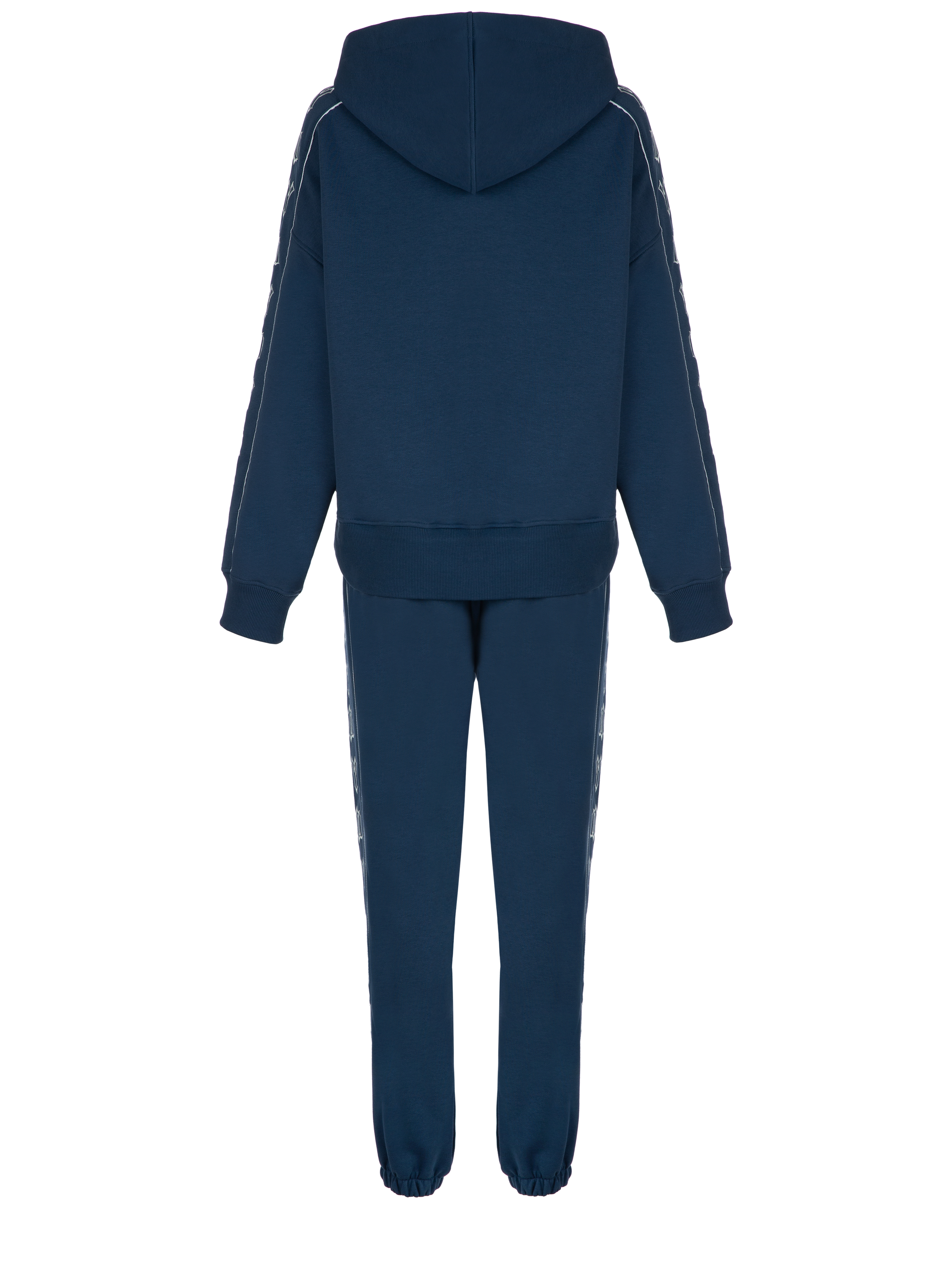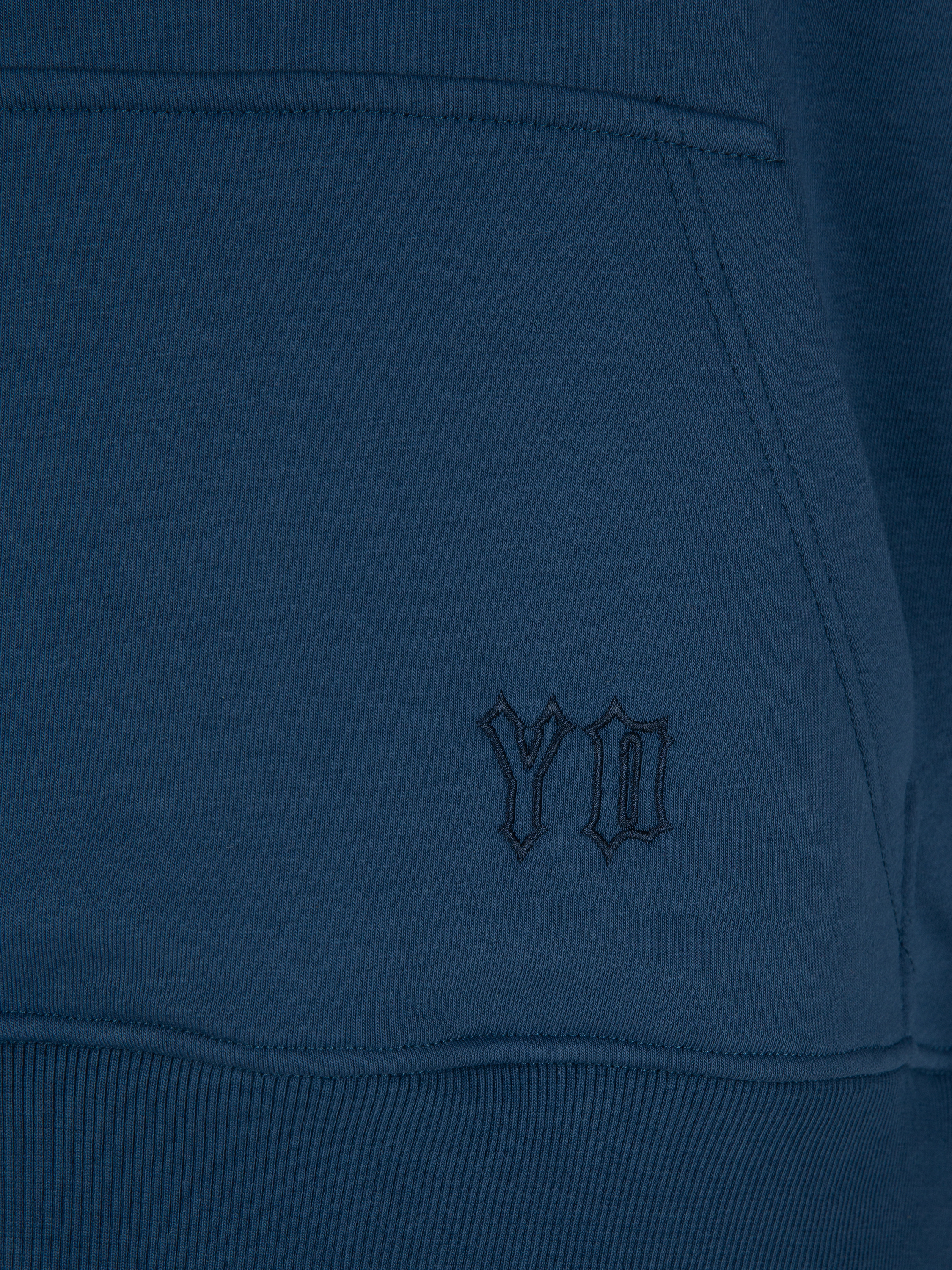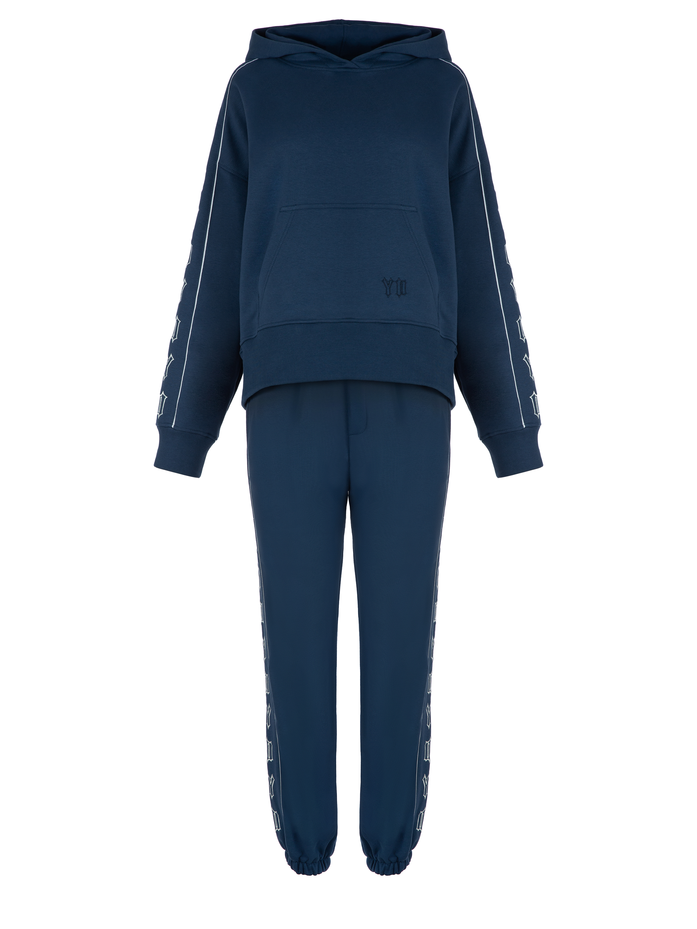 The blue jersey tracksuit consists of a hoodie with white YD embroidery on the sleeves and sweatpants with elastic cuffs at the bottom. A large kangaroo pocket with the brand logo on the front.