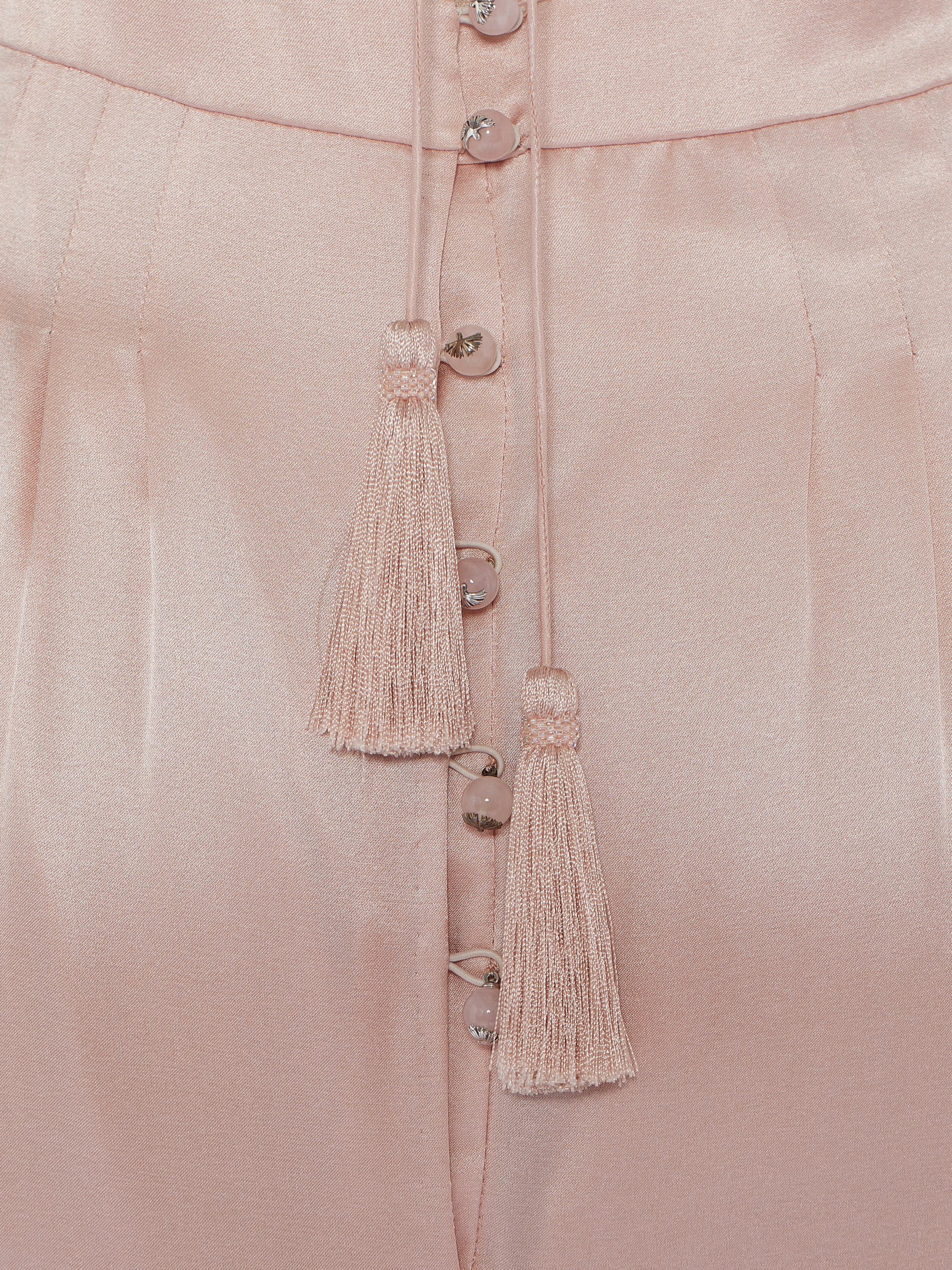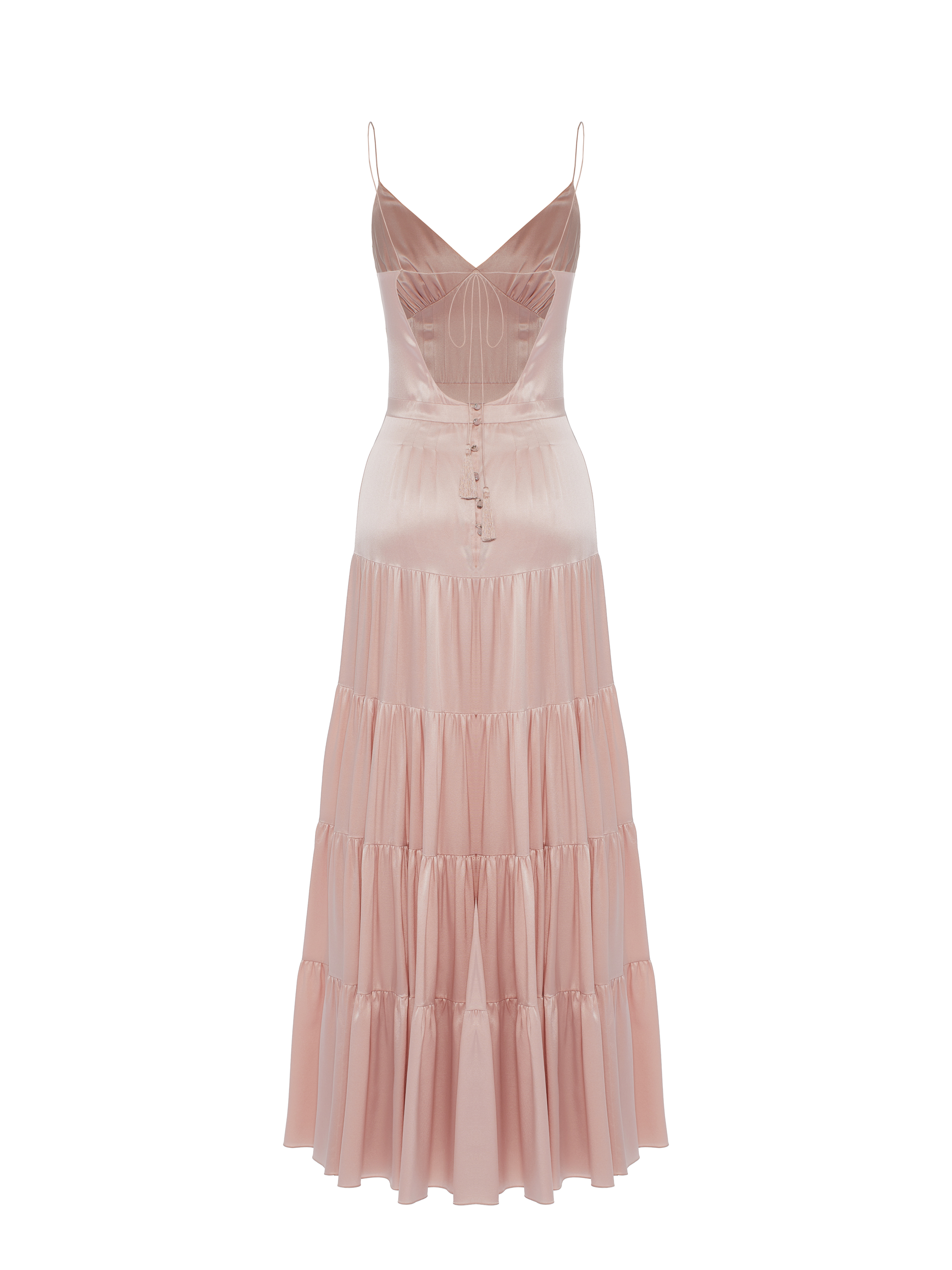 A light pink maxi dress on thin straps is made of silk. The hem is cut in four tiers. The model is complemented by a cut-out and tassel ties at the back. Style it with shoes and accessories by Yana Dress to complete the look.