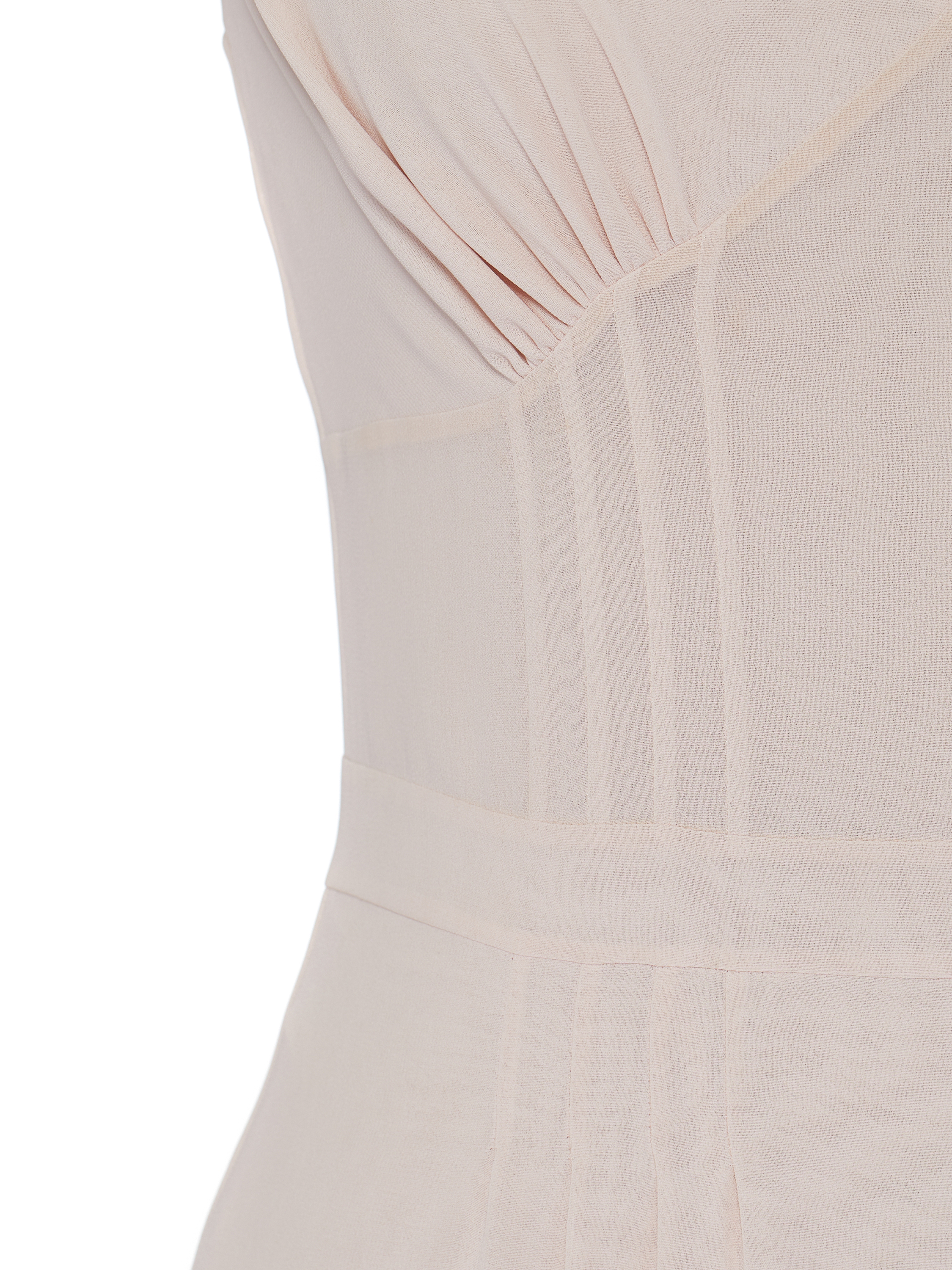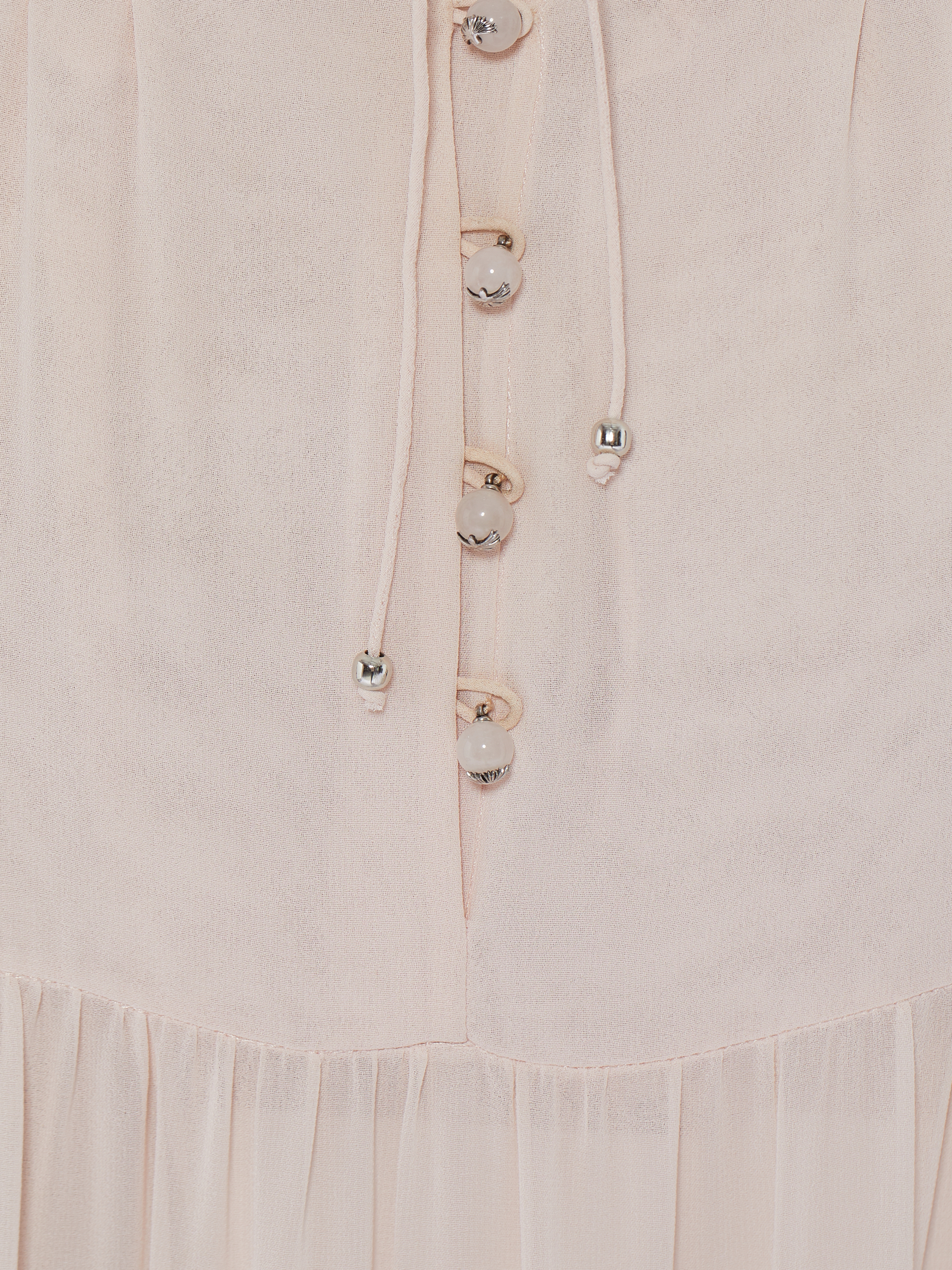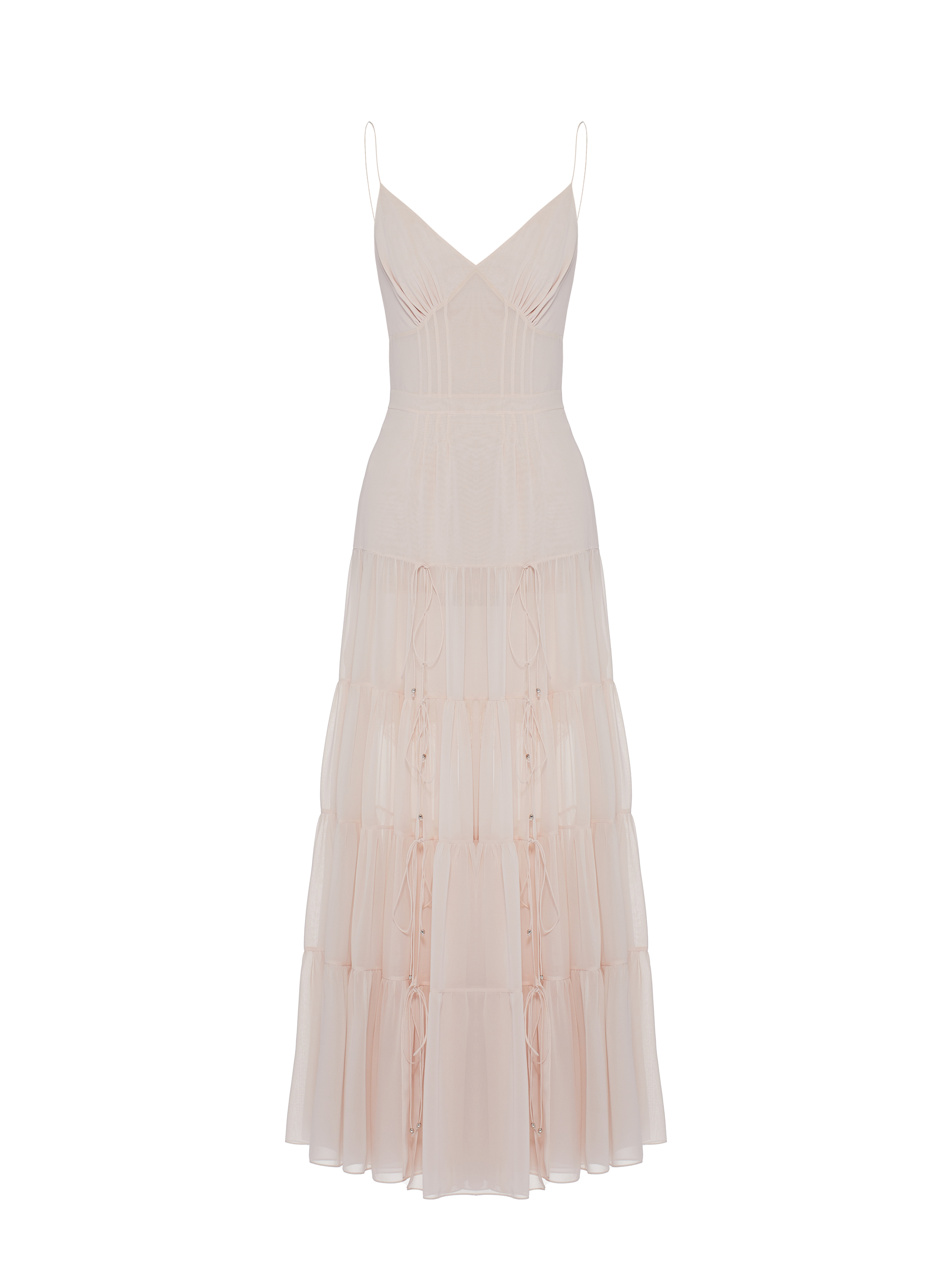 A light pink maxi dress on thin straps with an open back is made of semi-sheer chiffon. The hem is cut in four tiers and complemented with slits and ties at the front. Fastening with mother-of-pearl buttons and ties at the back.