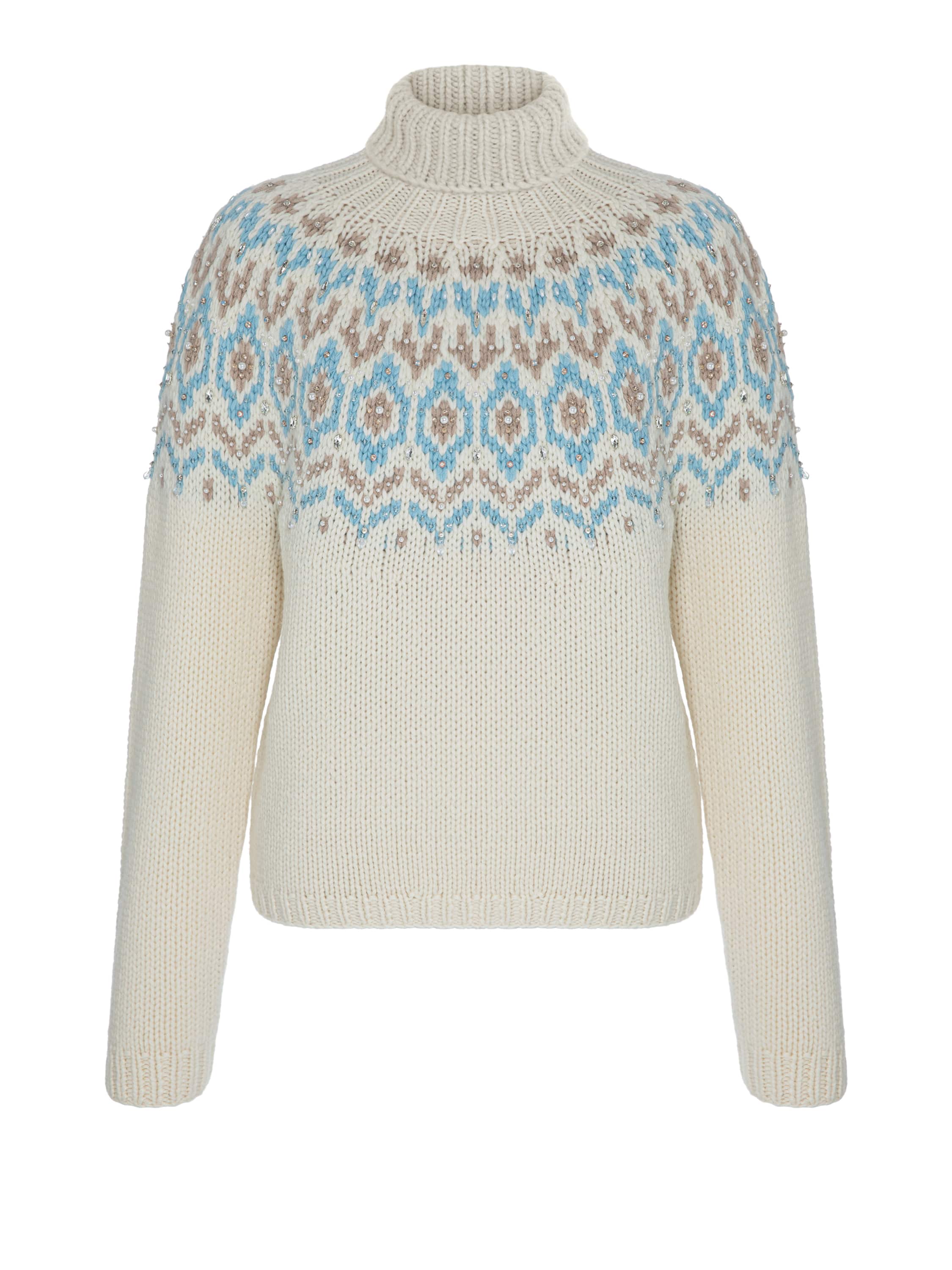 The milky sweater with an ornament is hand-knitted from 100% cashmere. The model with a high neck is complemented by hand embroidery with beads, crystals and bugle beads. It took the craftsmen 50 hours of handwork to create and decorate the item.