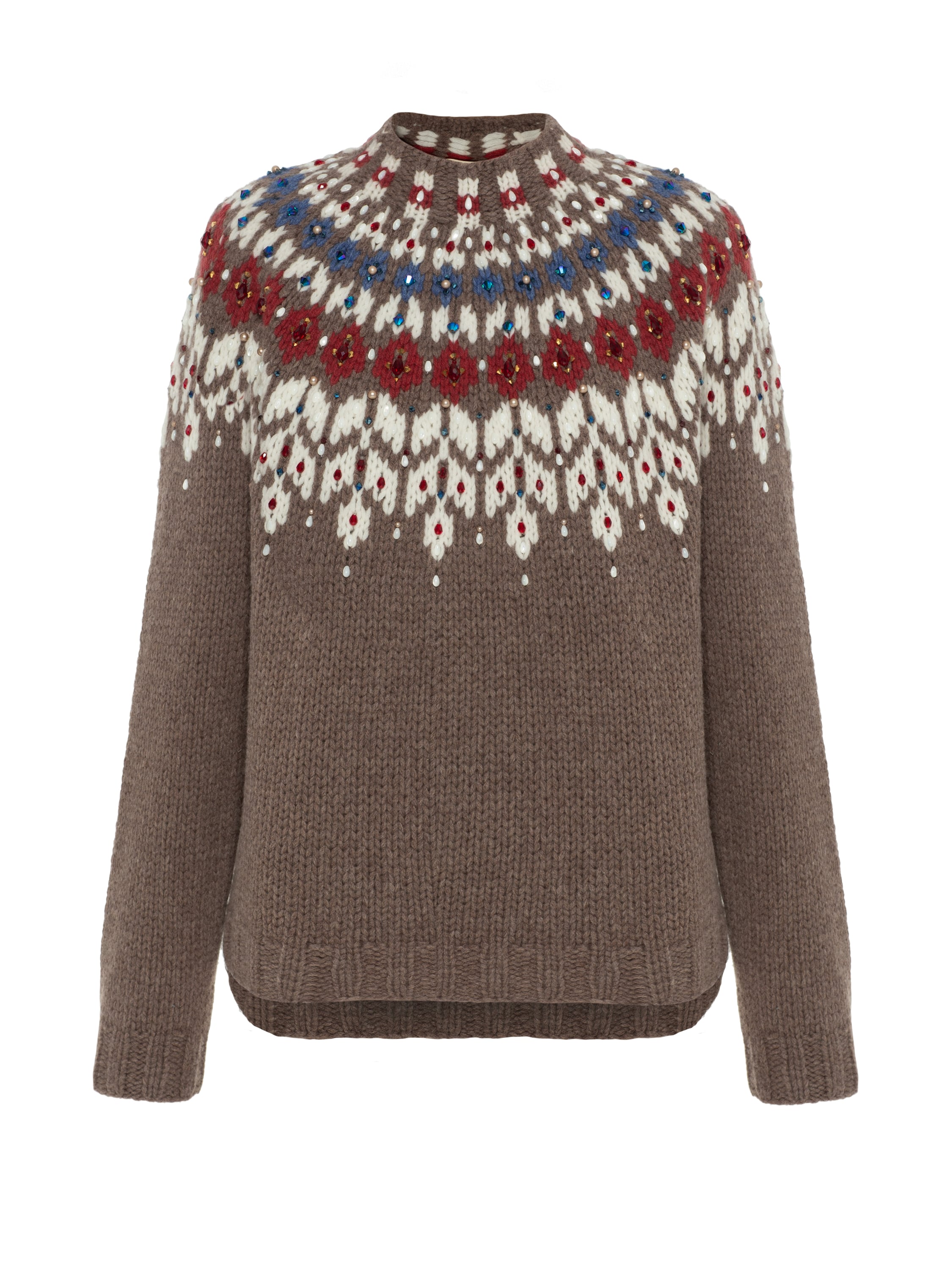 The brown sweater with a bright pattern is hand-knitted from 100% cashmere. The model with a delicate round neckline is complemented by hand embroidery with pearls and bicone beads. It took the craftsmen 38 hours of handwork to make and decorate the piece.