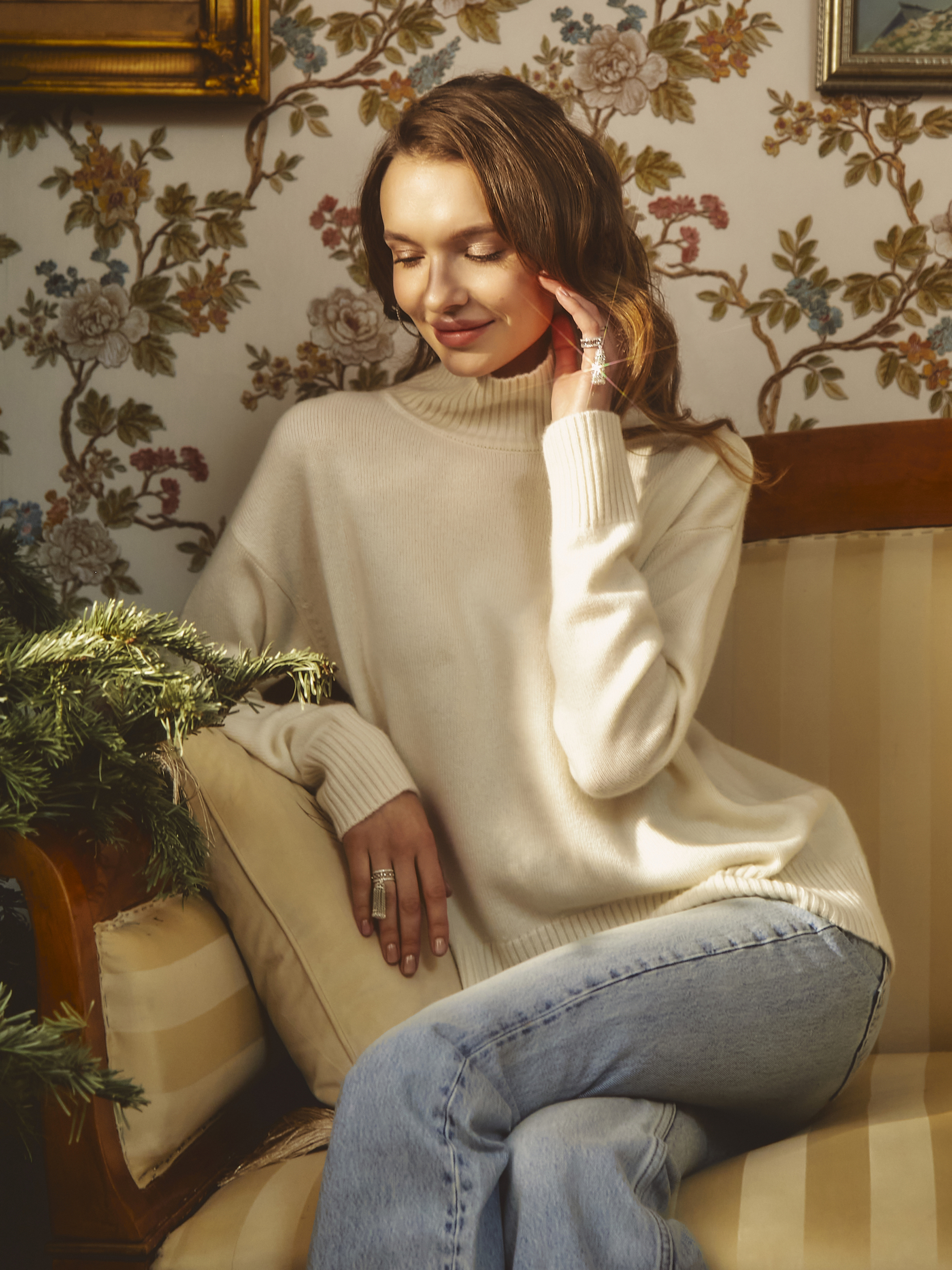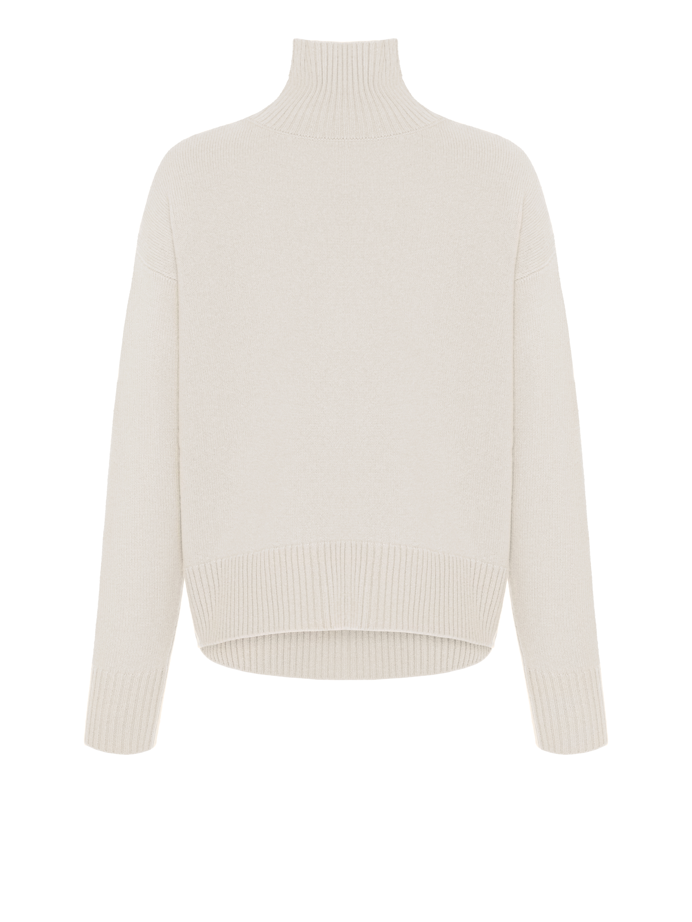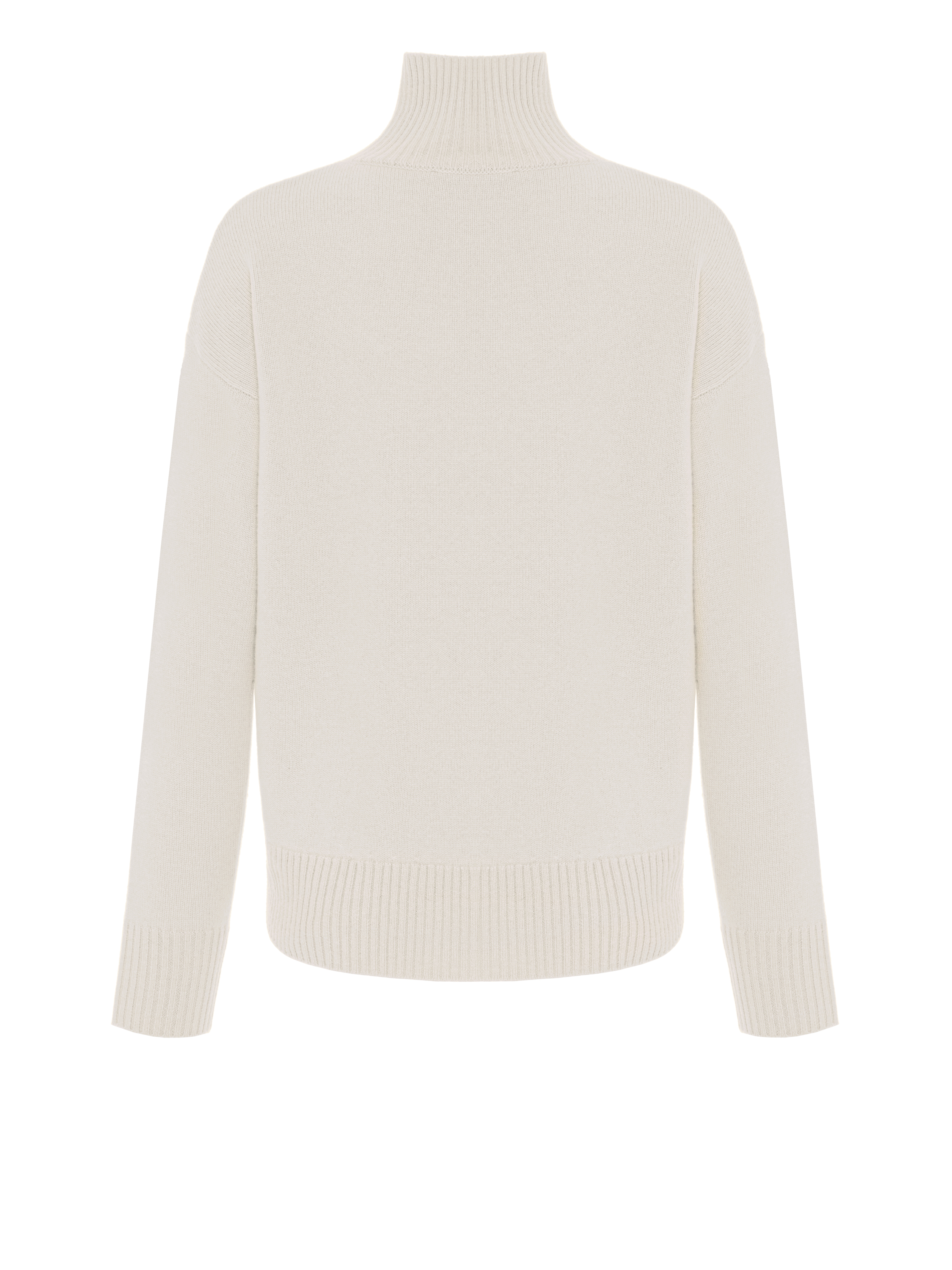A cozy high-neck white sweater is made of 100% premium-quality royal cashmere. The fine, silky, almost weightless yarn reliably retains warmth and maintains a comfortable microclimate while allowing the skin to breathe. The material is highly durable, does not wrinkle and does not lose its shape. The basic model is relevant for any wardrobe and suits all body types.
