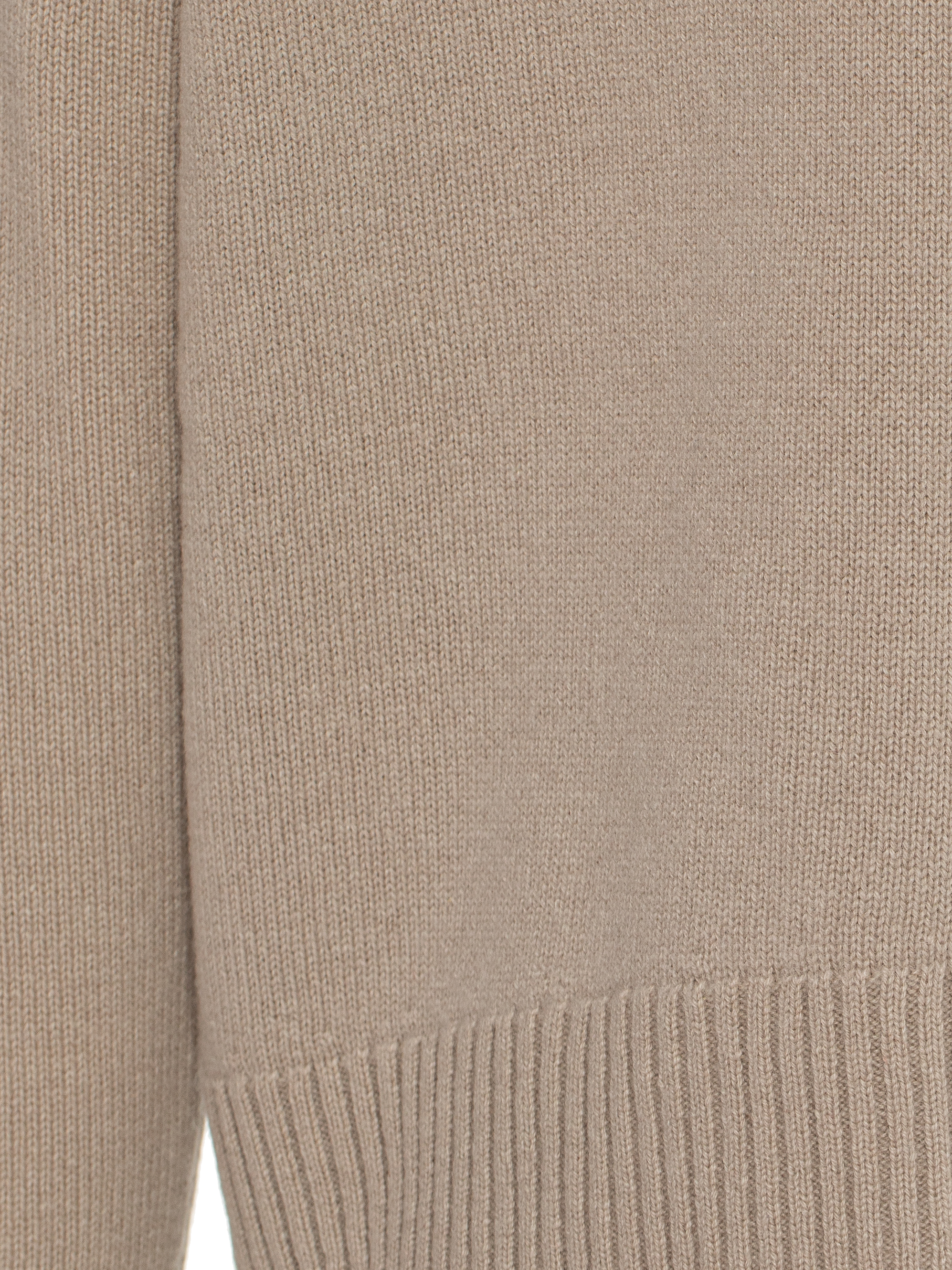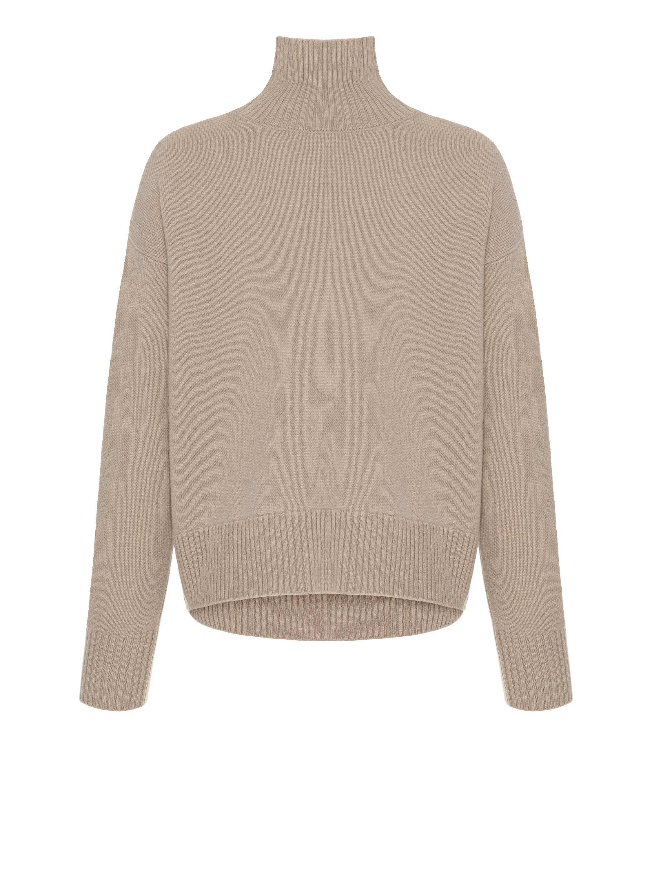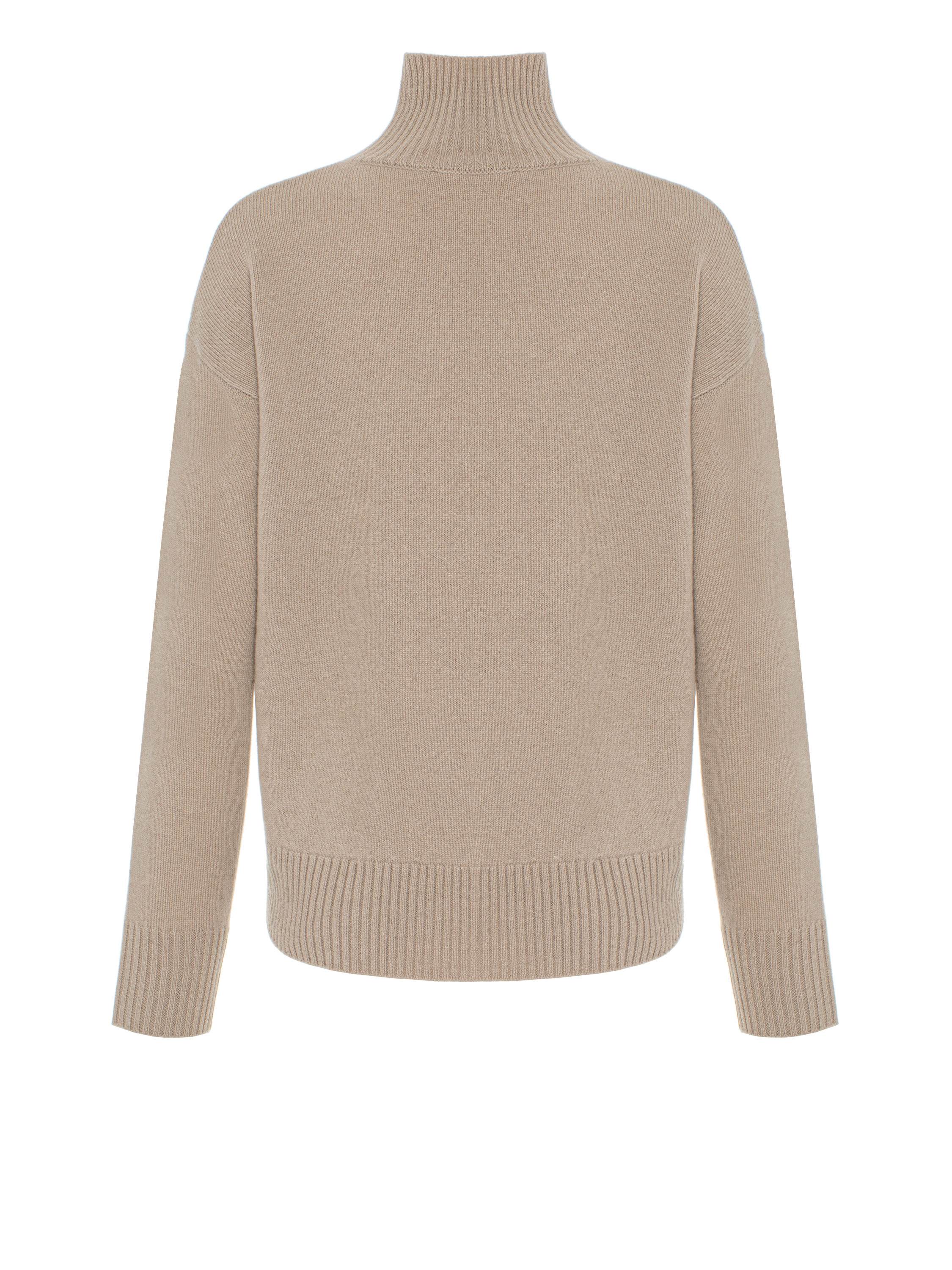 A cozy high-neck beige sweater is made of 100% premium-quality royal cashmere. The fine, silky, almost weightless yarn reliably retains warmth and maintains a comfortable microclimate while allowing the skin to breathe. The material is highly durable, does not wrinkle and does not lose its shape. The basic model is relevant for any wardrobe and suits all body types.